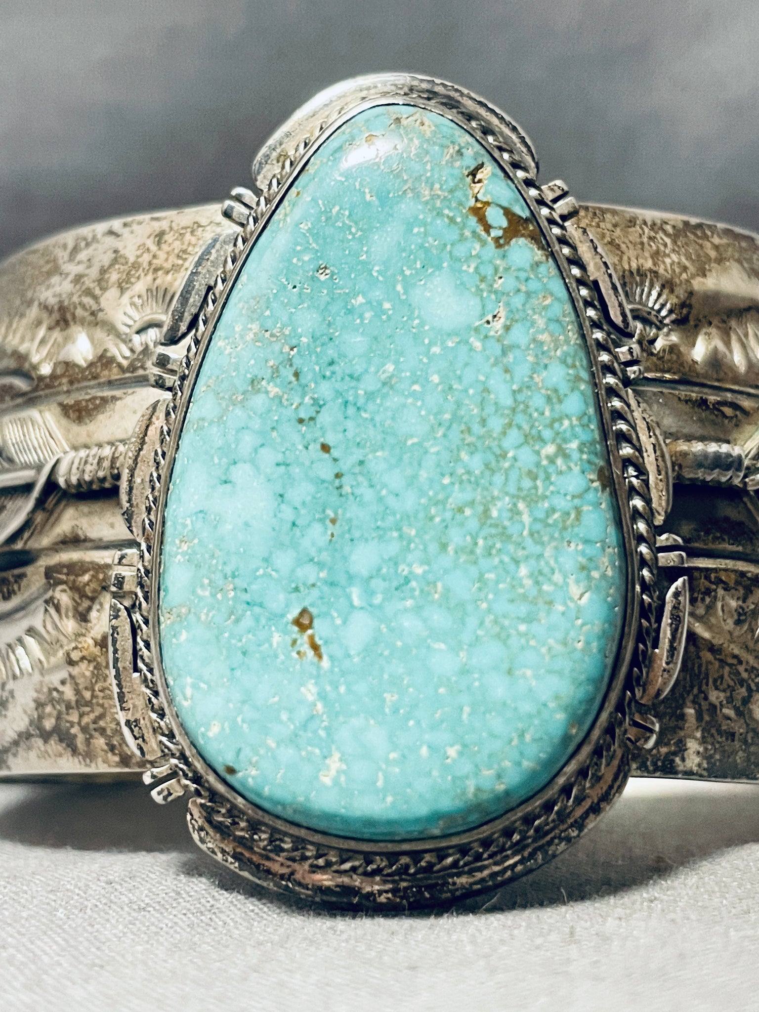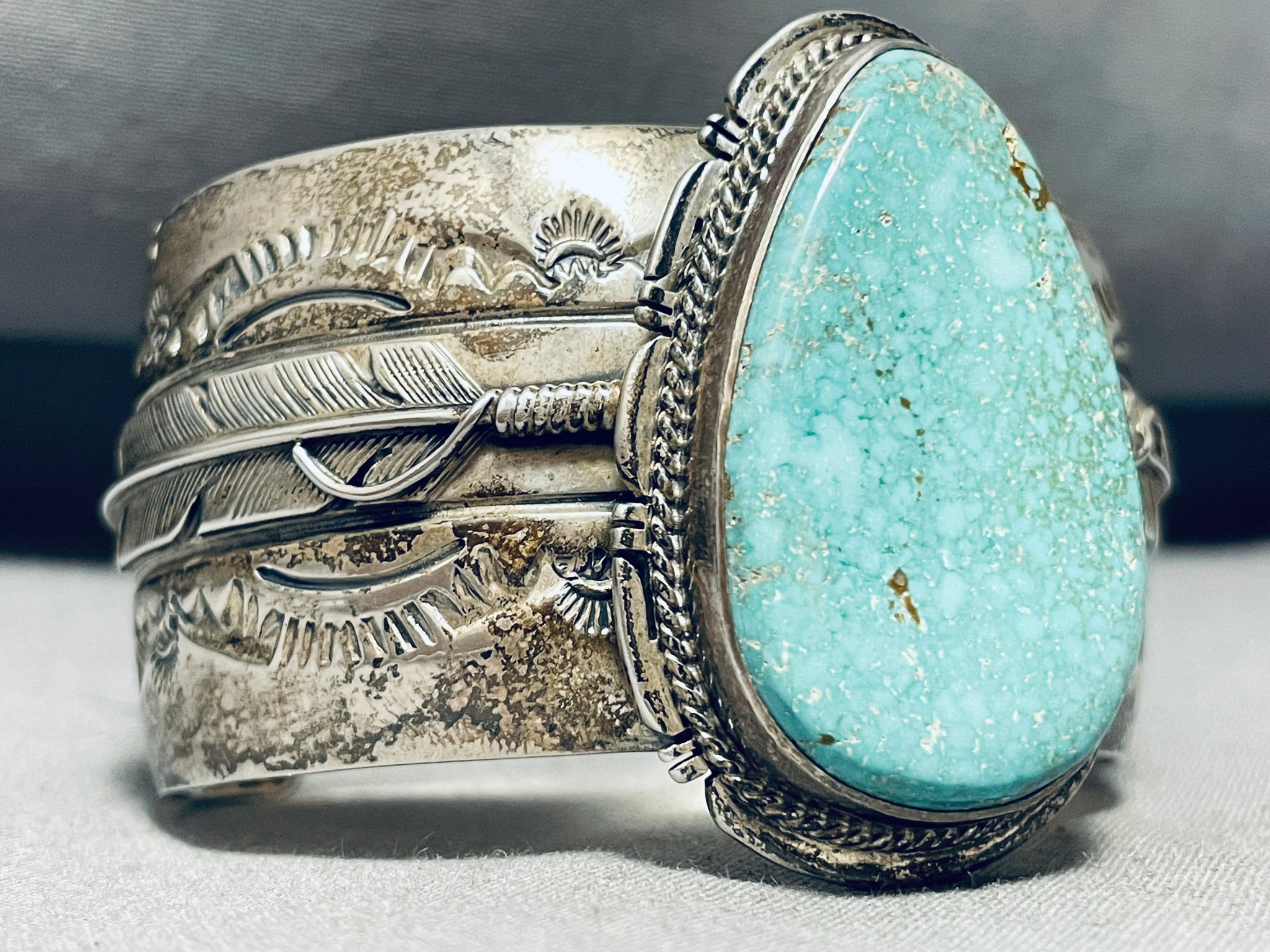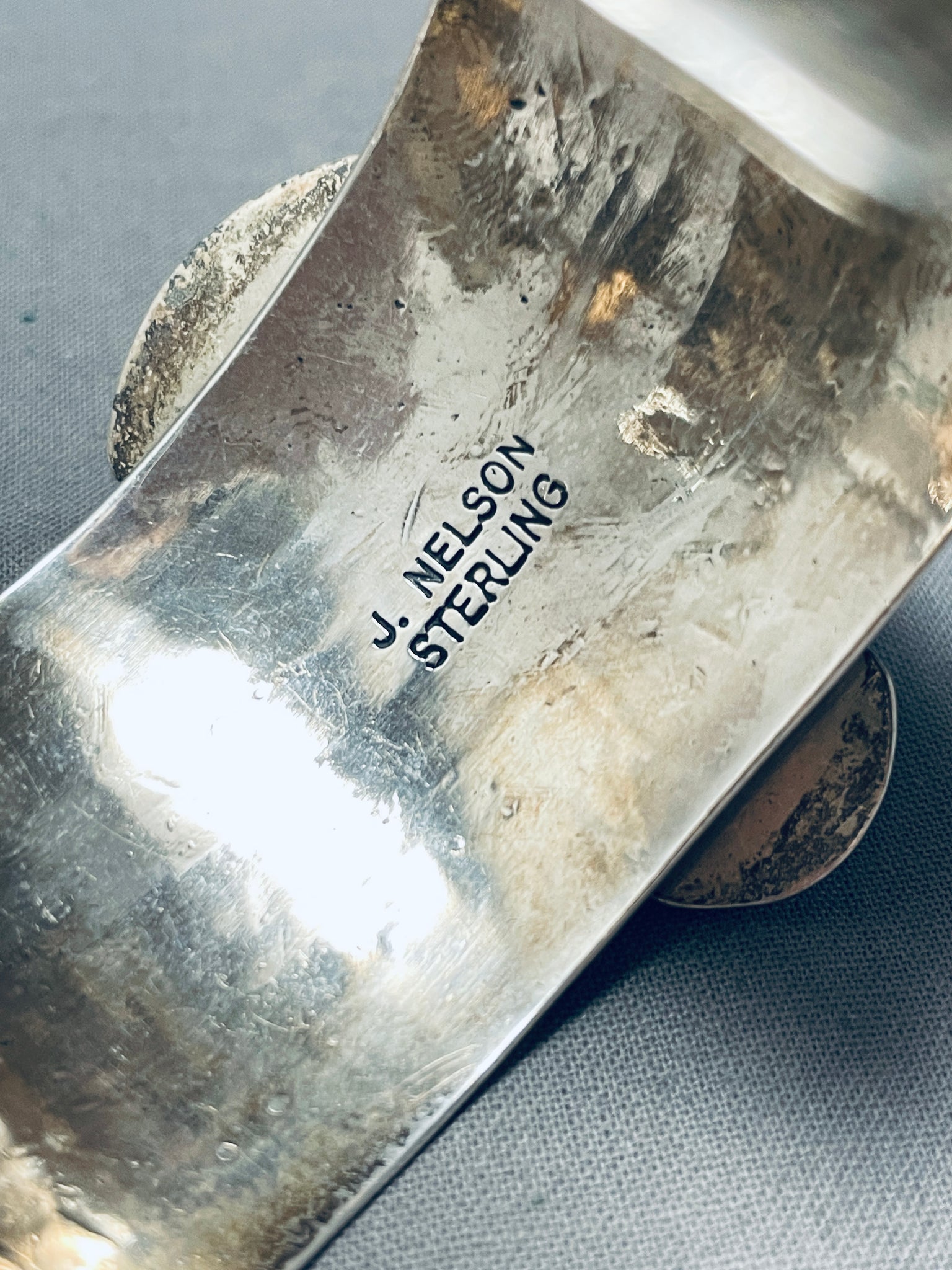 This is a magnificent vintage Navajo single stone silver cuff bracelet. This impeccable bracelet contains a large center egg shaped green colored turquoise stone with amazing spiderweb matrix. The stone appears to be from the fascinating Royston turquoise mine. Surrounding the stone are marvelous silver works that consist of a rope with accenting wave works and channel patterns. Running down both ends of the bracelet are phenomenal silver works that include sun stampings, wave works, and long detailed precise hand carved feathers. The feathers are absolutely astonishing and so beautiful. I absolutely love how thick and wide this bracelet is. The Royston Turquoise Mine is actually a collection of mines that produce a variety of turquoise stones with distinct characteristics. The turquoise from Royston can range in color from light blue to green, often with a brown or golden matrix running through it. This matrix is what gives Royston Turquoise its unique and recognizable appearance. Turquoise has been used for centuries in Native American jewelry and art, and Royston Turquoise is particularly valued for its beauty and versatility. It has been incorporated into various forms of jewelry, including rings, bracelets, necklaces, and earrings. The center stone measures around 1-1/2" x 1". The width of the bracelet measures around 1-3/4". Signed by Navajo artist, J. Nelson. Sterling silver, marked. Cir. 1970's+. The inside end to end measures around 5-1/2" with an additional 1-1/4" gap. Sturdy 79 grams.