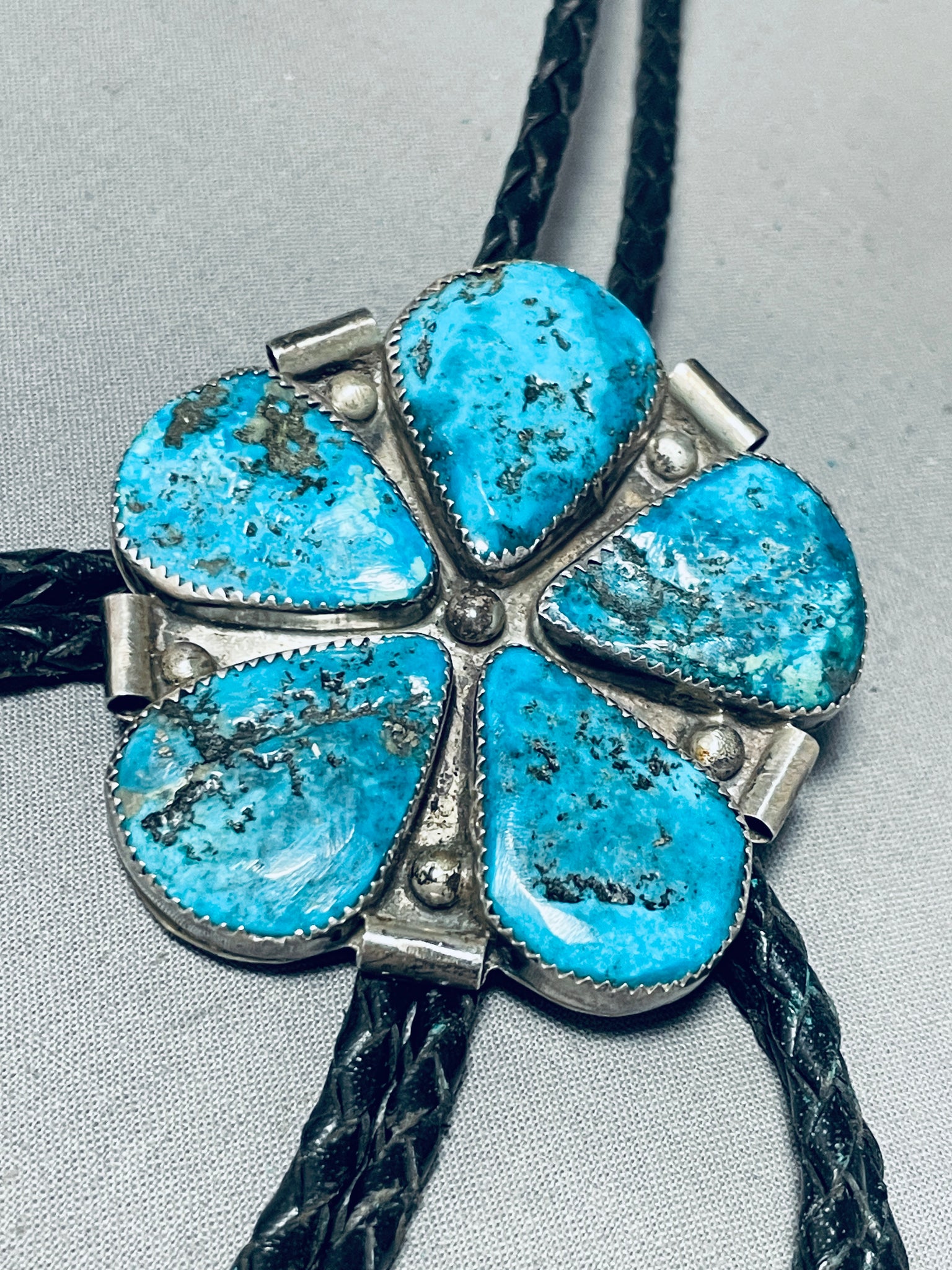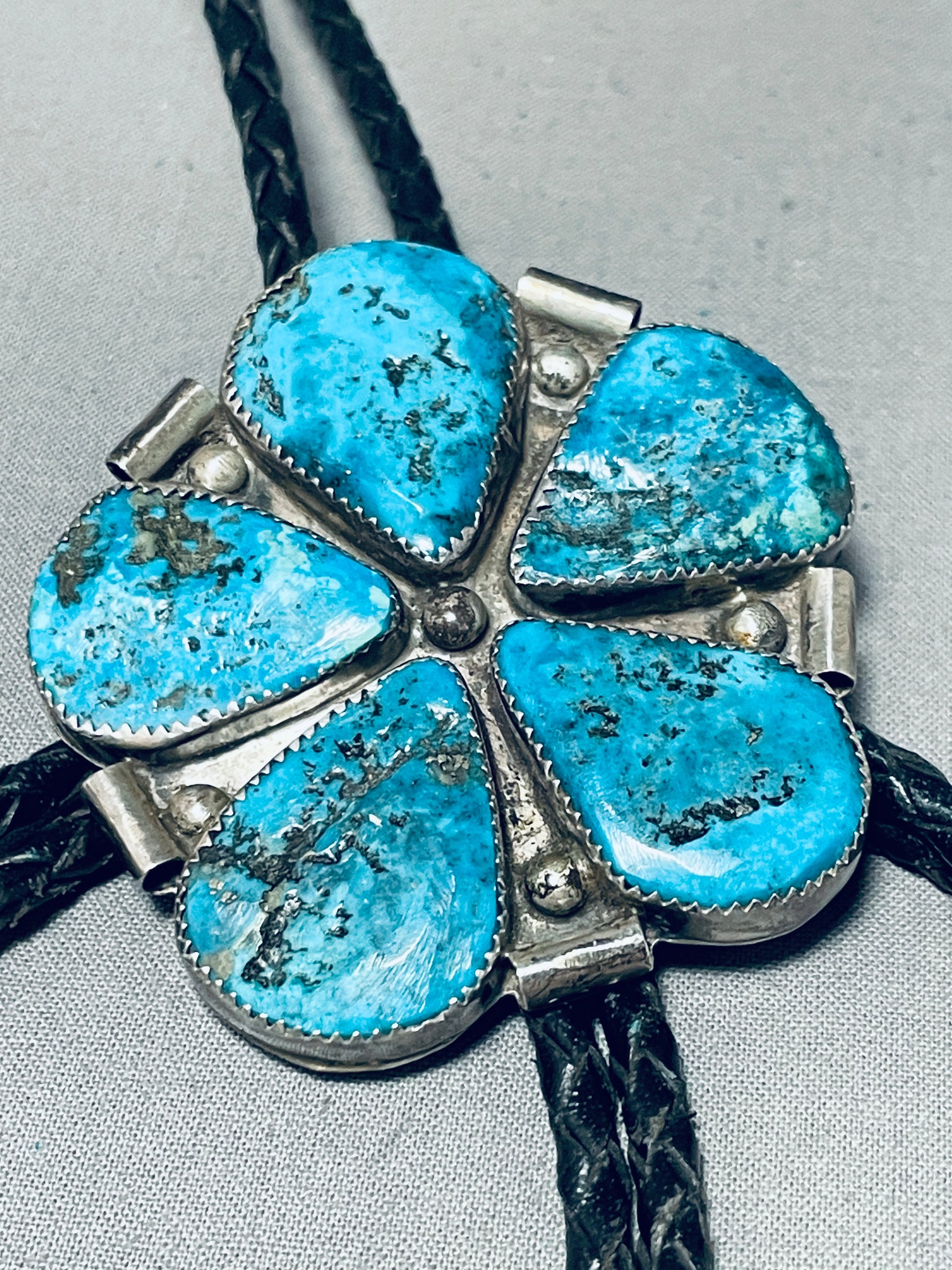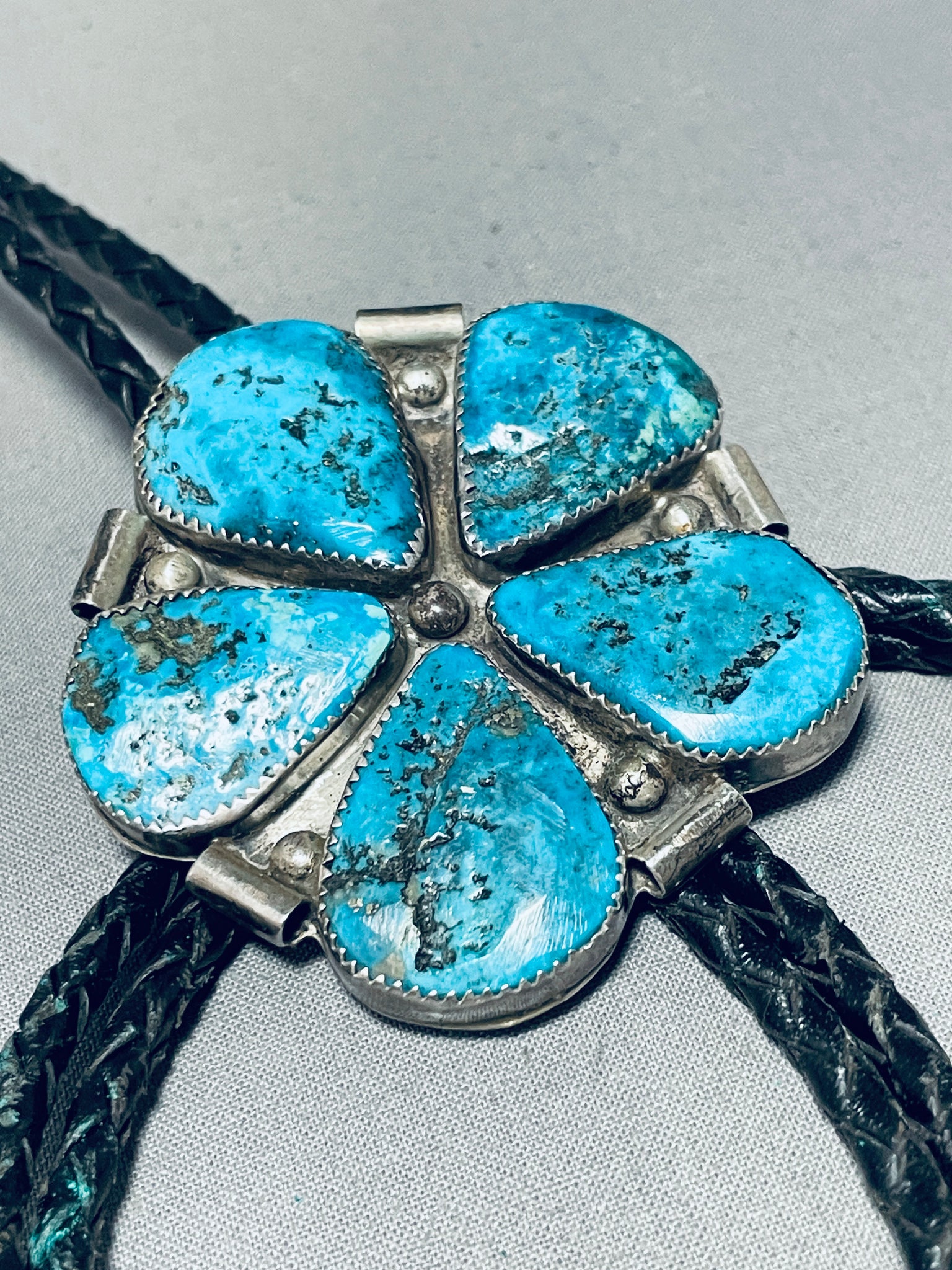 This is a striking vintage Navajo silver bolo featuring 5 large Morenci turquoise teardrops forming a floral design with silver beads and silver tubes! This unique bolo has a black leather braided tie with a handcarved silver rectangle accented with silver handstampings and silver pins with silver hogan bead tips! Absolutely Remarkable! Tie length is about 44".