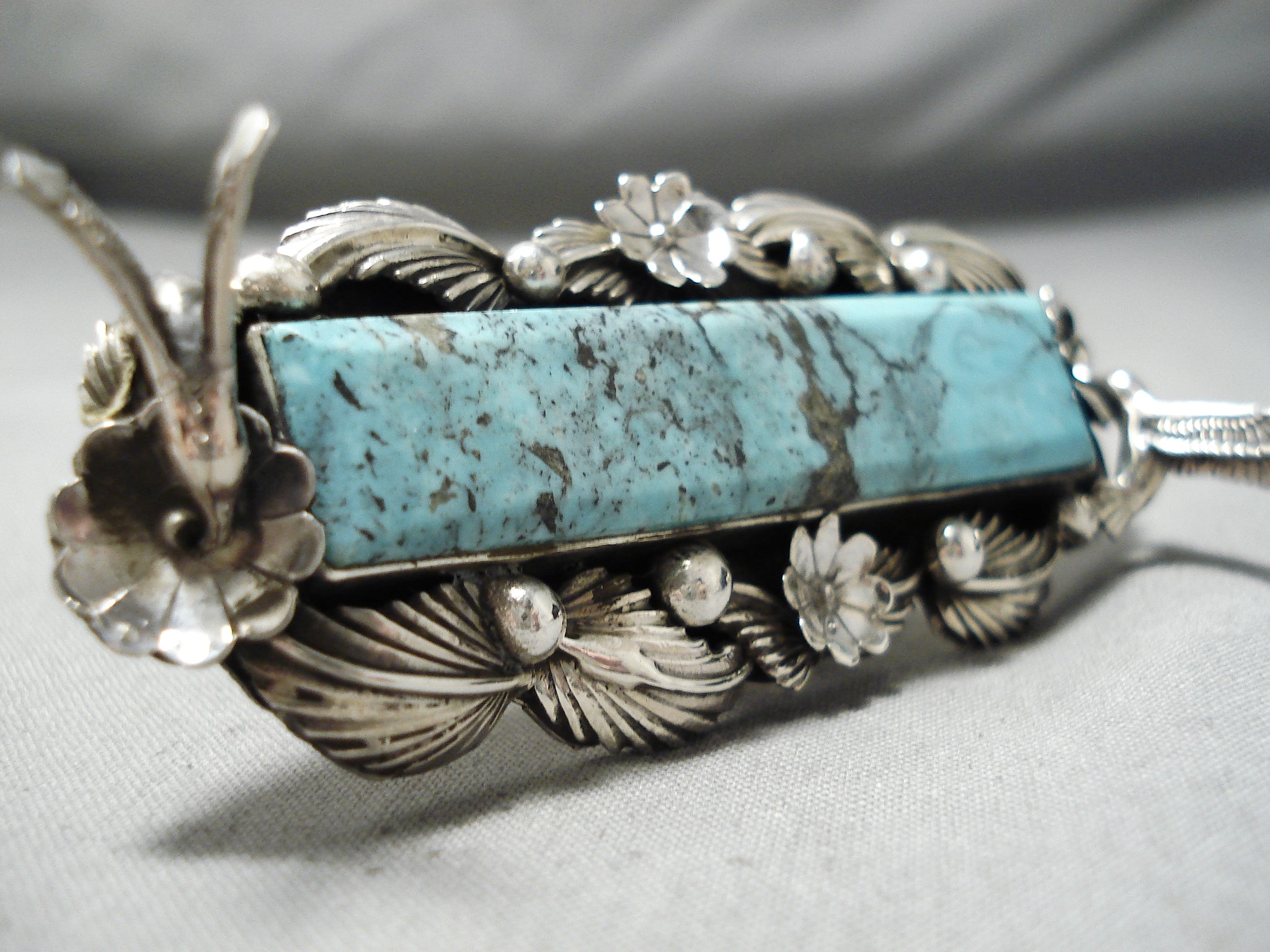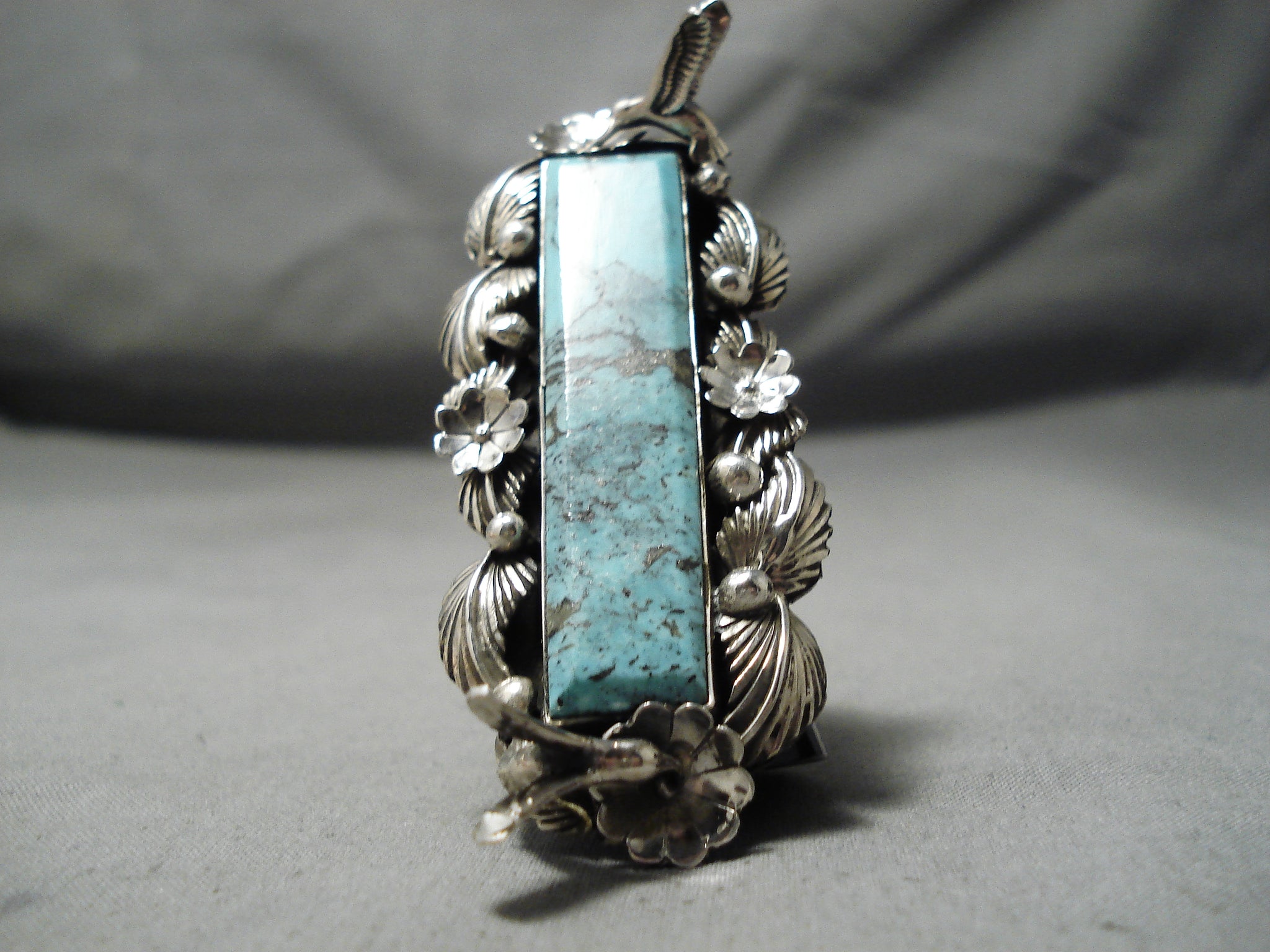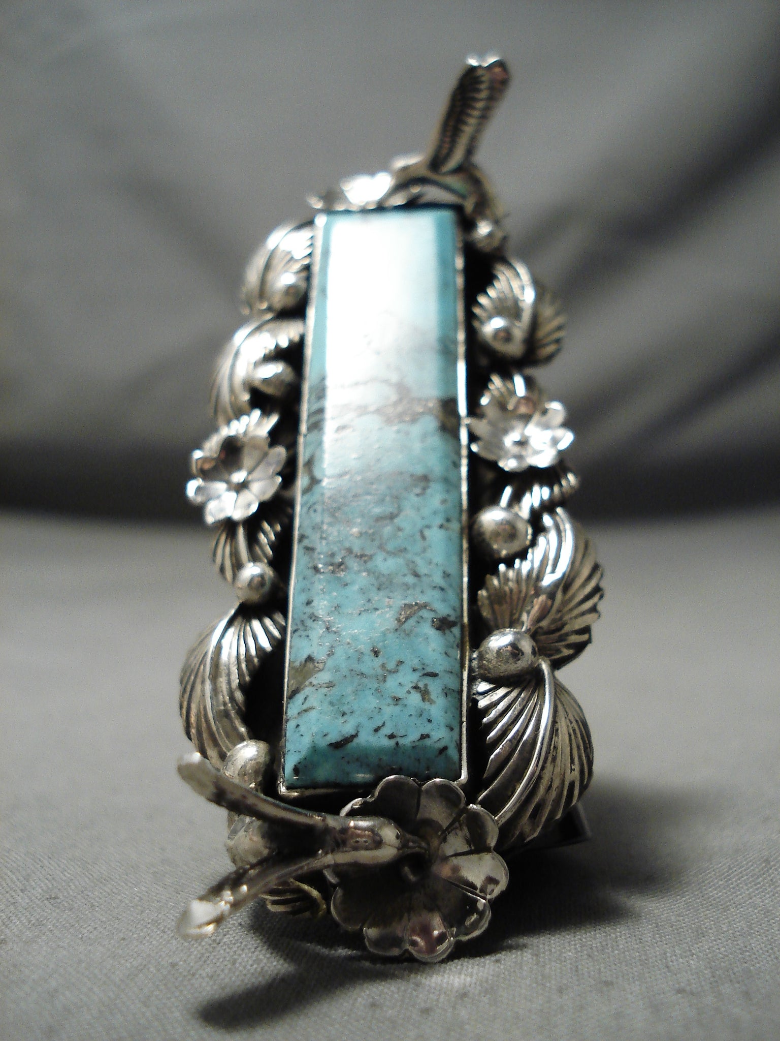 We are proud to offer this magnificent San Felipe silver ring having a huge Blue Diamond turquoise stone surrounded by handcarved silver leafs, silver beads, silver florals and 2 intricately handcarved silver 3-D hummingbirds on either end! The ring has a handcarved graduated triple silver rail band that reduces to a solid band! Truly Unique! The center stone measures around 2-3/8" x 1/2". The ring face measures around 3-1/4" x 1-1/4". San Felipe artist, Jake Francosa. The ring size is around 7. Sterling silver, marked. Sturdy 47 grams.