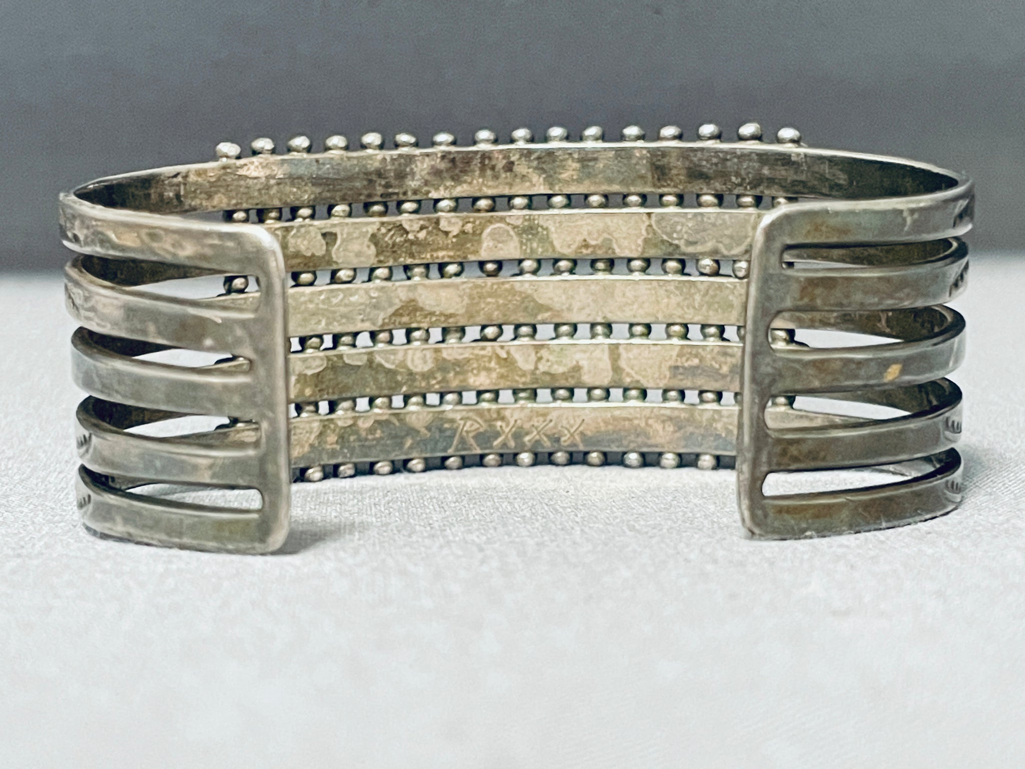 We are proud to offer this fabulous vintage Zuni silver bracelet. The 5 rows of 16 stones each are separated and accented with silver beads as they set one atop the other and as the ends of each row give way to the 5 rails of the cuff, creating one dynamic look! The width of the bracelet measures around 1-1/8". Sterling silver. The inside end to end measures around 5-3/4" with an additional 1-1/8" gap. Sturdy 46 grams.