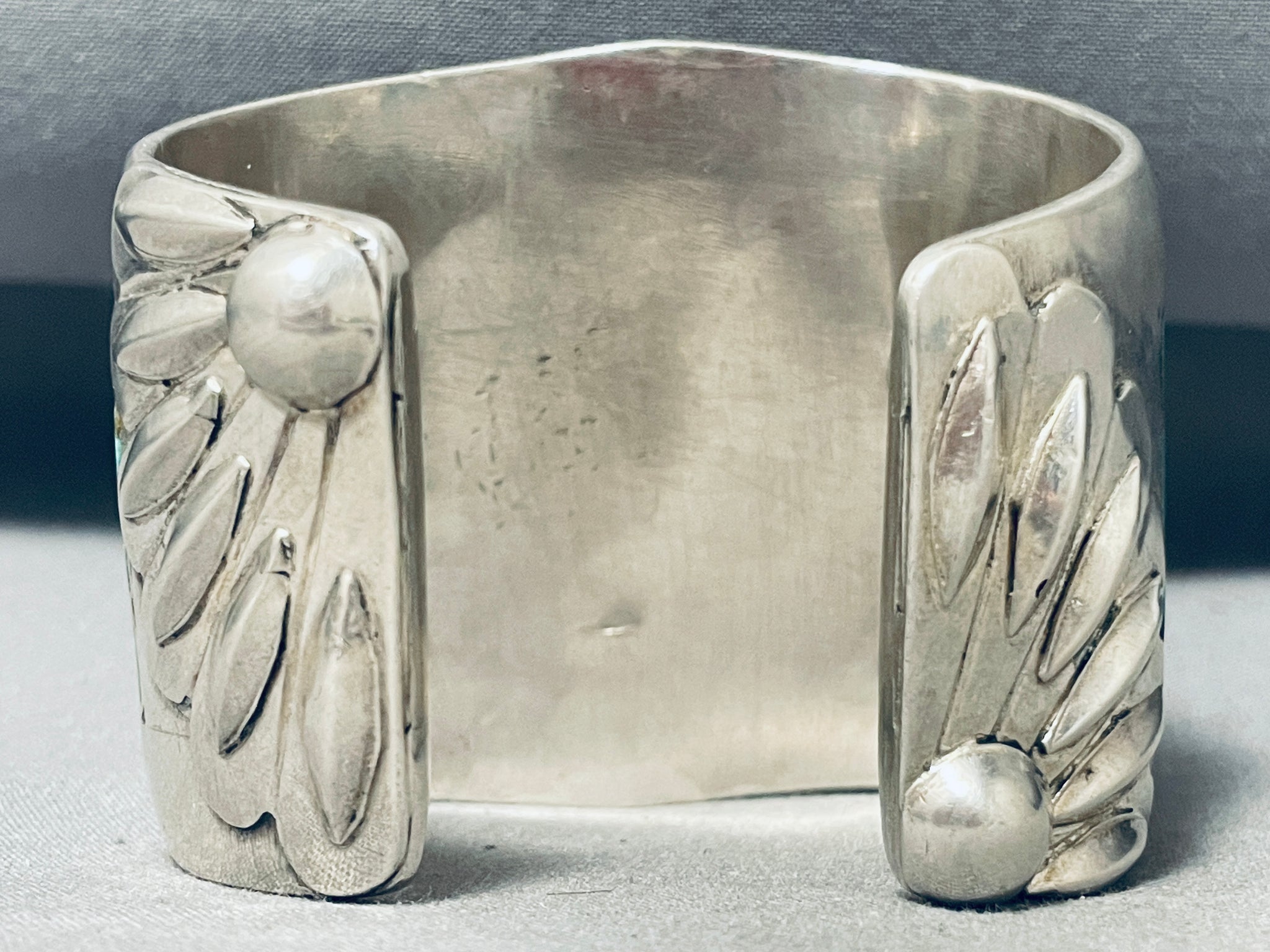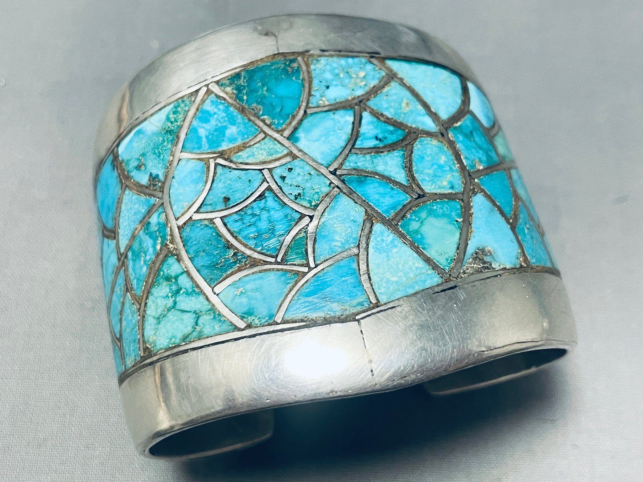 This is a museum quality vintage Navajo very wide thick and HEAVY inlaid turquoise silver cuff bracelet. This phenomenal bracelet contains a superior wave pattern of inlaid Royston and Number 8 turquoise stones. The cuff is very thick and sturdy and wonderfully graduates in width towards the center. Located at the ends of the cuff are fascinating large hand repoussed silver flanks with large accenting round silver beads. Navajo inlaid bracelets are a type of jewelry that is intricately crafted by Navajo artisans. The Navajo people are Native Americans who reside primarily in the southwestern United States, particularly in the states of Arizona, New Mexico, and Utah. They are renowned for their exceptional skills in creating silver and turquoise jewelry, including inlaid bracelets. Inlaid bracelets feature a technique where small pieces of stone or other materials are carefully set into a metal base, usually silver. The stones are precisely cut and shaped to fit together seamlessly, creating a beautiful mosaic-like design. Traditionally, Navajo inlaid bracelets incorporate turquoise, coral, mother-of-pearl, and various types of shells. However, contemporary pieces may also include other gemstones like lapis lazuli, malachite, or onyx. The process of making Navajo inlaid bracelets involves several steps. First, the artisan creates a silver base for the bracelet, often using the overlay or channel technique. The base is then meticulously filed, sanded, and polished to achieve a smooth surface. Next, the artist carefully cuts and shapes the stones to fit the desired pattern. The stones are then set into the channels or recesses of the silver base, secured using adhesive or by hammering the metal edges to hold them in place. Finally, the entire piece is polished and finished to enhance its beauty. Navajo inlaid bracelets are highly regarded for their craftsmanship, intricate designs, and vibrant colors. They are often characterized by geometric patterns, intricate motifs, or symbols inspired by Navajo culture and nature. These bracelets are not only valued as beautiful pieces of jewelry but also as expressions of Navajo art and cultural heritage. The width of the bracelet measures around 2-1/4". Sterling silver. Cir. Mid century . The inside end to end measures around 5-3/4" with an additional 1" gap. Sturdy 161 grams.