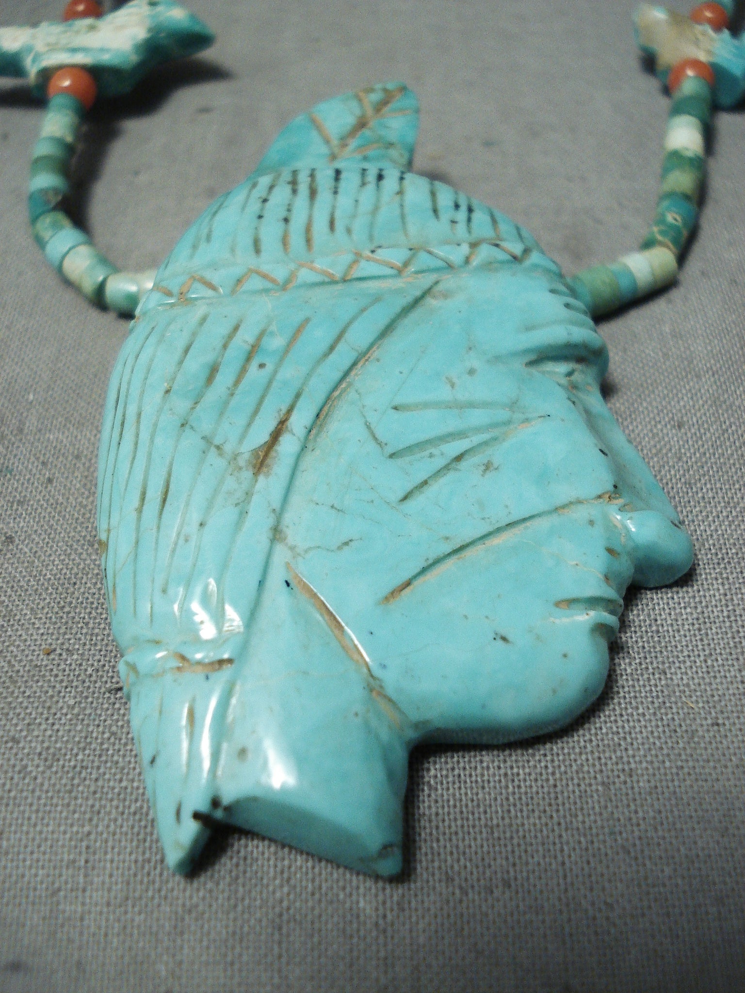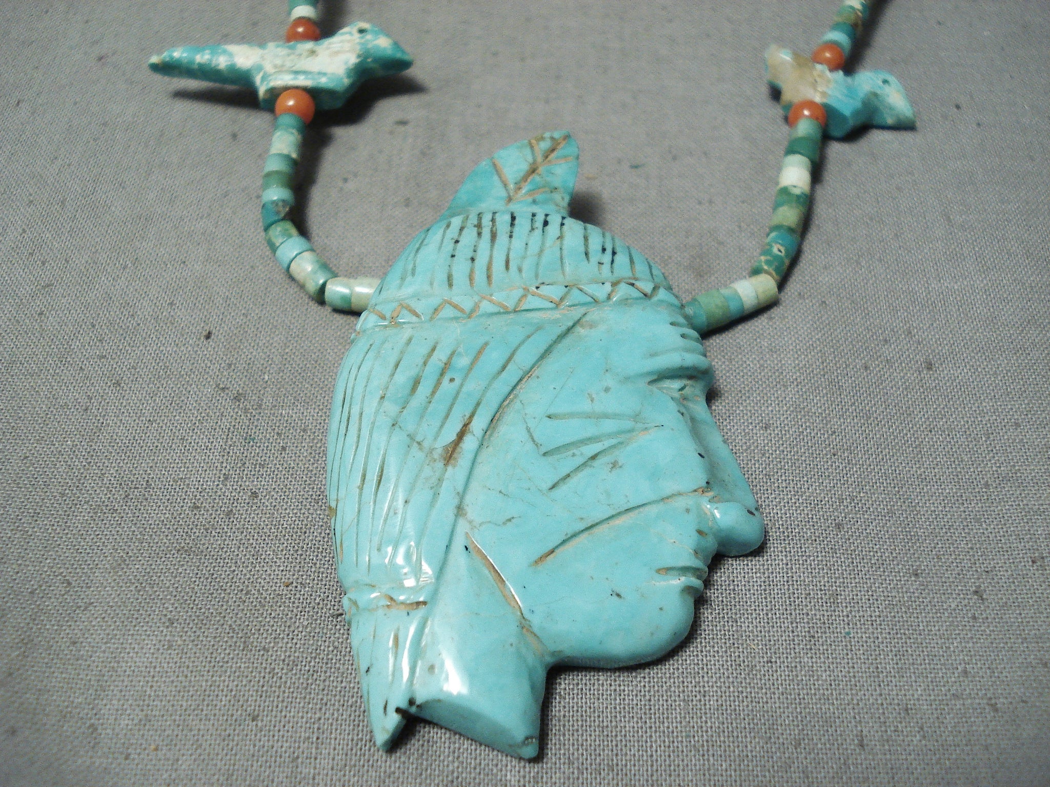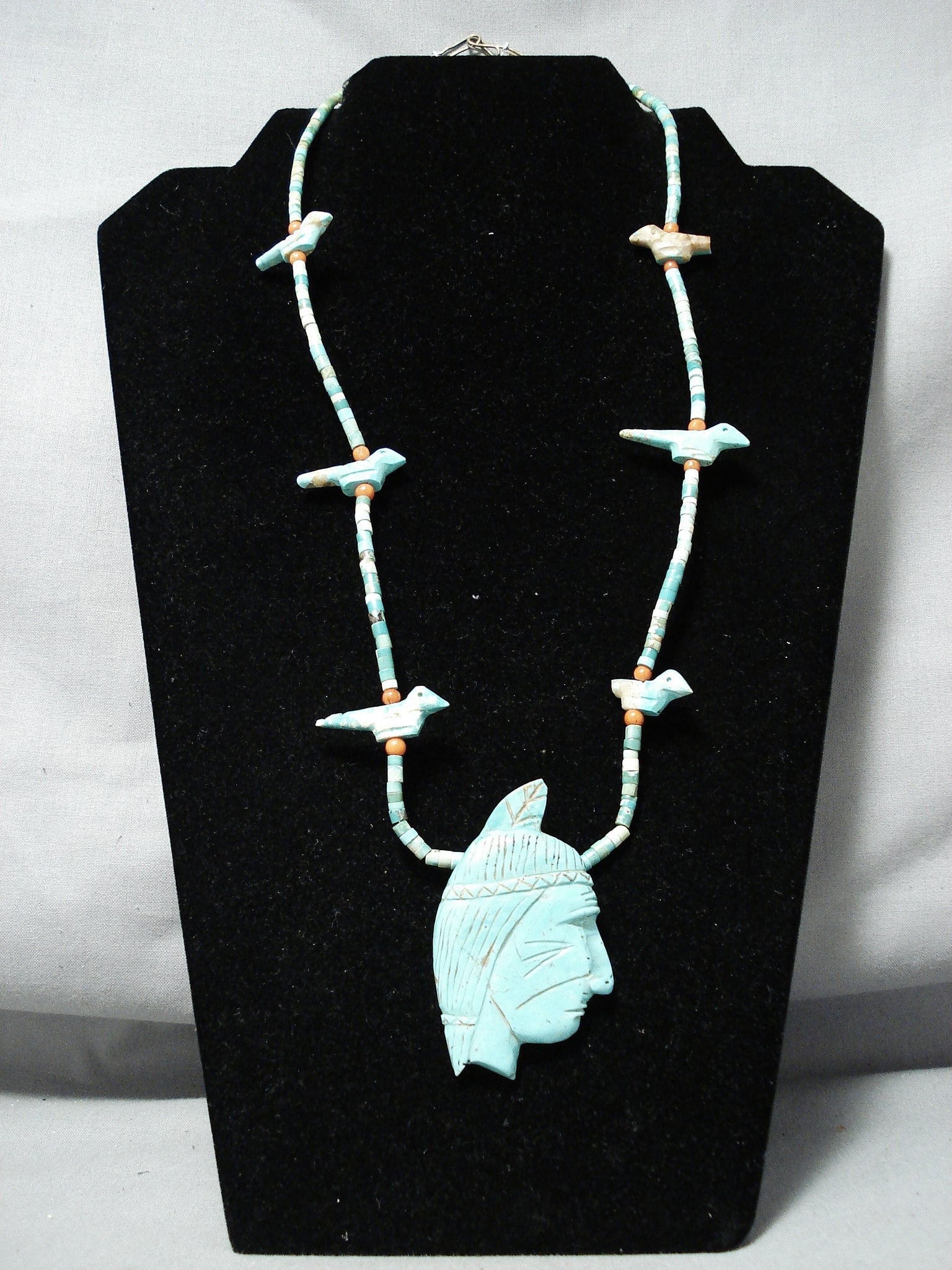 This is an incredible vintageSanto Domingo/ Navajo turquoise necklace. This incredibly hand carved necklace consists of a large hand carved turquoise pendant along with 6 extra hand carved turquoise pieces situated throughout. The large pendant at the bottom is wonderfully hand carved into a superior Native man head. Then the hand carved turquoise stones situated throughout the rest of the necklace are of incredible birds. The large bottom pendant measures around 2-1/2" X 1-1/2". Situated throughout the rest of the necklace are phenomenal hand cut turquoise heishi stones with accenting rounded coral stones and a traditional silver clasp. The turquoise on this piece appears to be from both the Royston and and old Sleeping Beauty turquoise mines. Cir. Mid century . The length of the necklace measures around 25". Sturdy 34 grams.