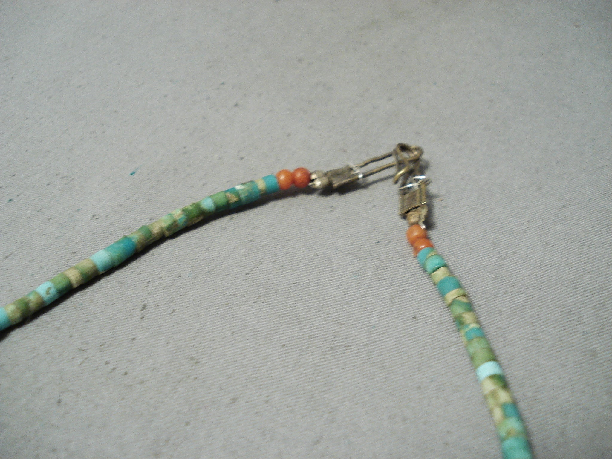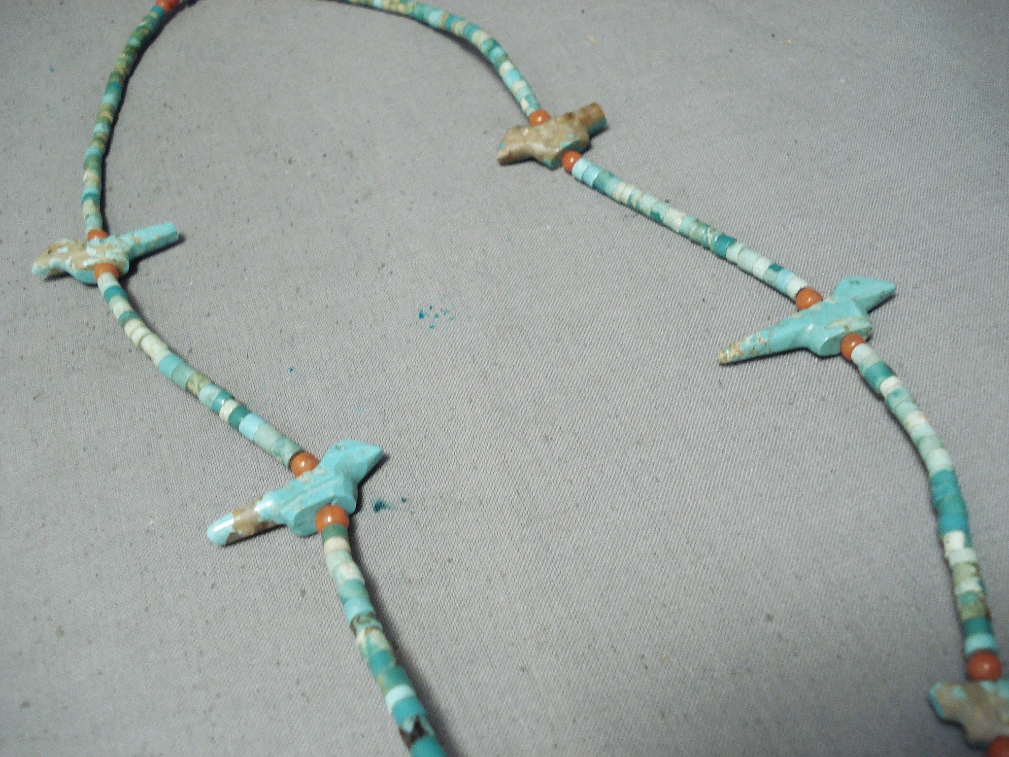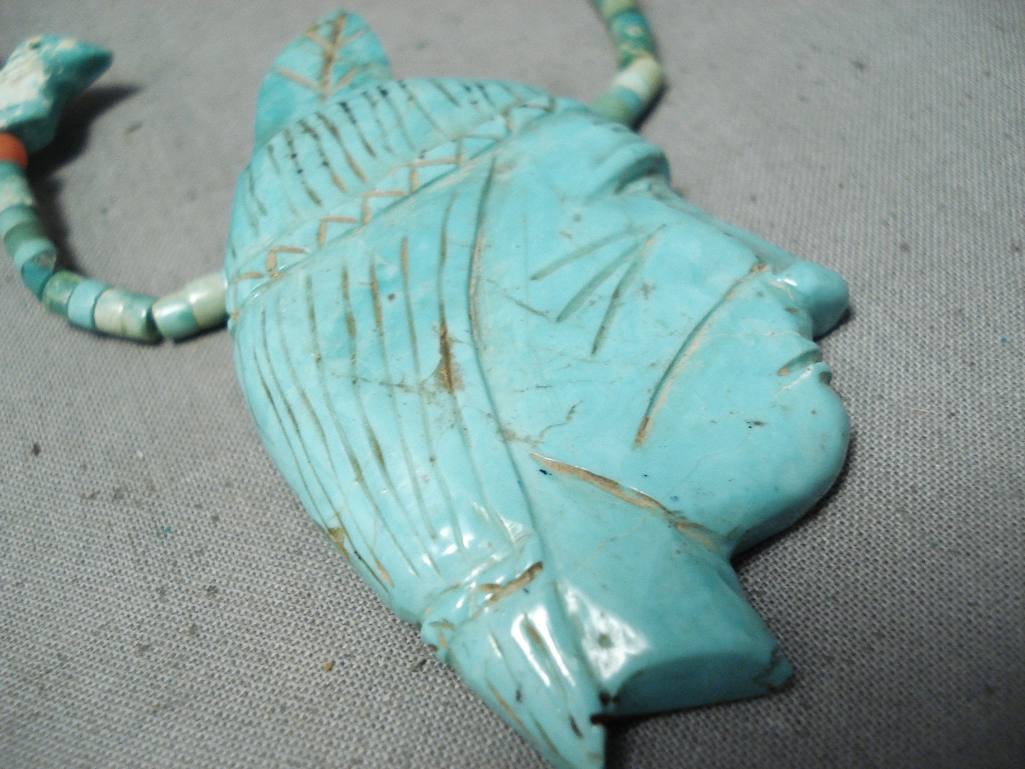 This is an incredible vintageSanto Domingo/ Navajo turquoise necklace. This incredibly hand carved necklace consists of a large hand carved turquoise pendant along with 6 extra hand carved turquoise pieces situated throughout. The large pendant at the bottom is wonderfully hand carved into a superior Native man head. Then the hand carved turquoise stones situated throughout the rest of the necklace are of incredible birds. The large bottom pendant measures around 2-1/2" X 1-1/2". Situated throughout the rest of the necklace are phenomenal hand cut turquoise heishi stones with accenting rounded coral stones and a traditional silver clasp. The turquoise on this piece appears to be from both the Royston and and old Sleeping Beauty turquoise mines. Cir. Mid century . The length of the necklace measures around 25". Sturdy 34 grams.