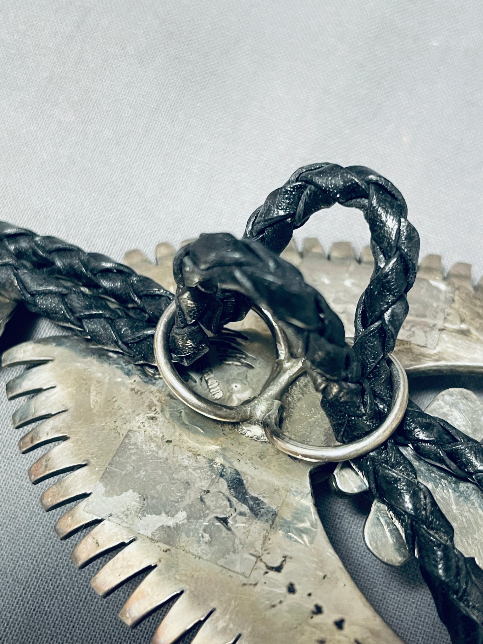 We are proud to offer this museum quality Navajo silver bolo having a large intricately handcarved silver kachina with a Kingman turquoise oval pendant, a handbraided leather tie and handcarved silver pins! Truly Incredible! The turquoise stone measures about 3/4" x 1/2" and the tie length is around 38". Signed by Navajo artist, Nelson Morton. Sterling silver. The bolo measures around 4" x 2-3/8". Sturdy 50 grams.