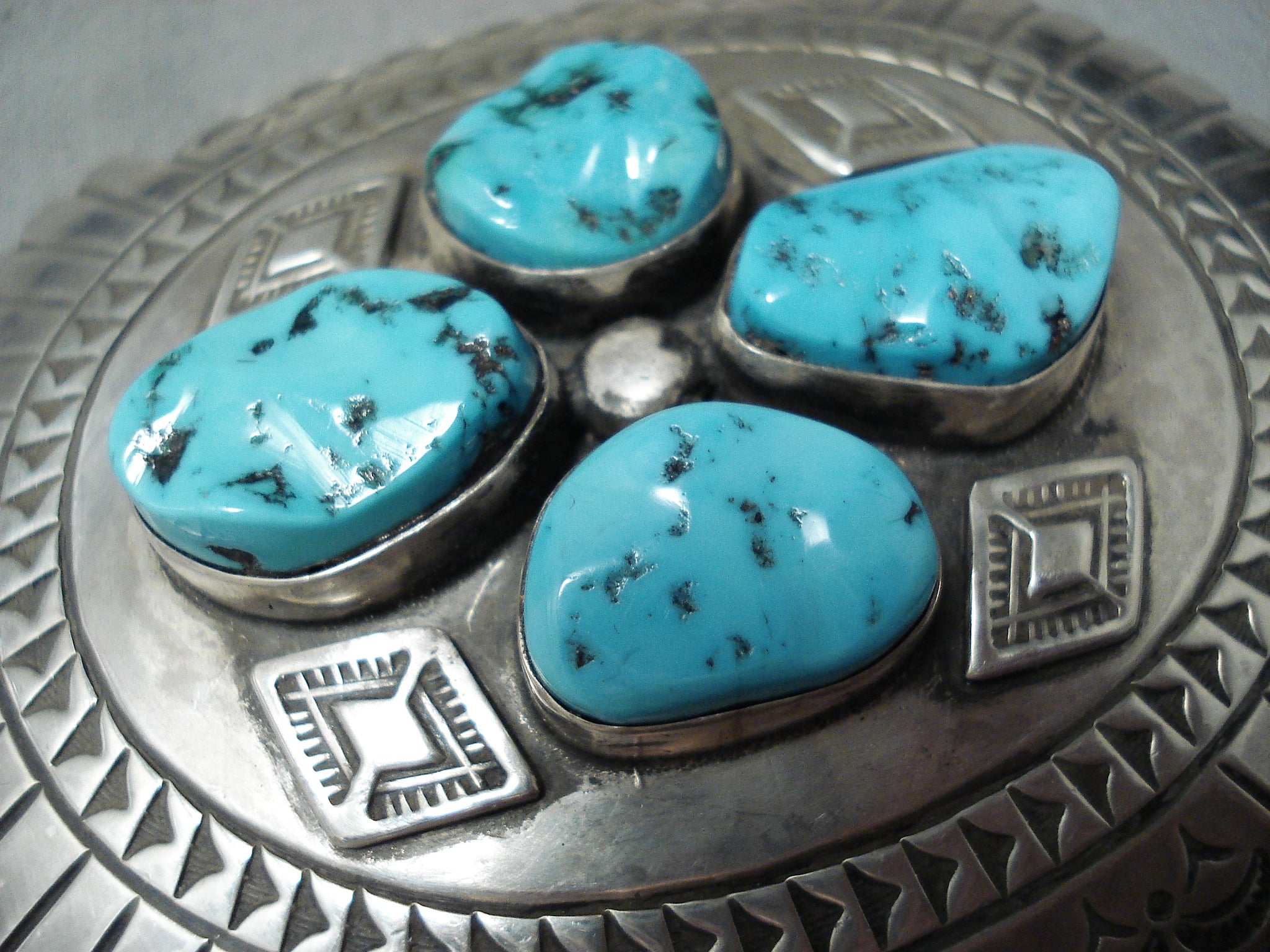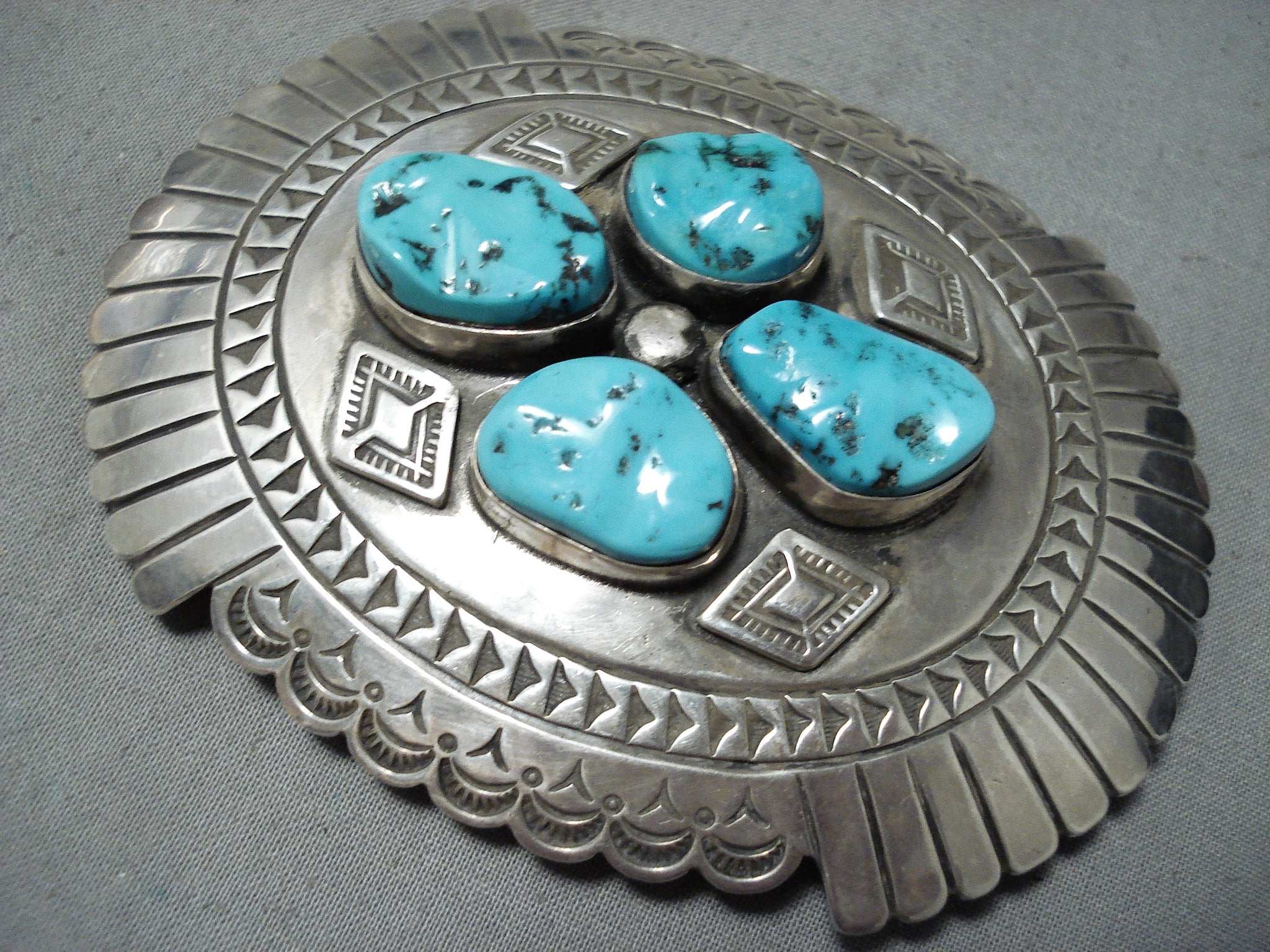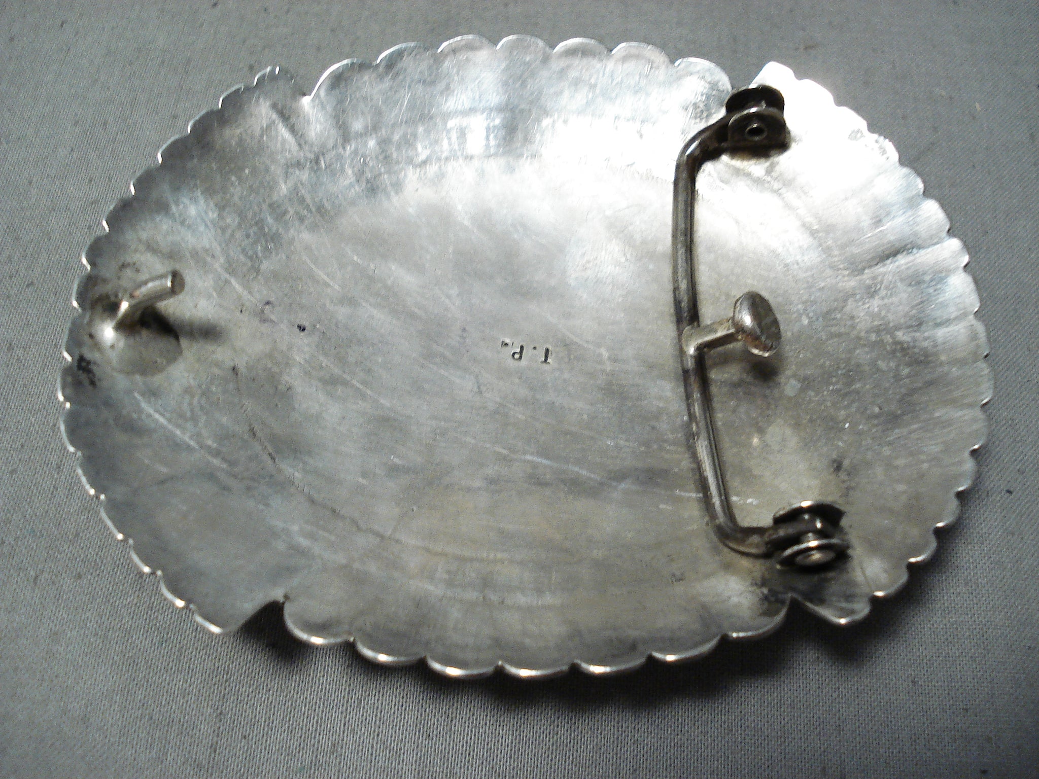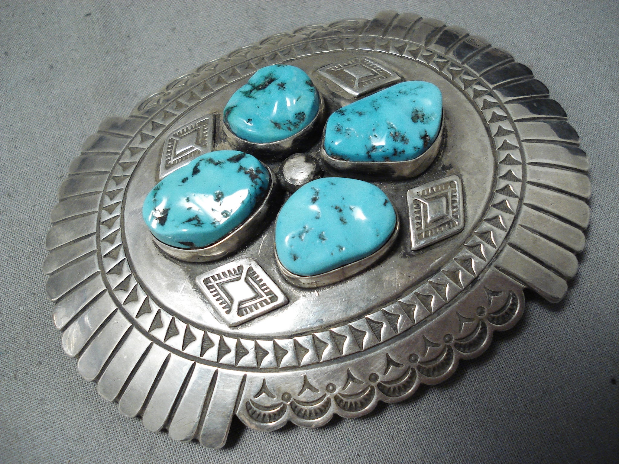 Up for sale is this fabulous vintage Navajo oval silver buckle having 4 huge Sleeping Beauty stones, a large silver bead center, silver handcarvings, silver handstampings and handcarved scalloped silver borders! Absolutely Amazing Piece! The belt width is about 1-3/4". The largest stone measures around 3/4" x 1/2". Sterling silver. Signed by Navajo artist, Tom Platero. The buckle measures around 3-7/8" x 2-5/8". Sturdy 87 grams.