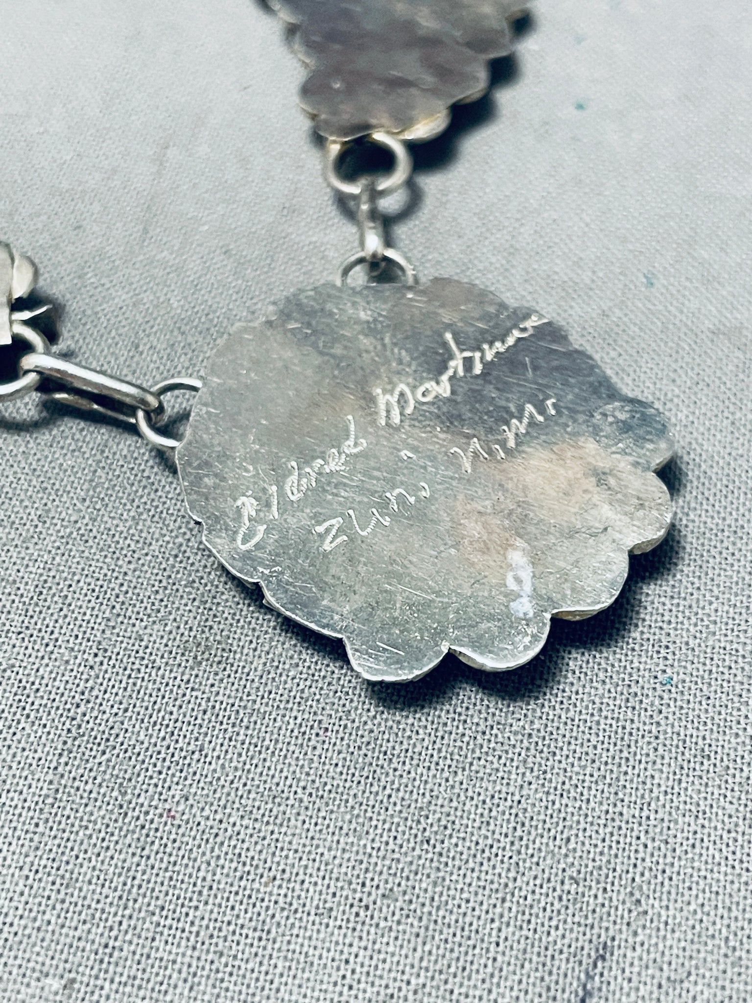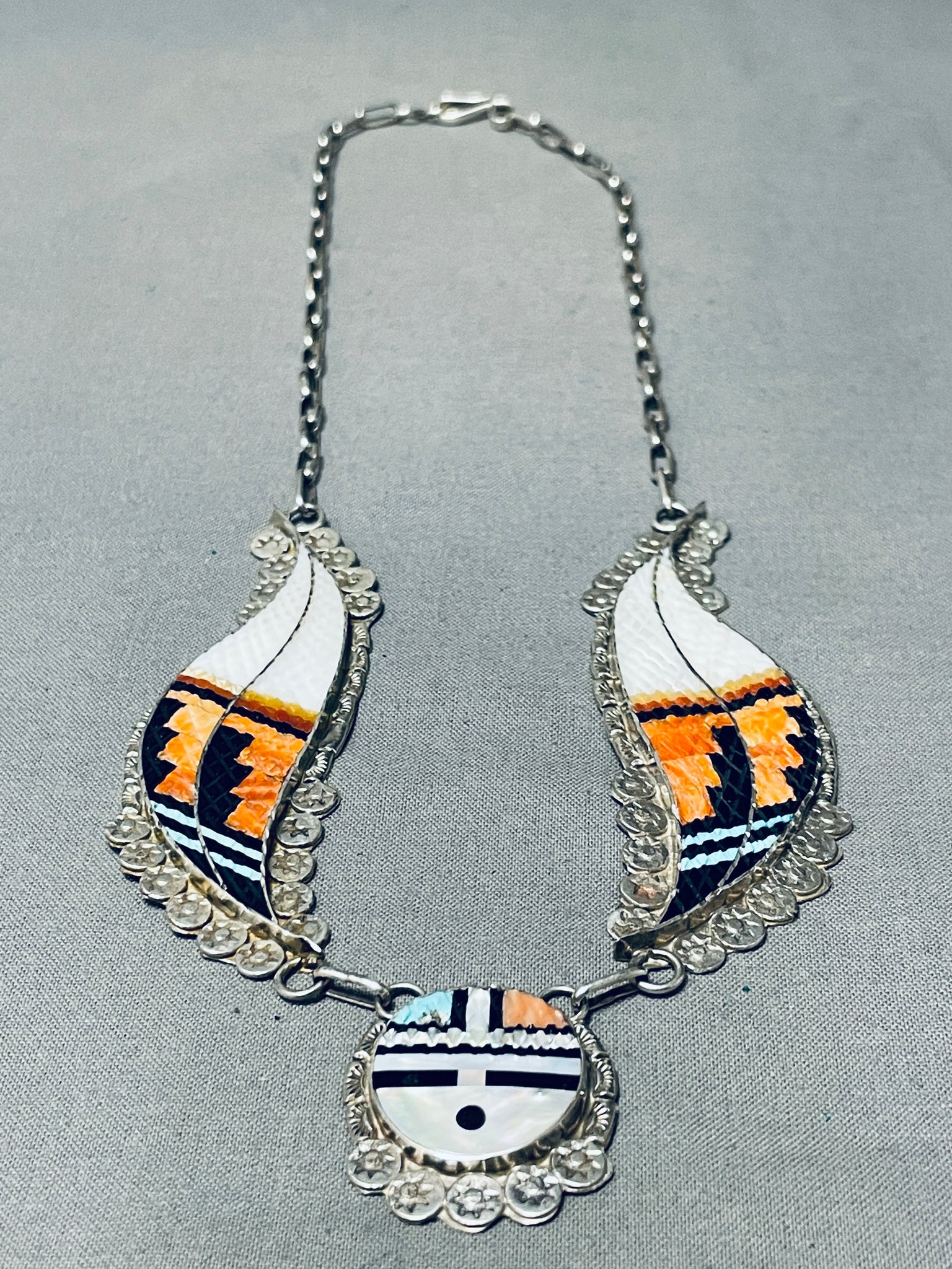 This is an exceptional vintage Zuni inlaid Corn Maiden feather style silver necklace handmade by the famous artist, Eldred Martinez. Eldred is known for her impeccable hand inlaid and hand carved stone and shell workmanship. The inlay work on her pieces are usually hand carved with diamond patterns giving her pieces more character and detailing. This necklace contains a bottom inlaid Corn Maiden with two accenting large detailed inlaid silver feather patterns. The inlay includes mother of pearl, onyx, orange spiny oyster shell, turquoise and coral. Surrounding the inlaid sections are wonderful flattened silver shells and sun stampings. This necklace contains a wonderful handmade silver link chain with a traditional silver clasp. The bottom Corn Maiden measures around 1-1/8" in diameter while each feather measures around 3-1/2" X 1". Sterling silver. Cir. 1970's+. Signed by Zuni artist, Eldred Martinez. The length of the necklace measures around 21". Sturdy 39 grams.