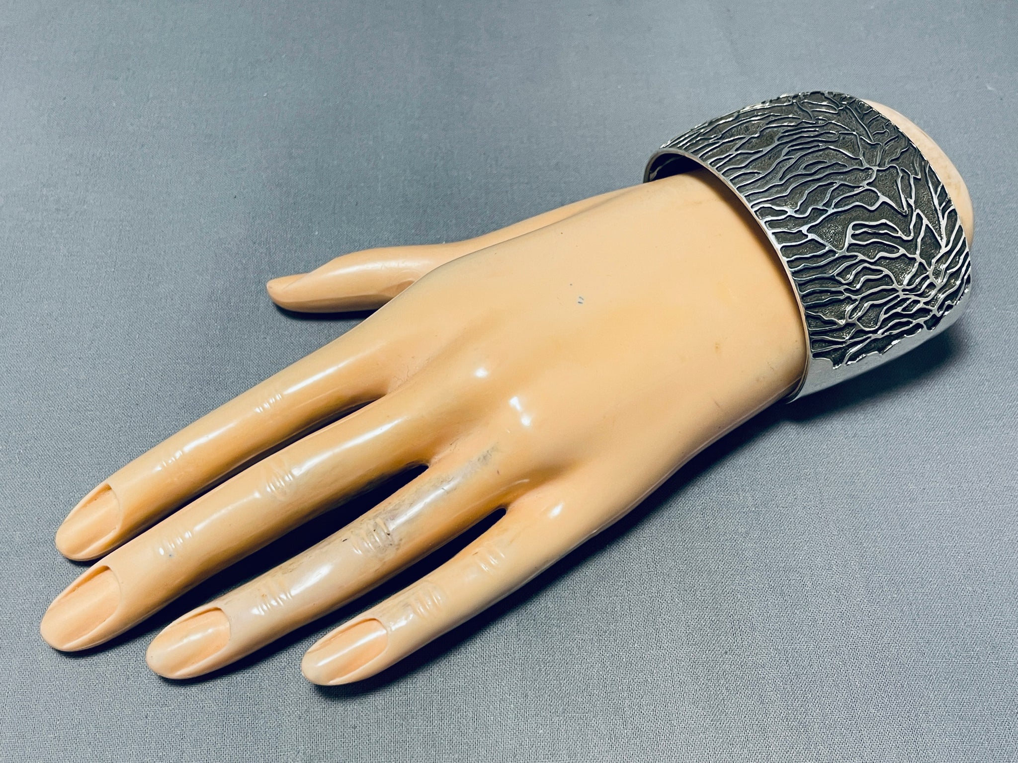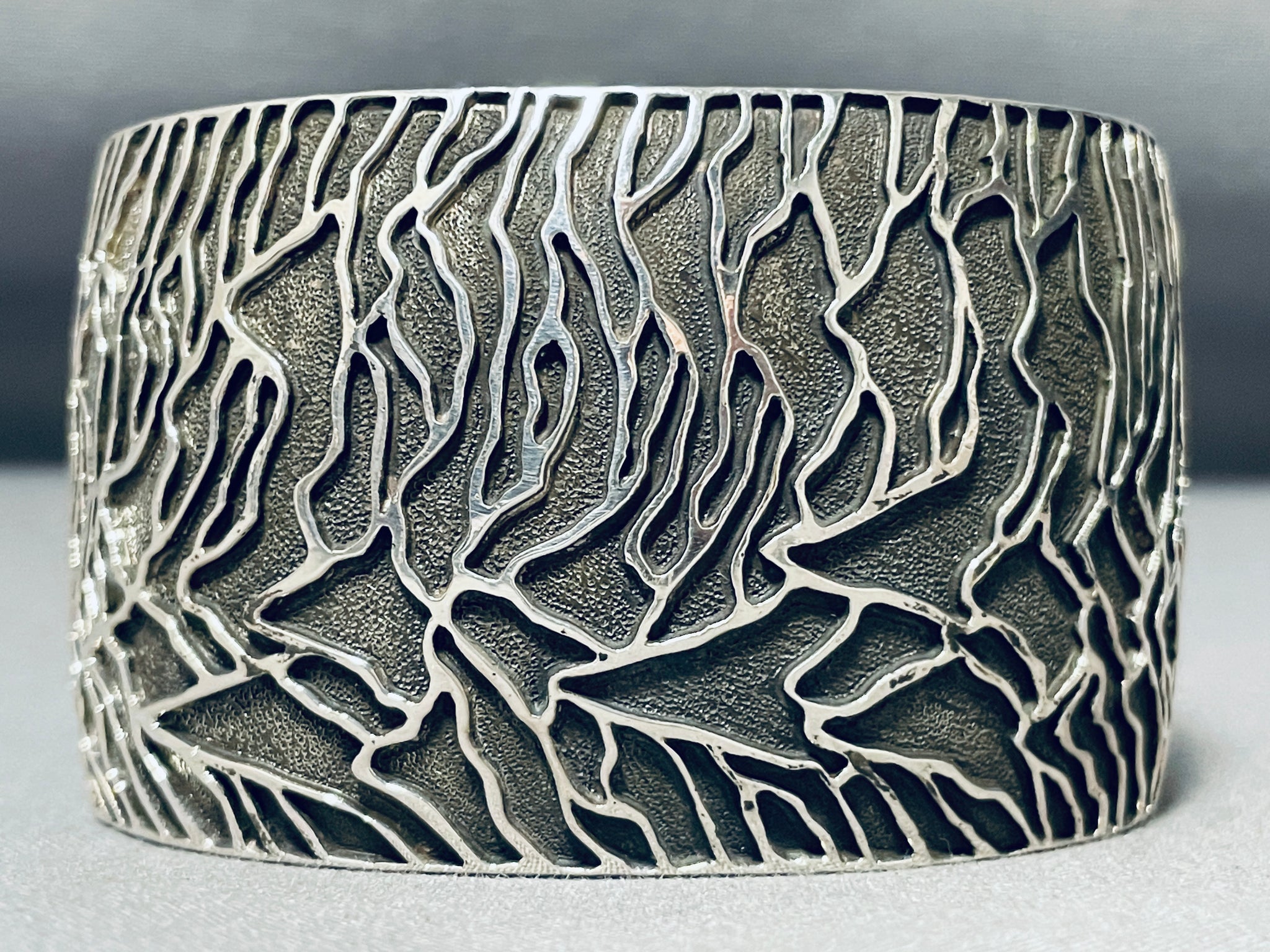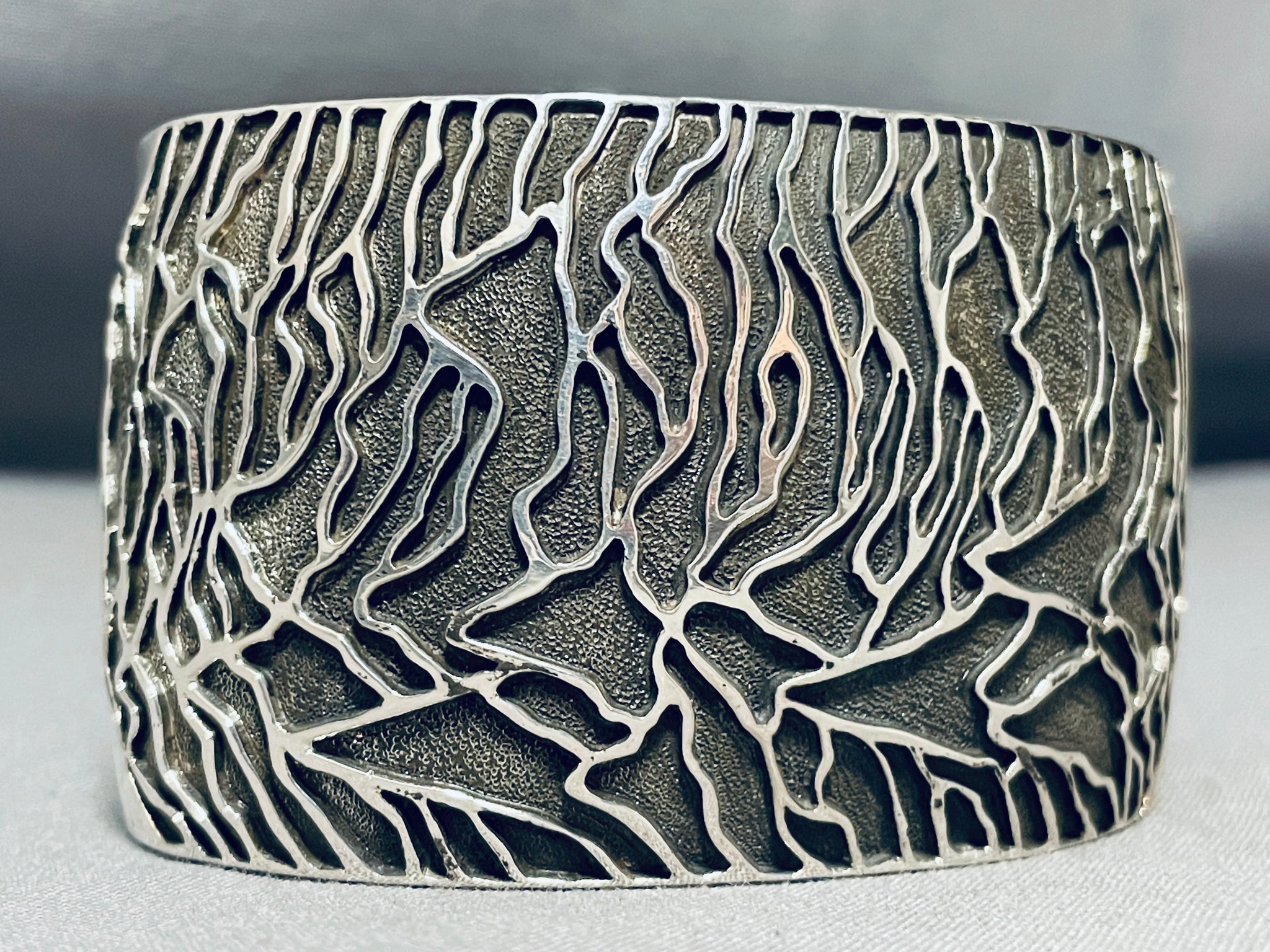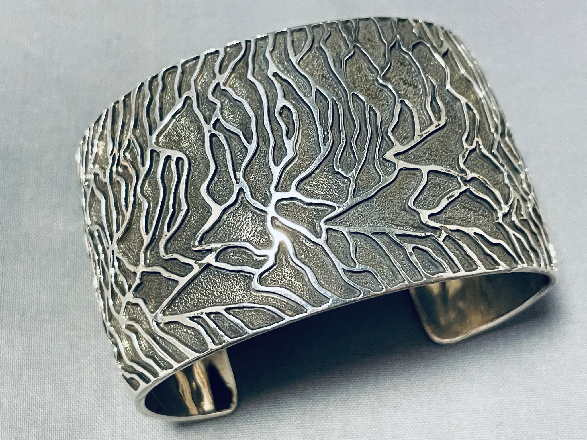 This is a breathtaking Navajo all silver very wide cuff bracelet. This impeccable bracelet contains an amazing hand carved silver branch pattern that wraps almost around the entire cuff. The detailing of the silver branches is just incredible and so unique. The beautiful textured background behind the branches are amazing ans so wonderful. This bracelet is very wide and thick and so sturdy. The width of the bracelet measures around 1-5/8". Signed by Navajo artist, Fred Douglas. Sterling silver, marked. The inside end to end measures around 6" with an additional 1-1/4" gap. Sturdy 83 grams.