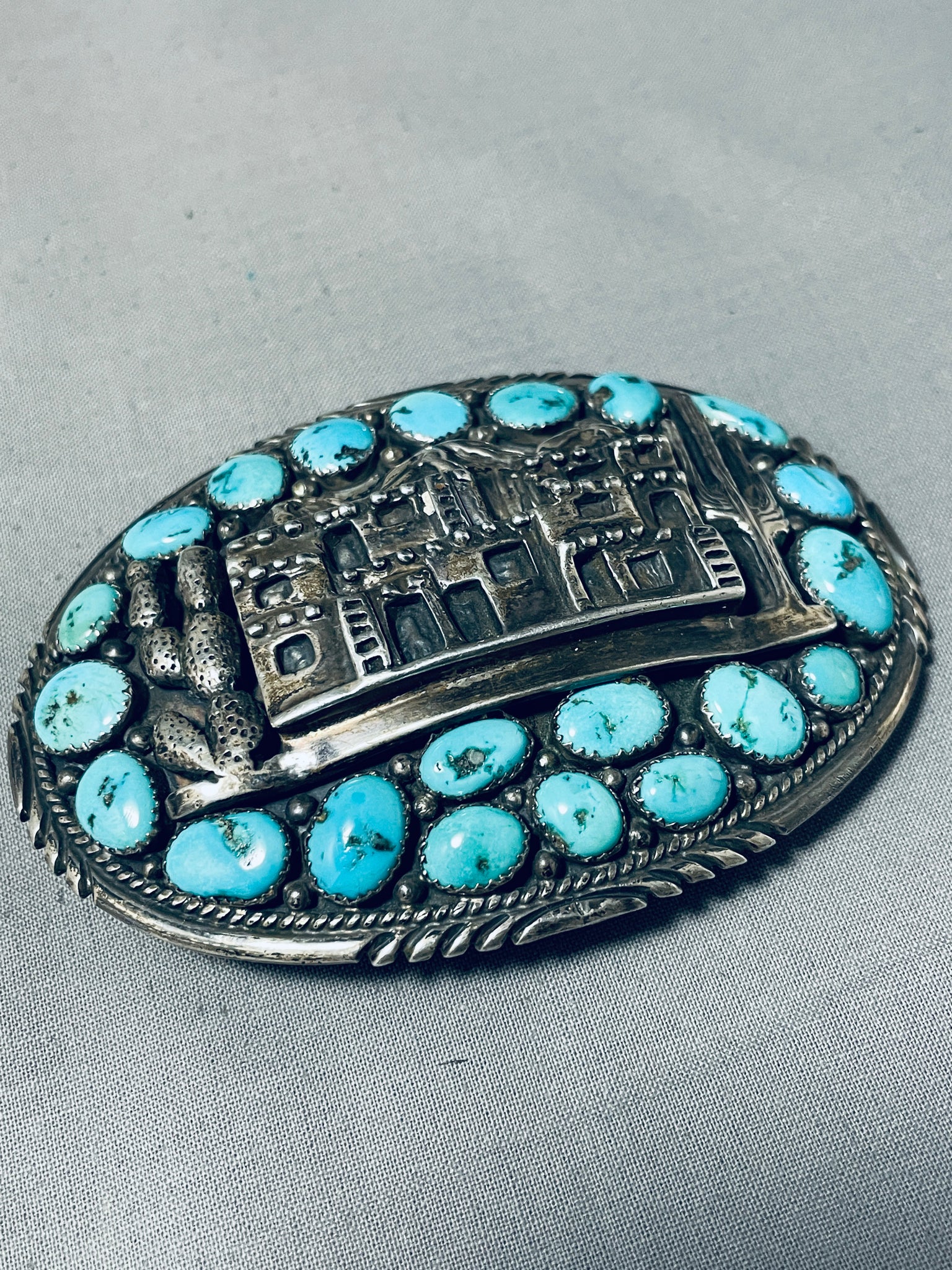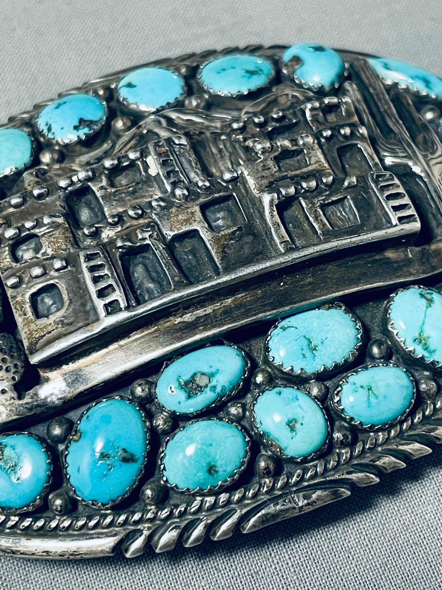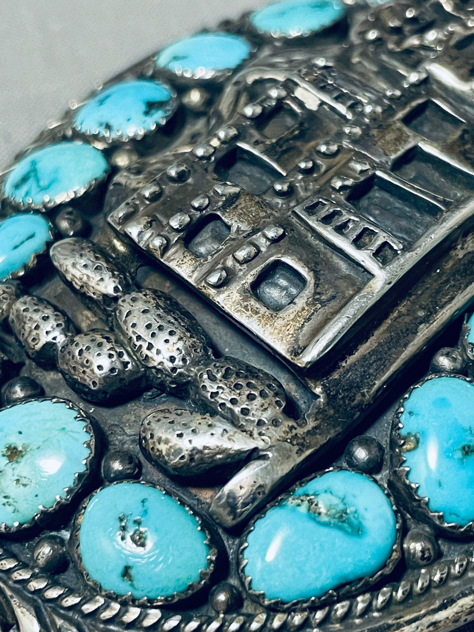 This is a museum quality vintage Navajo silver pueblo and turquoise huge silver buckle. This mind blowing buckle contains a beautiful plethora of large chunky Morenci turquoise stones with a phenomenal hand carved center pueblo with background mountains and cactus at the sides. The intricacy and detailing this buckle consists of is absolutely astonishing. Situated throughout the stones are stunning silver raindrops with a bordering silver rope. Also bordering the thick and sturdy buckle are amazing deep wave patterns. This buckle measures around 3-1/2" X 2-5/8" and can fit a belt width of about 1-1/2" or less. The stones measure around 1/2" x 1/4". Sterling silver, marked. Cir. Mid century . Sturdy 107 grams.