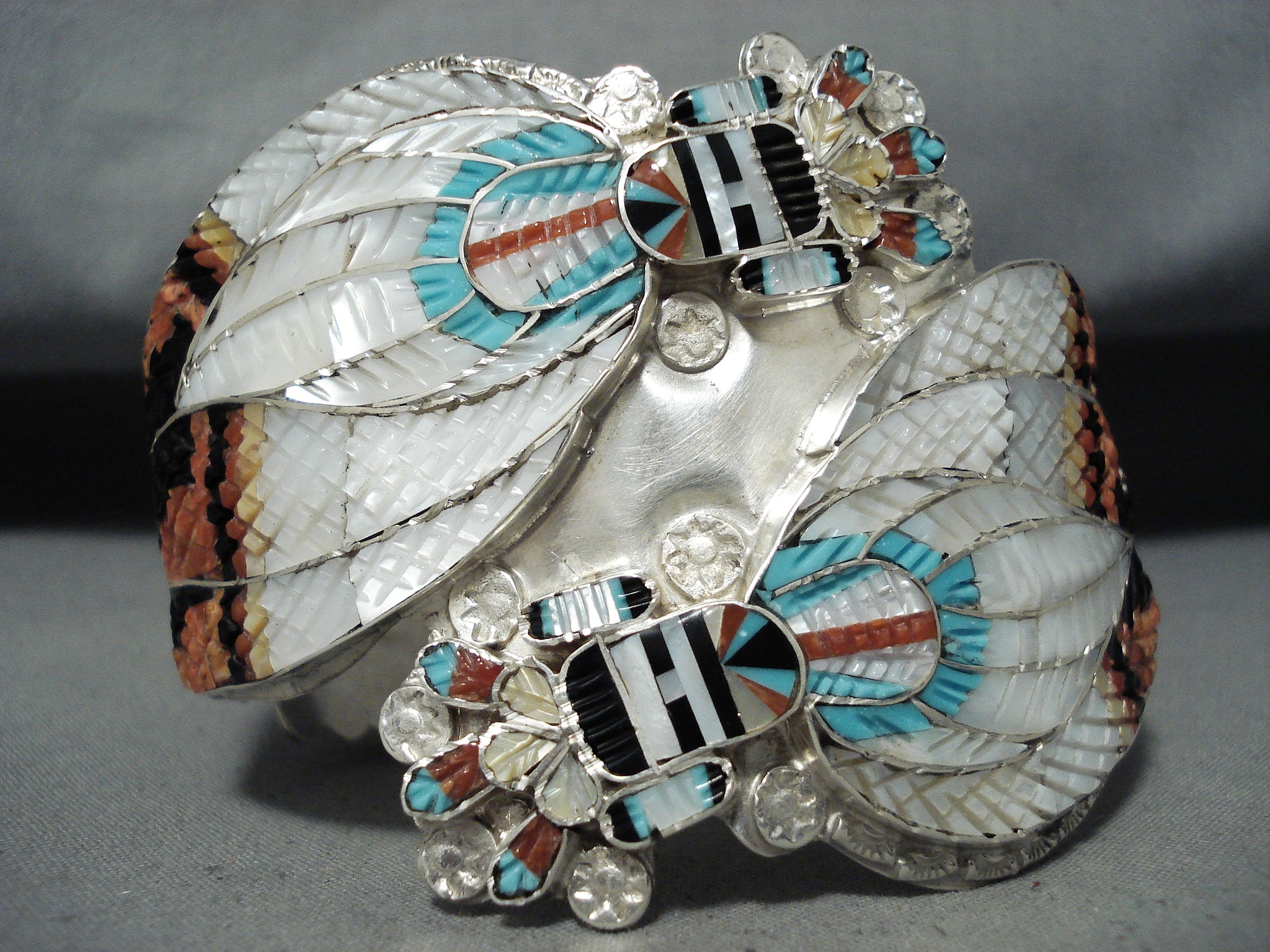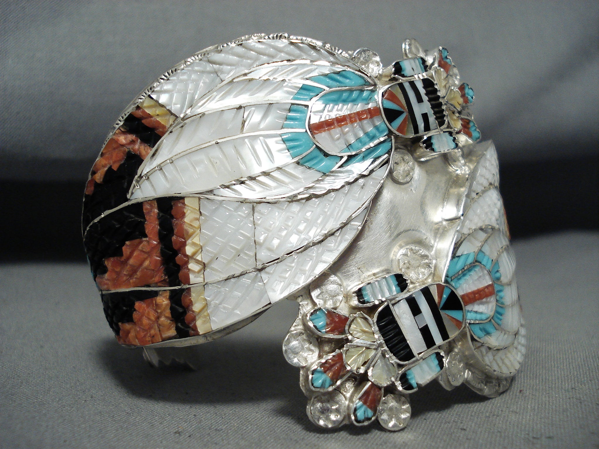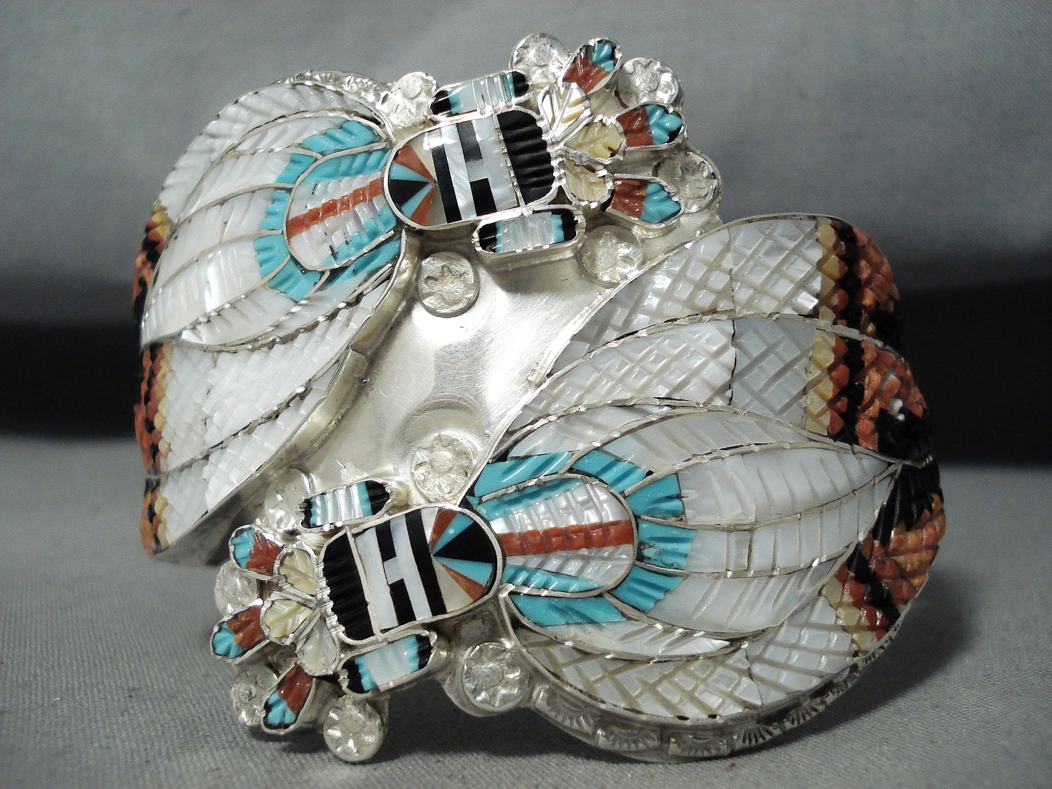 One Of The Most Intricate Native American Zuni Turquoise Kachina Sterling Silver Bracelet