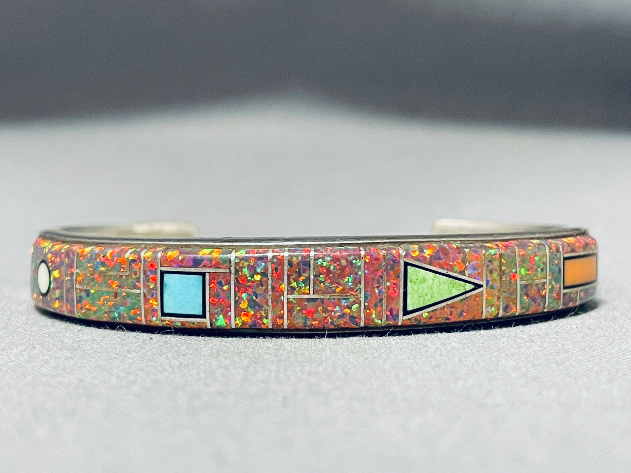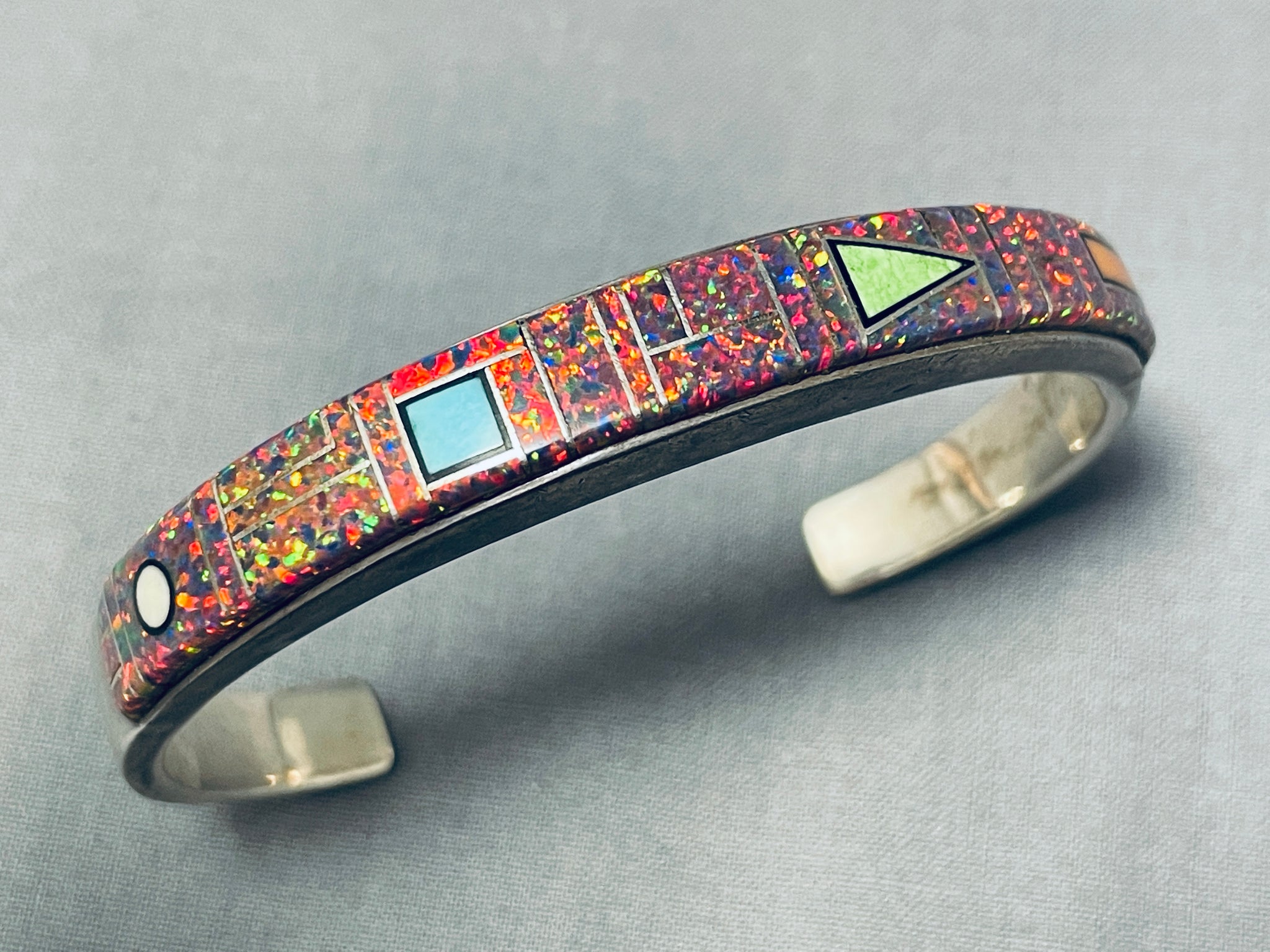 We are proud to offer this striking vintage Navajo silver bracelet having inlay gaspeite, turquoise, coral and more! with handcarved silver borders on a heavy, handcarved solid silver cuff! Absolutely Amazing Piece! The width of the bracelet measures around 3/8". Signed by Navajo artist, E. Benally. Sterling silver, marked. The inside end to end measures around 5-3/4" with an additional 1-3/8" gap. Sturdy 33 grams.