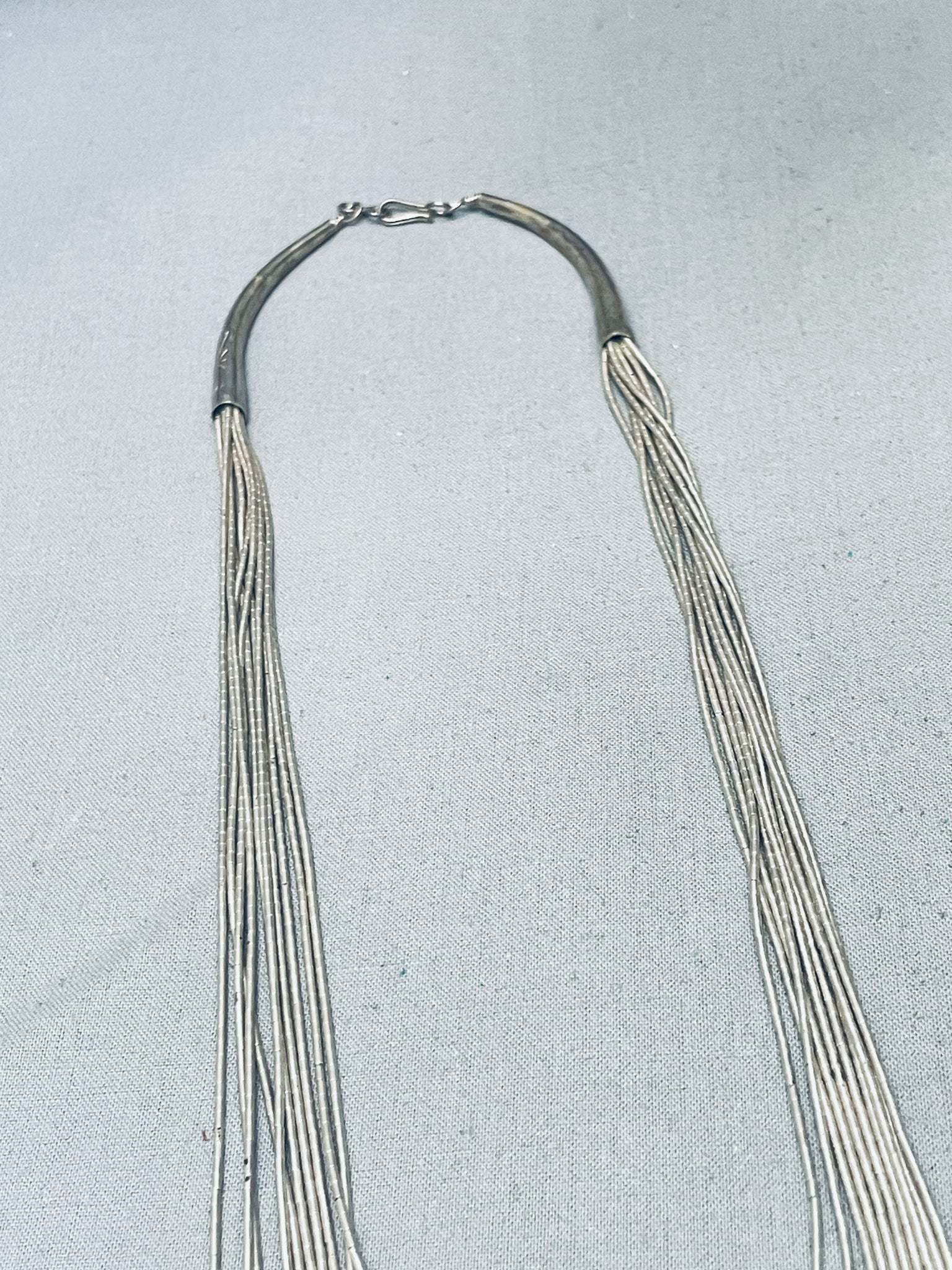 This is an exquisite vintage Navajo multiple strand silver heishi and turquoise necklace. This wonderful necklace contains 10 outstanding silver heishi bead strands that graduate in length towards the bottom. The way the strands rest within one another is just fascinating. Locatd at the bottom is a marvelous plethora of round silver beads and turquoise heishi. The ends of the necklace include long fluted silver cones with a traditional silver clasp. Sterling silver, marked. Cir. 1970's+. The length of the necklace measures around 29". Sturdy 40 grams.