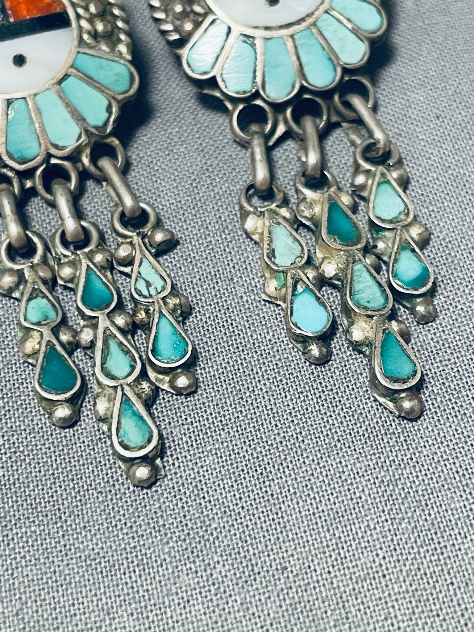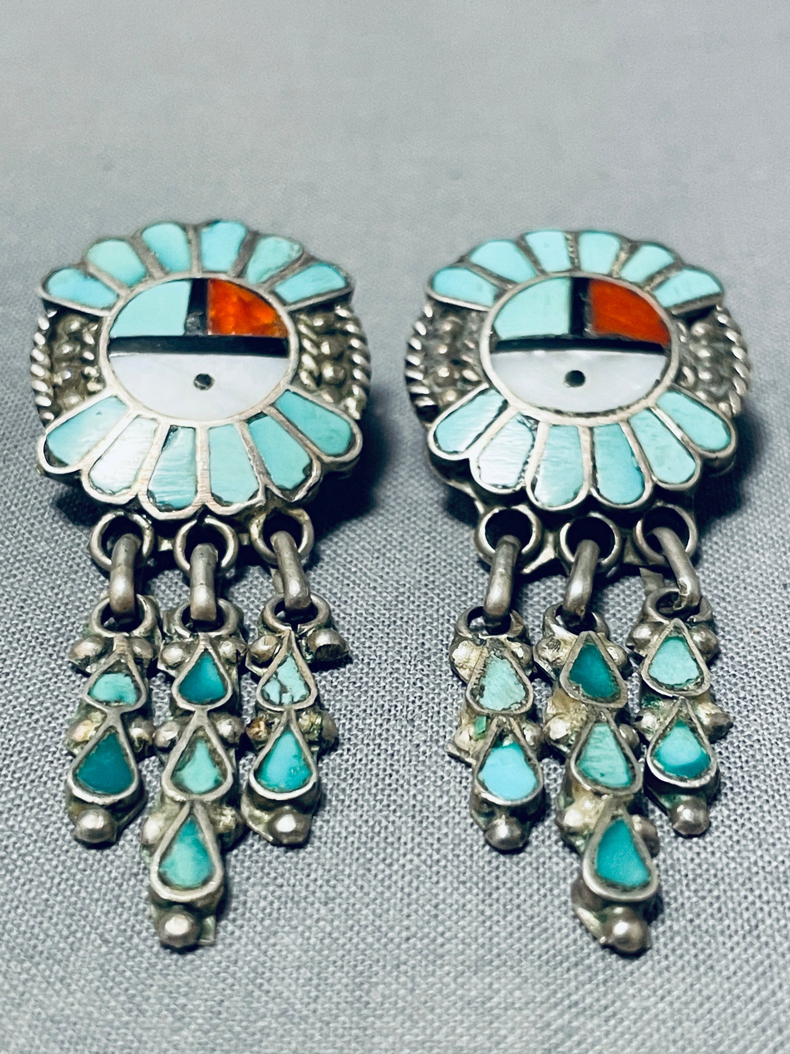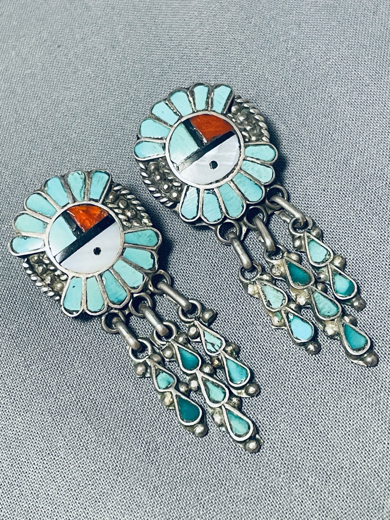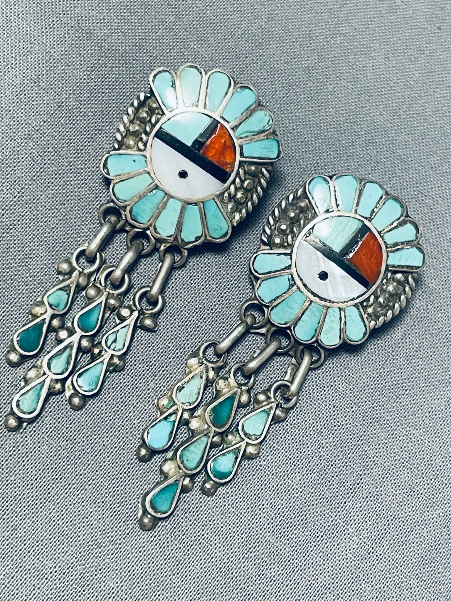 One Of The Most Intricate Vintage Native American Zuni Turquoise Sterling Silver Earrings