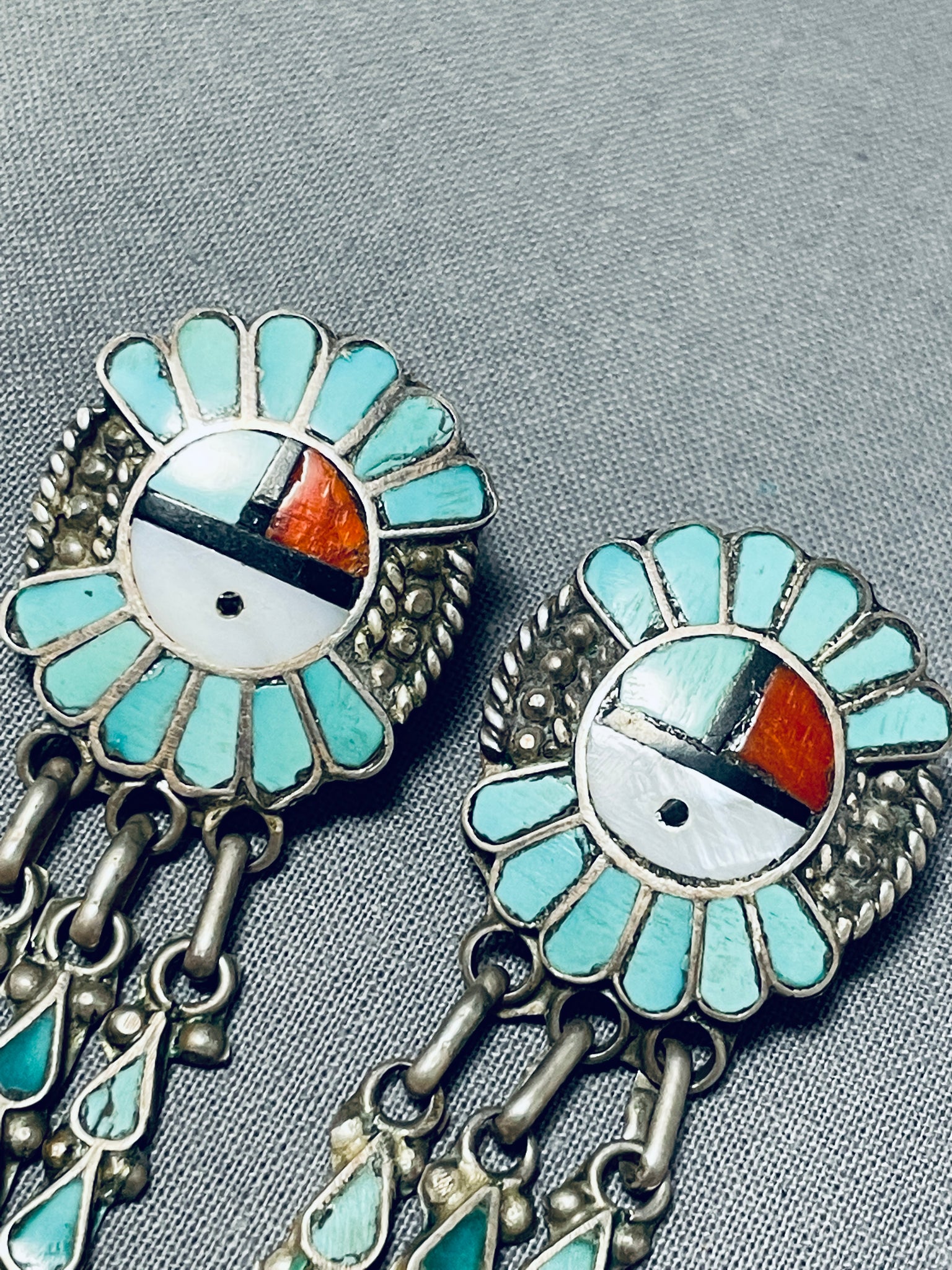 This is a superlative vintage Zuni inlaid sun face silver earrings. These earrings are absolutely incredible as they each consist of a detailed inlaid sun face with three sections of dangling inlaid teardrop stones. The inlay on these earrings consist of Sleeping Beauty turquoise, coral, mother of pearl, and onyx with accenting silver ropes. Each of the wonderful earrings measure around 2-1/4" X 7/8". Sterling silver. Cir. Mid century . The earrings weigh around 13 grams.
