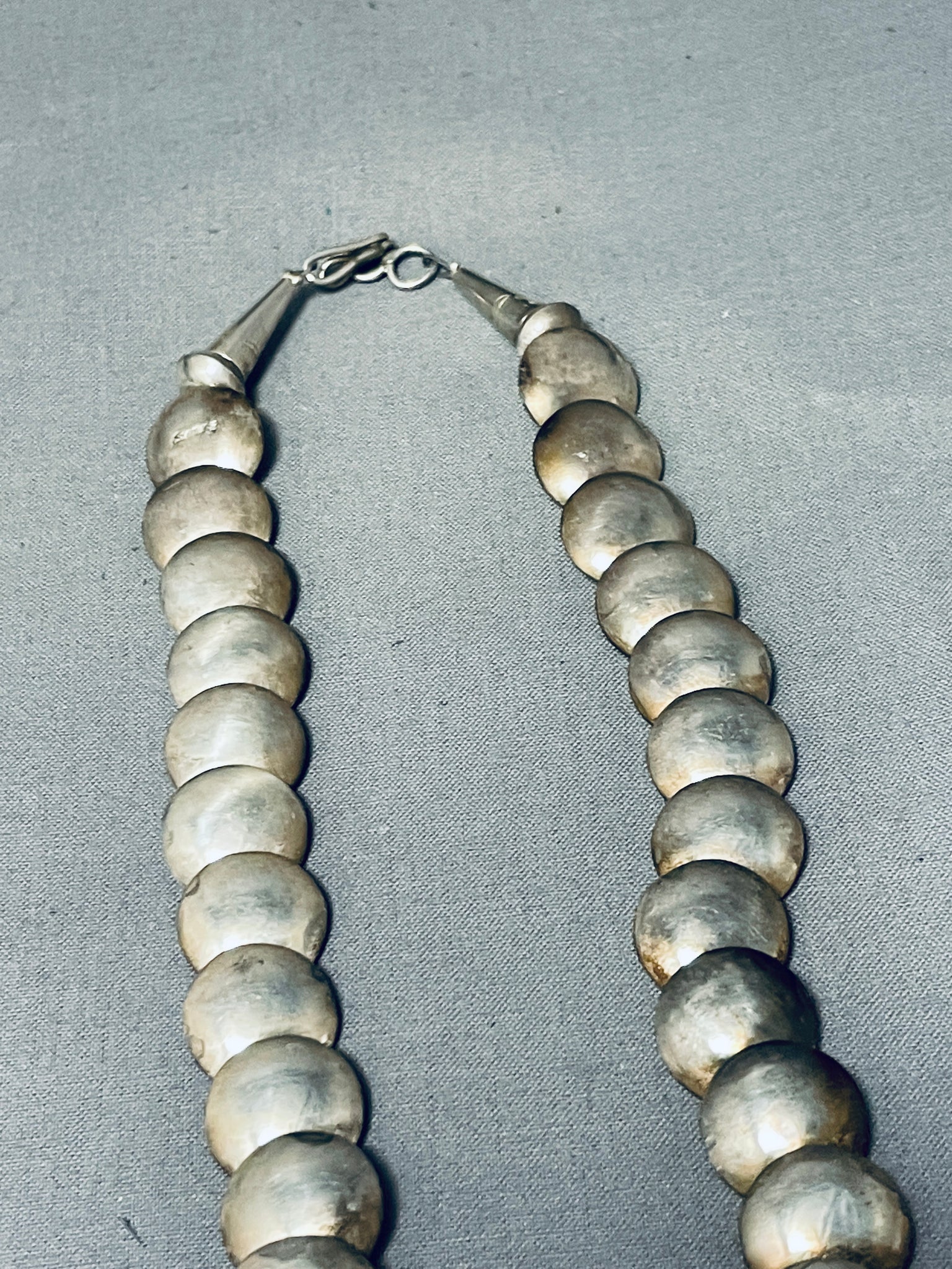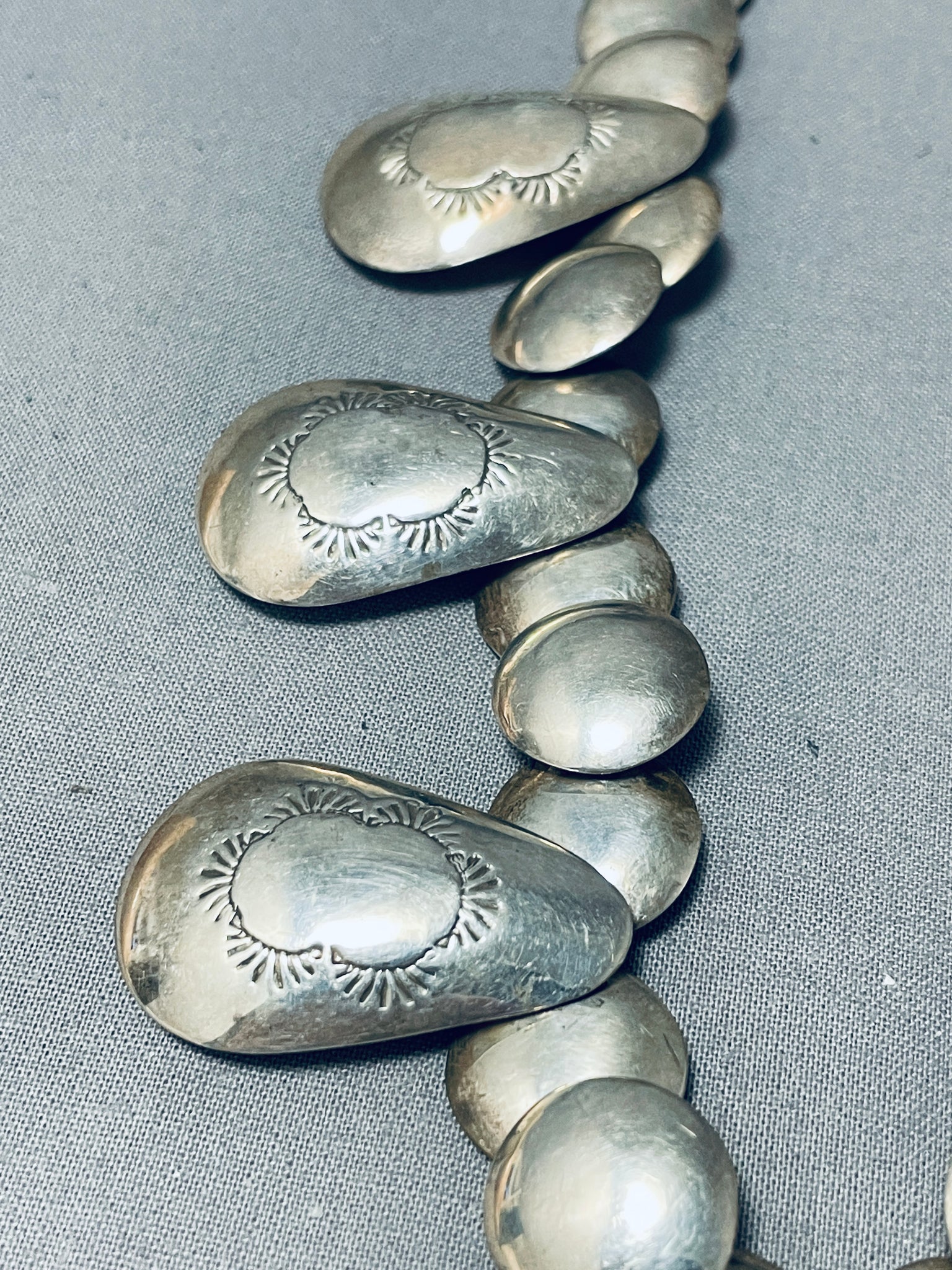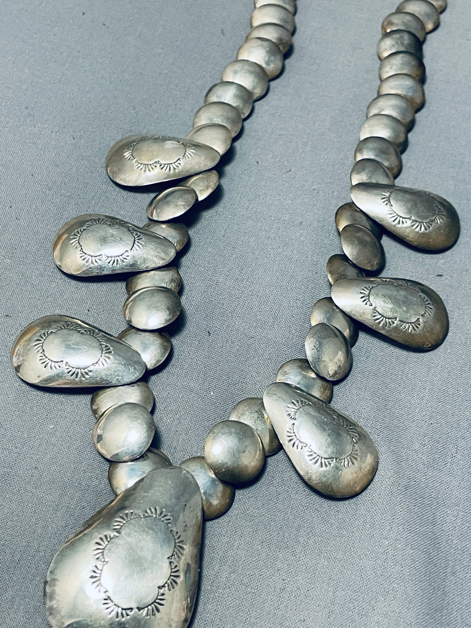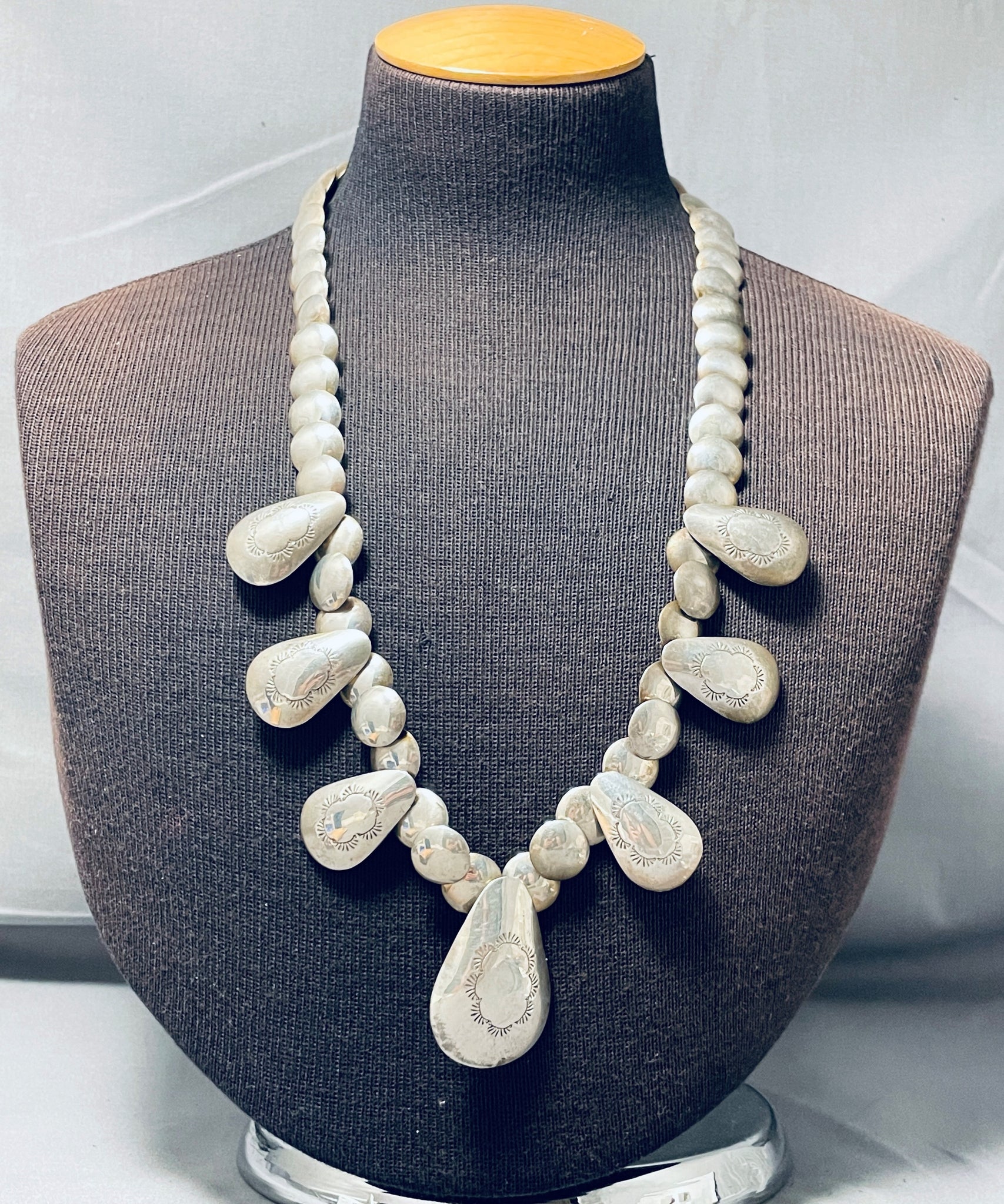 This is an astonishing vintage Navajo all silver bead necklace. This outstanding necklace contains a beautiful plethora of handamde flattened silver beads with accenting teardrop shaped larger flattened silver beads. Located on the teardrop shaped beads are amazing silver sun stampings. The largest bead measures a whopping 1-7/8" X 1-1/4". Located at each end are amazing silver cones with a traditional silver clasp. Sterling silver. Cir. Mid century . The length of the necklace measures around 28". Sturdy 81 grams.