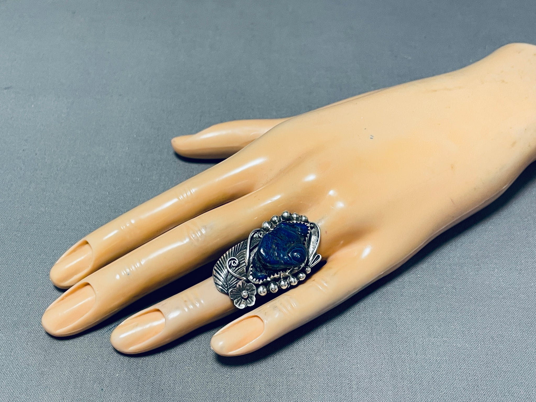 Up for sale is this remarkable vintage Navajo silver ring. Here we have a dimensional chunk of incredible lapis! It's set among marvelous silverwork that includes a silver floral, a leaf, swirling stems and berries! The center stone measures around 1" x 1/2". The ring face measures around 1-1/2" x 7/8". Signed by Navajo artist, Leo Dixon. The ring size is around 8. Sterling silver. Sturdy 8 grams.