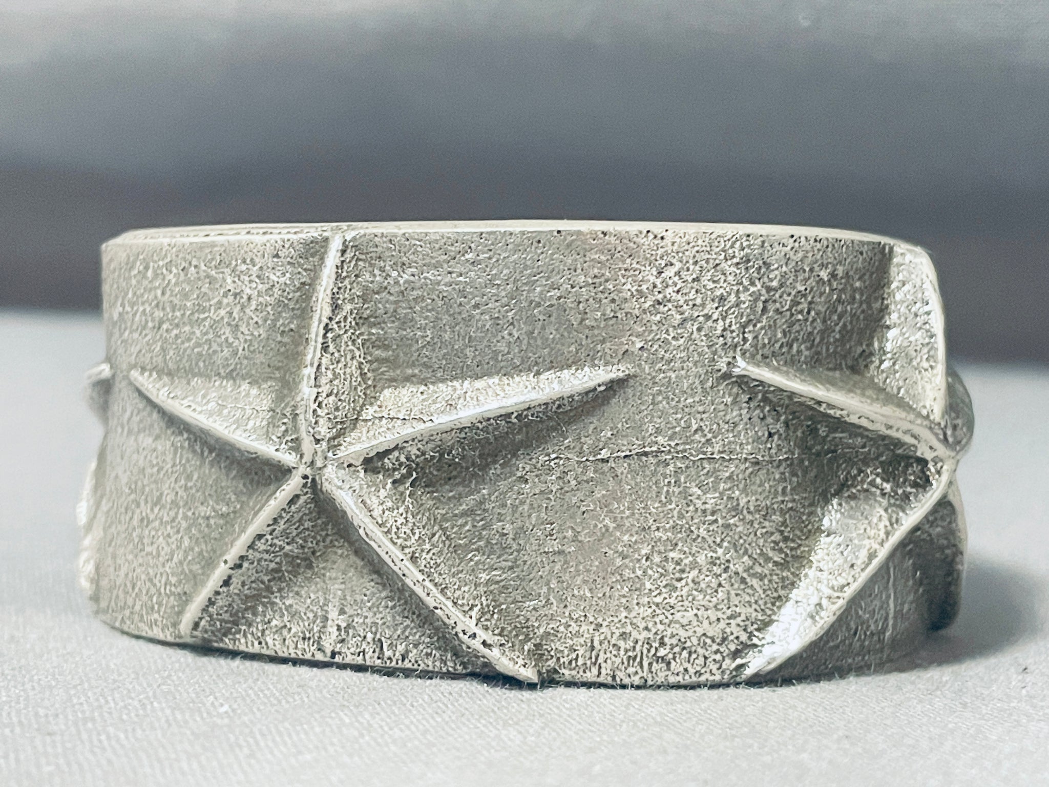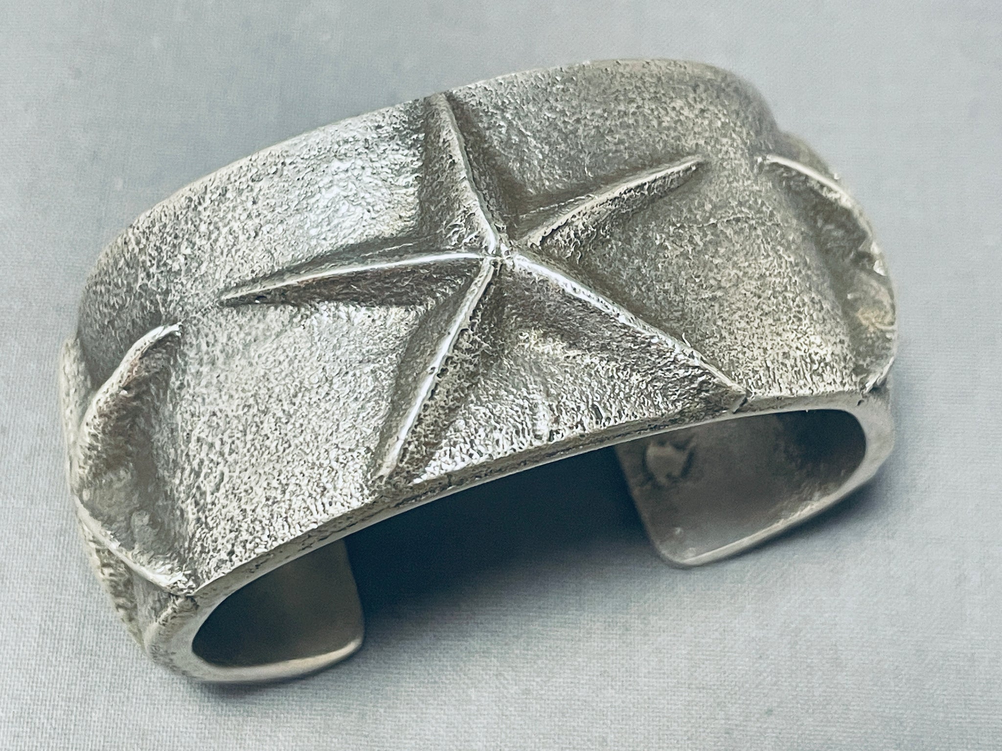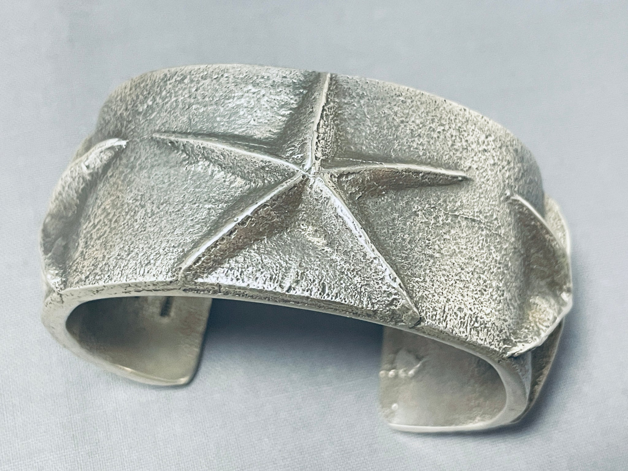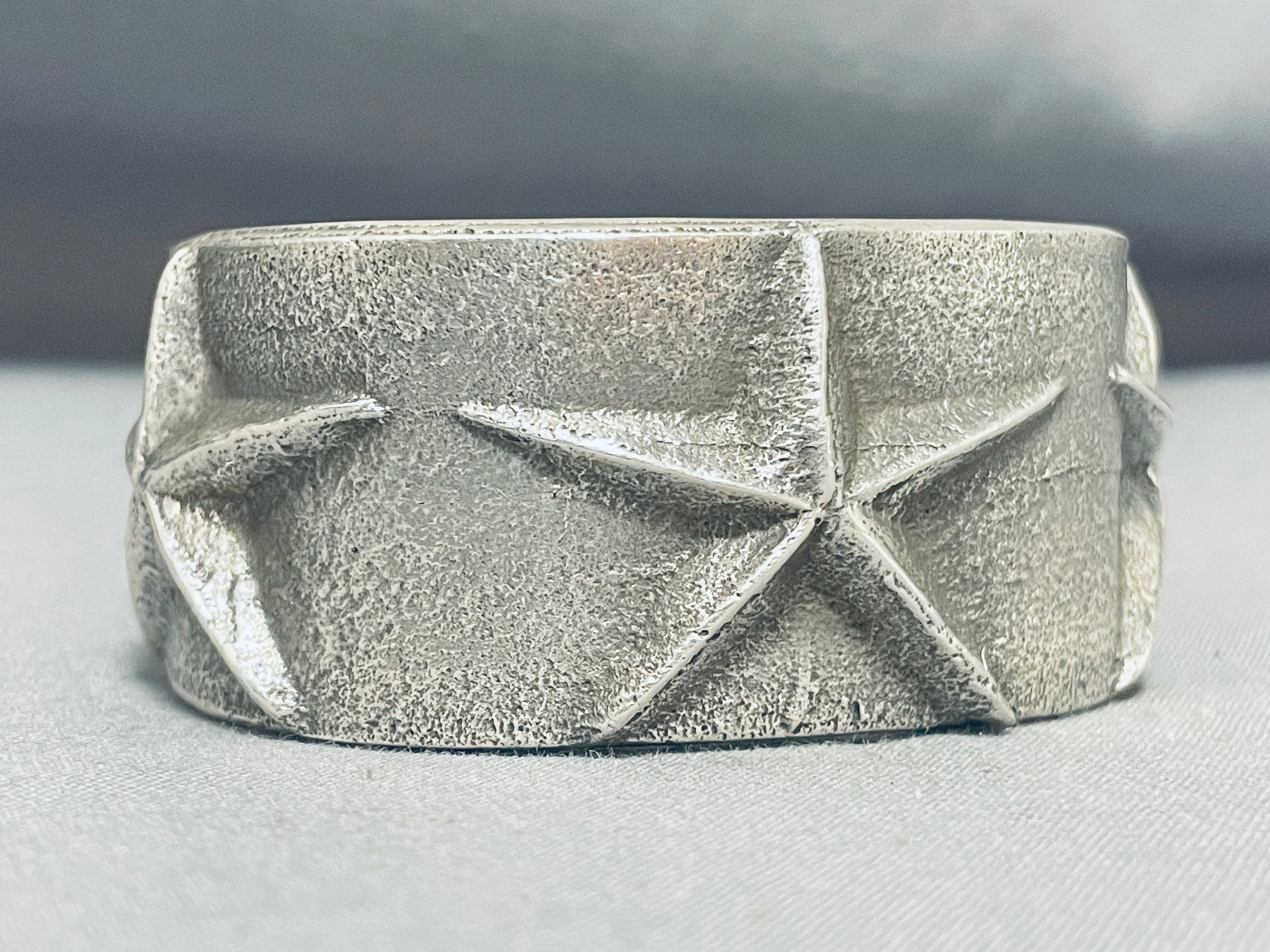 This is a superlative vintage Navajo all silver very thick cuff bracelet. This impeccable bracelet contains three phenomenal hand carved silver star patterns that protrude out from the cuff. The cuff on this bracelet is very thick and sturdy. I absolutely love how the artist textured the cuff. The width of the bracelet measures around 1-1/8". Signed by Navajo artist, Stu Billie. Sterling silver, marked. Cir. 1980's+. The inside end to end measures around 5-1/2" with an additional 1" gap. Sturdy 156 grams.