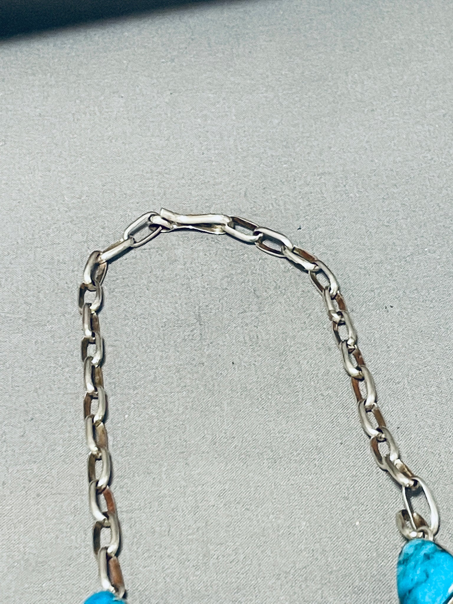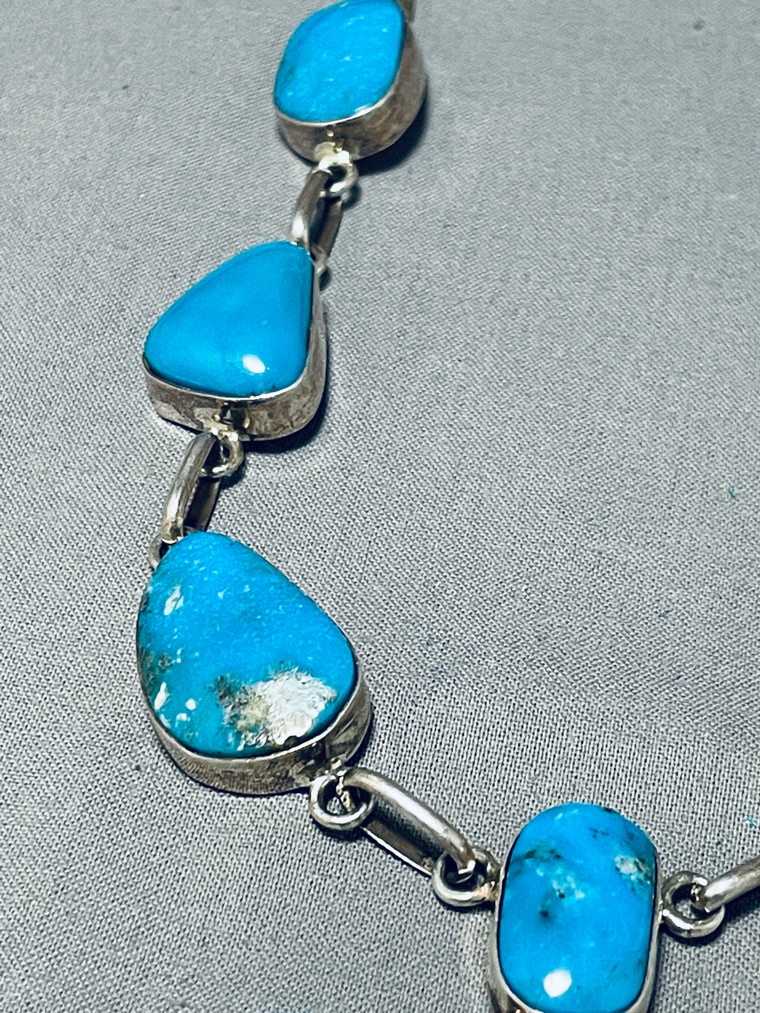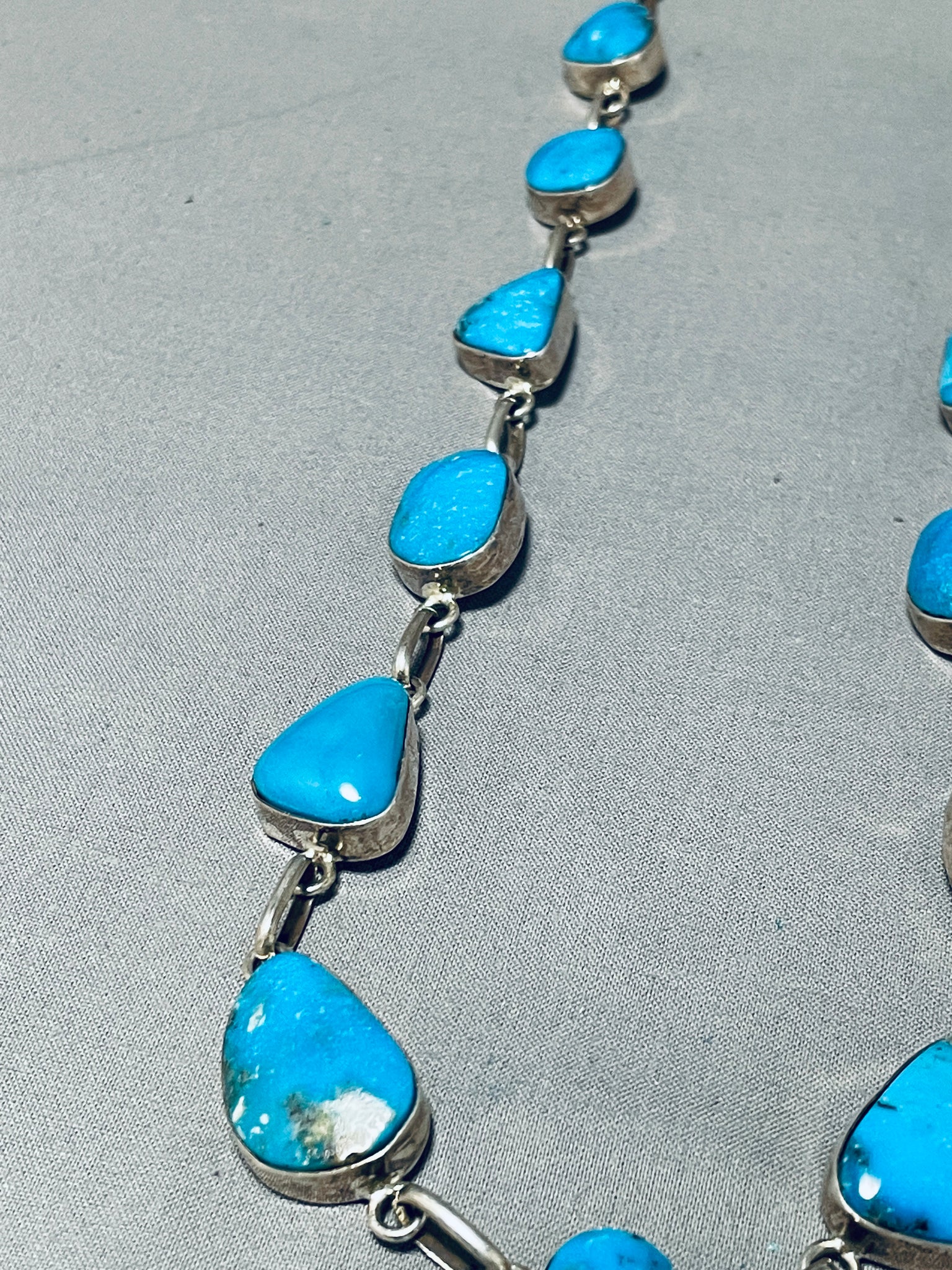 This is a superlative Navajo large chunky turquoise stone silver cross necklace. This amazing necklace contains 17 incredible large chunky vibrant blue turquoise stones appearing to be from the wonderful Pilot Mountain turquoise mine. The largest stones measure around 1" X 3/4". Resting at the bottom of the necklace is a beautiful handmade silver cross pendant that contains five incredible turquoise stones. The cross pendant measures around 3" X 2-1/4". Resting throughout the rest of the necklace are incredible large thick and sturdy handmade silver links with a traditional silver clasp. Sterling silver, marked. Cir. 1980's+. Signed by Navajo artist, M (possibly Arny Maloney). The length of the necklace measures around 35". Sturdy 111 grams.