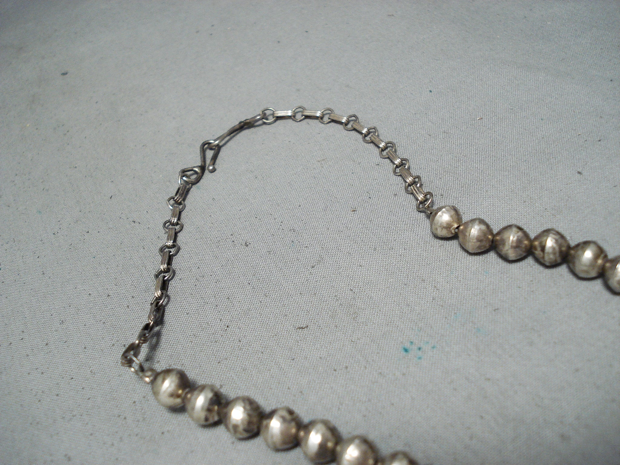 This is a fabulous vintage Navajo inlaid silver leaf necklace. This remarkable piece contains three inlaid silver leaves that consist of turquoise and onyx stones. This necklace is extremely heavy as each inlaid pendant is thick and sturdy. The largest pendant measures around 3" X 3". Resting throughout the majority of the necklace are round silver beads with a wonderful end silver link chain and a traditional silver clasp. Sterling silver. Cir. Mid century . The length of the necklace measures around 25". Sturdy 110 grams.