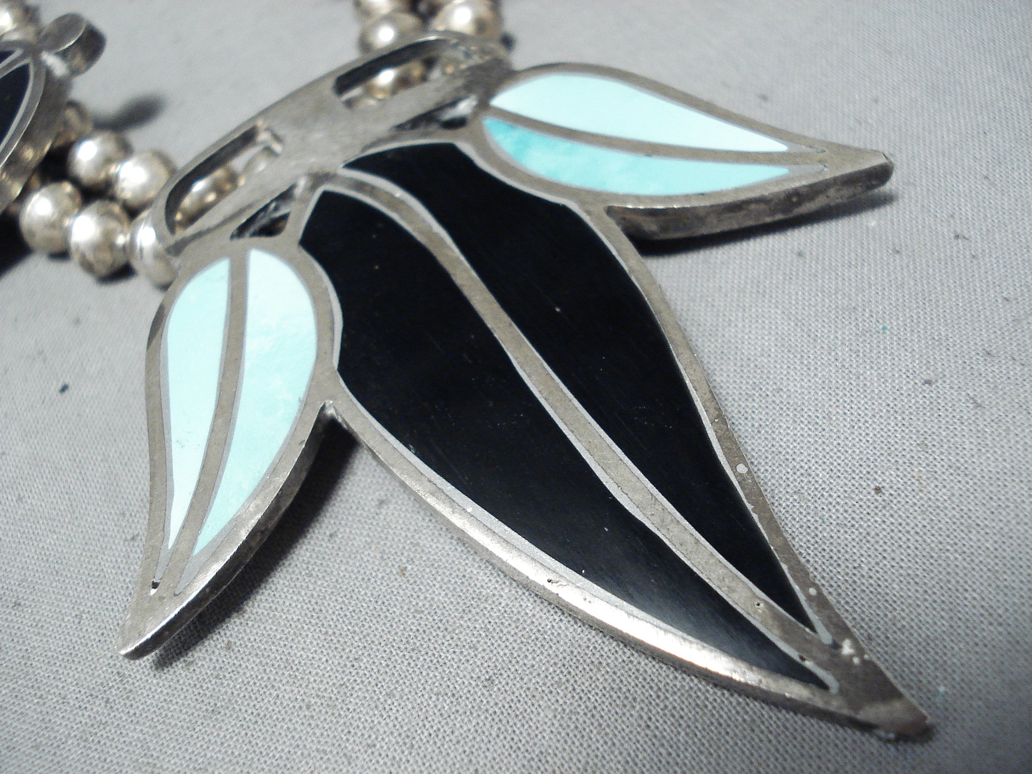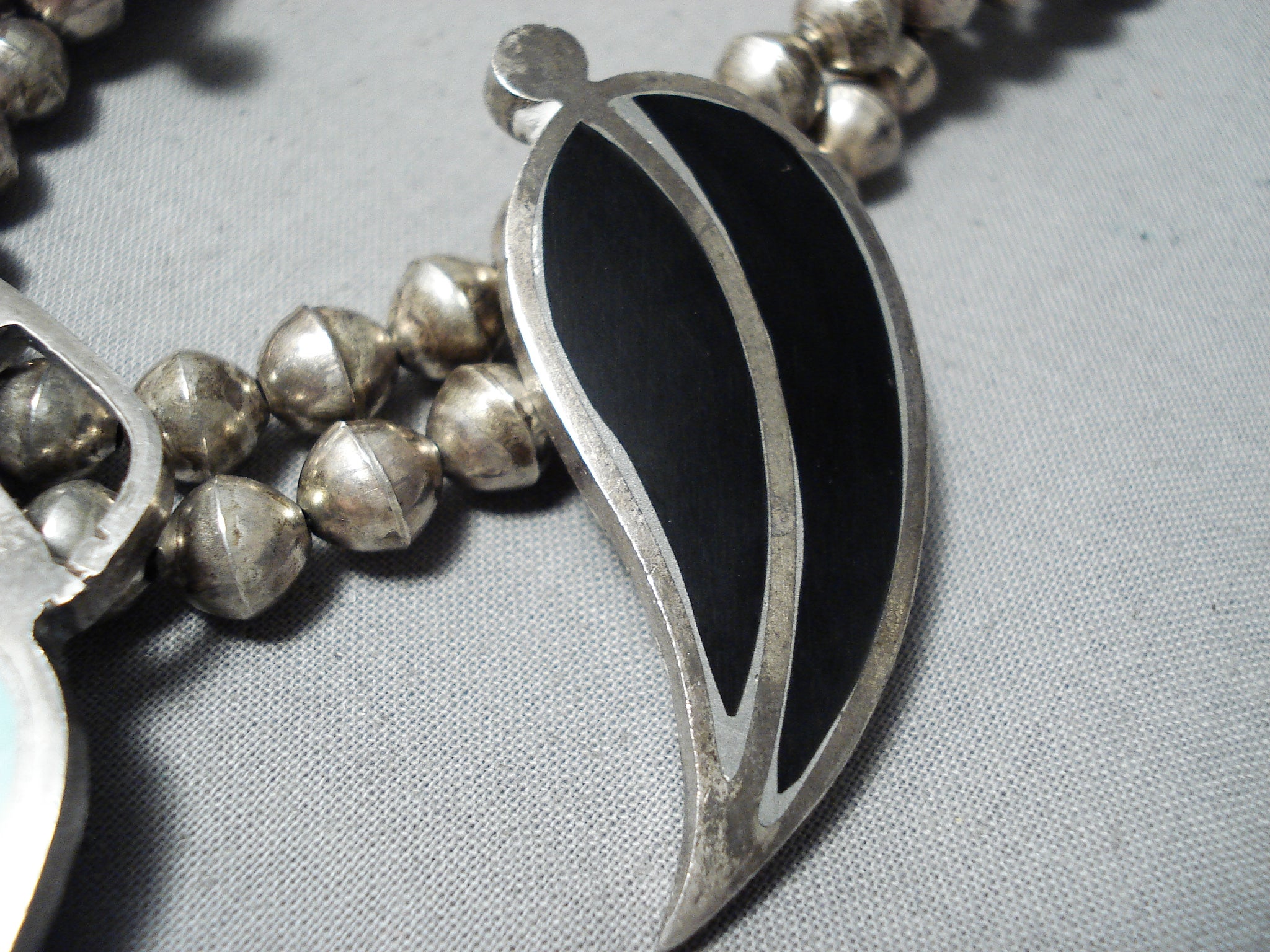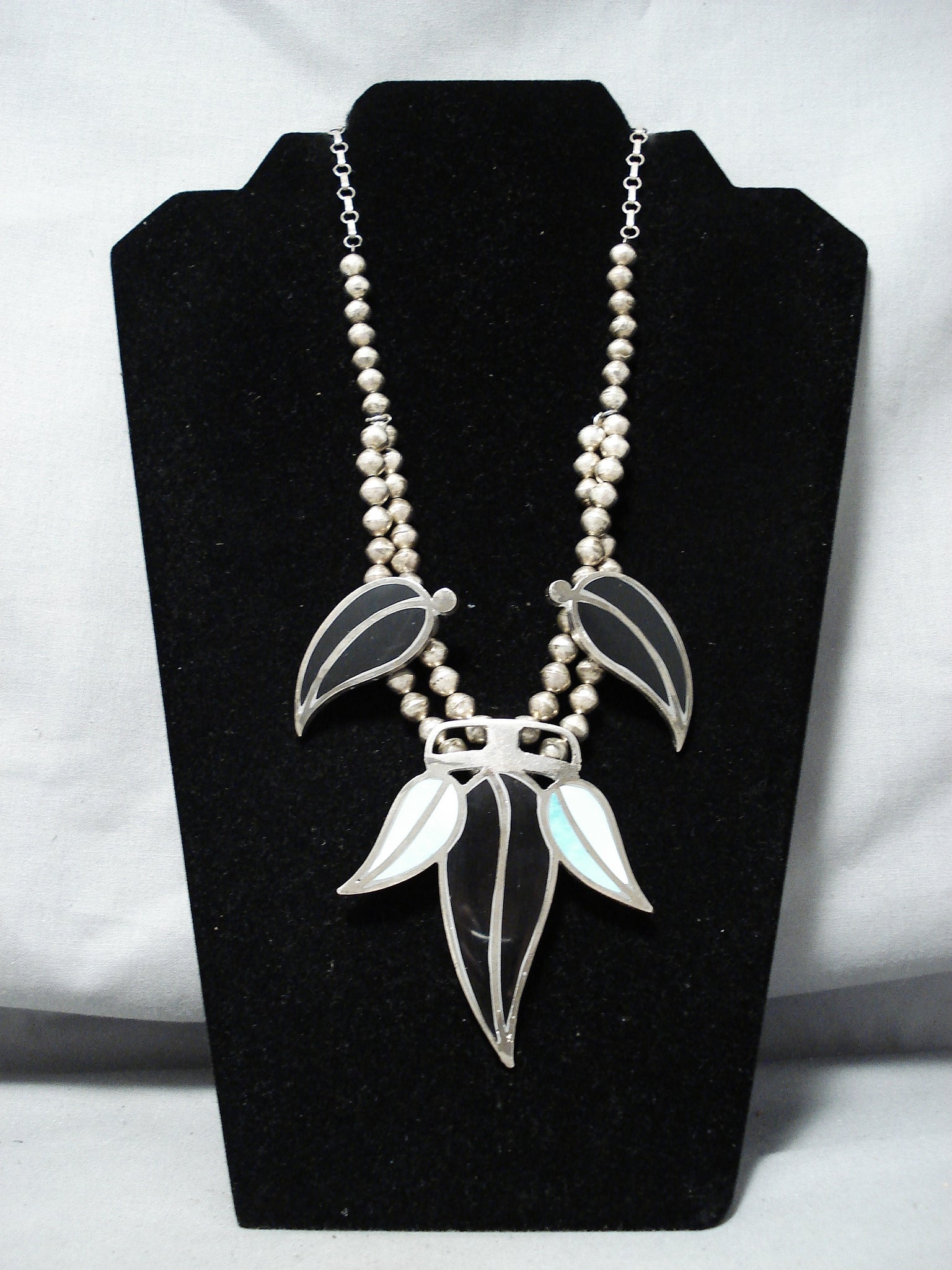 One Of The Most Unique Vintage Native American Navajo Turquoise Sterling Silver Inlay Necklace