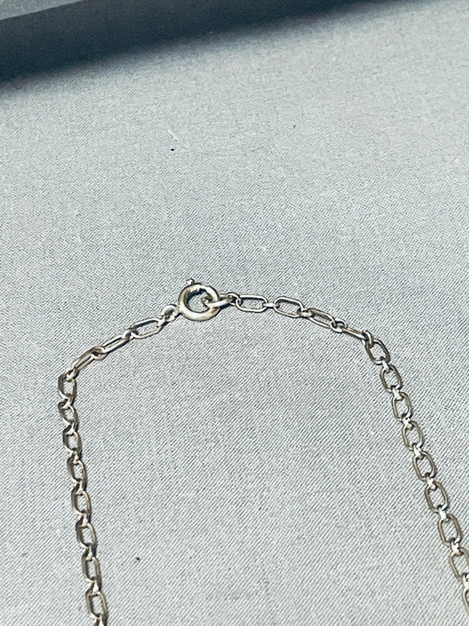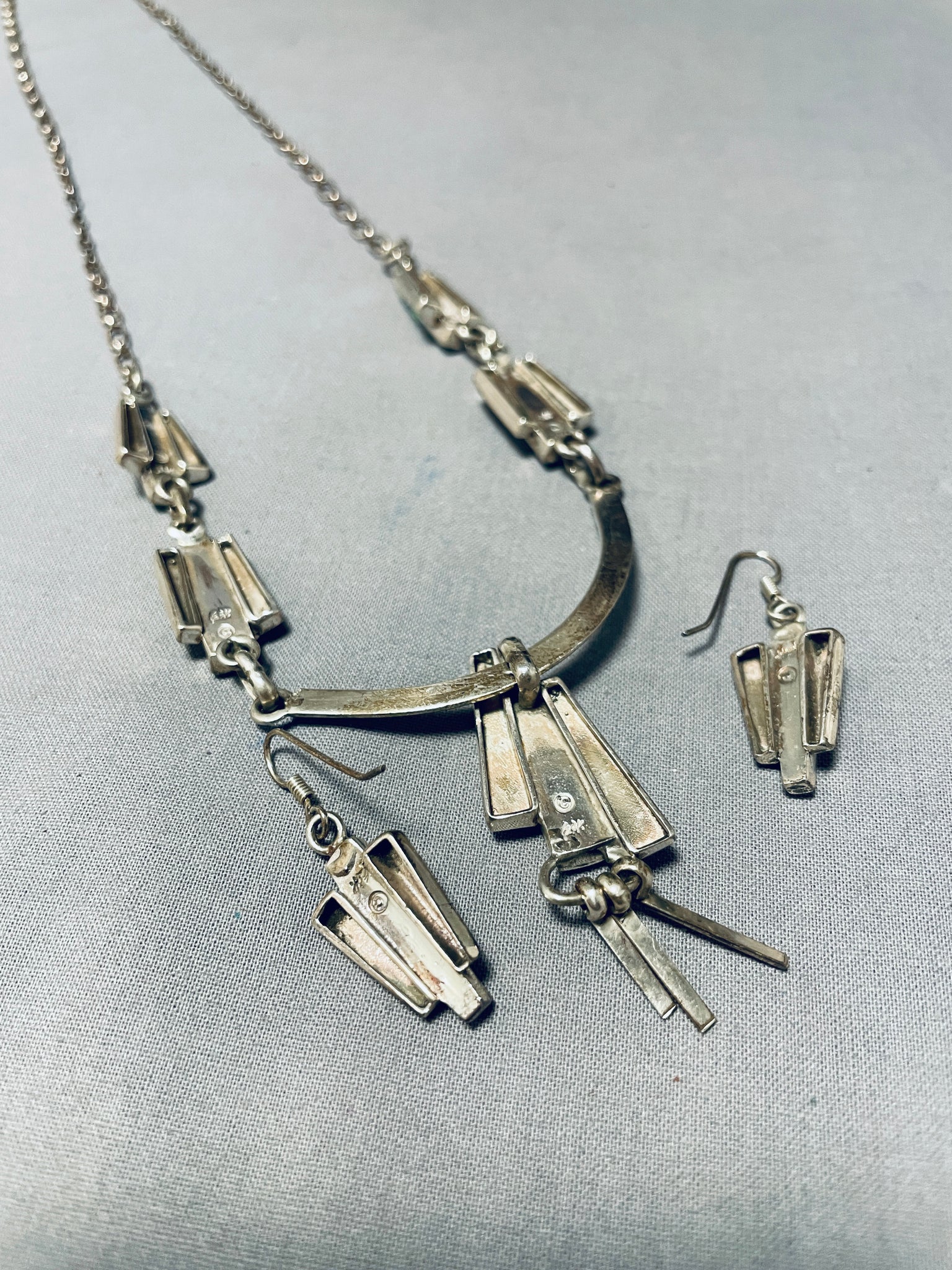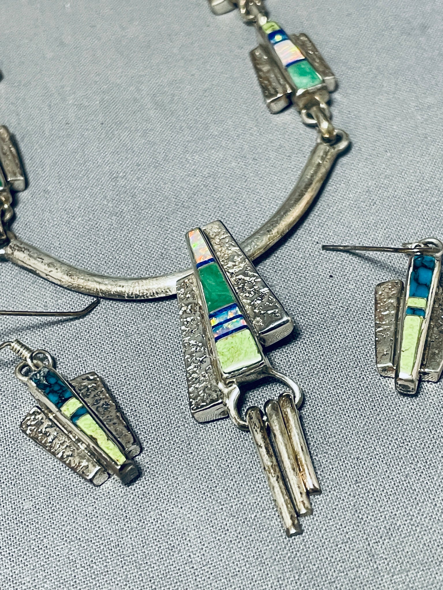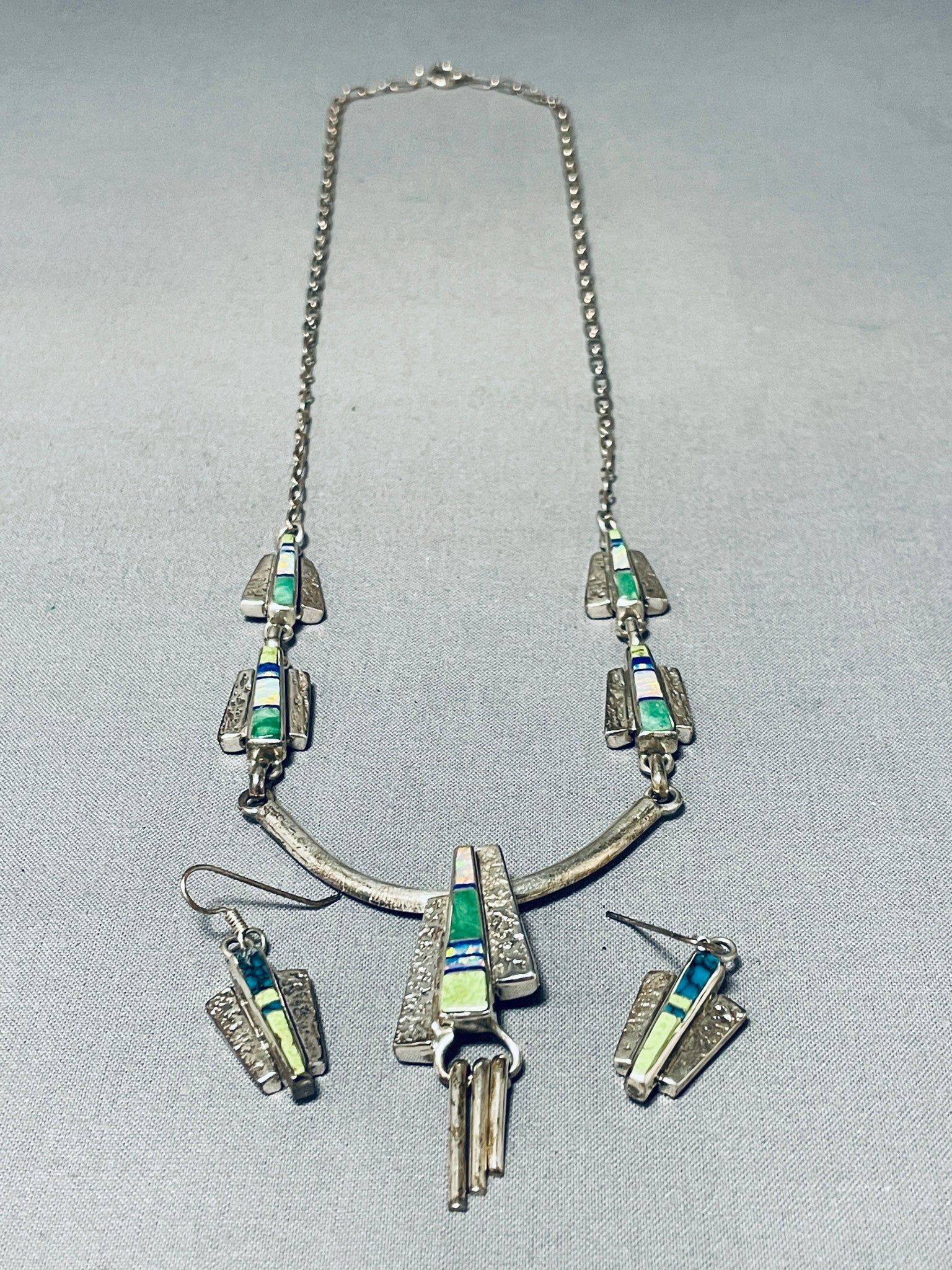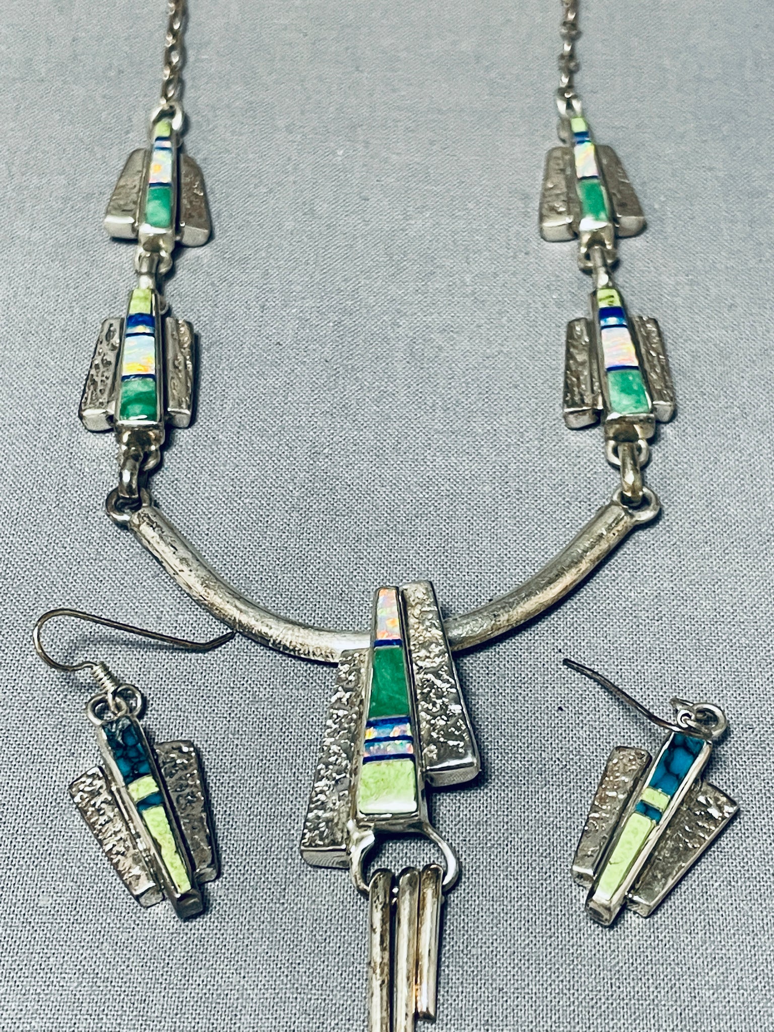 This is a superlative Navajo inlaid silver pendant necklace. This impeccable necklace contains 5 outstanding inlaid silver pendants with the largest measuring around 2" X 3/4" including the three dangling pendants from the bottom. Located on each of the five pendants are superior gaspeite stones, opal and lapis stones. I love the silver link chain that this necklace contains. What I also love about this necklace is that it comes with a stunning matching pair of inlaid earrings that each measure around 1" X 1/2". Sterling silver. Cir. 1990's+. The length of the necklace measures around 26-1/2". Sturdy 40 grams.