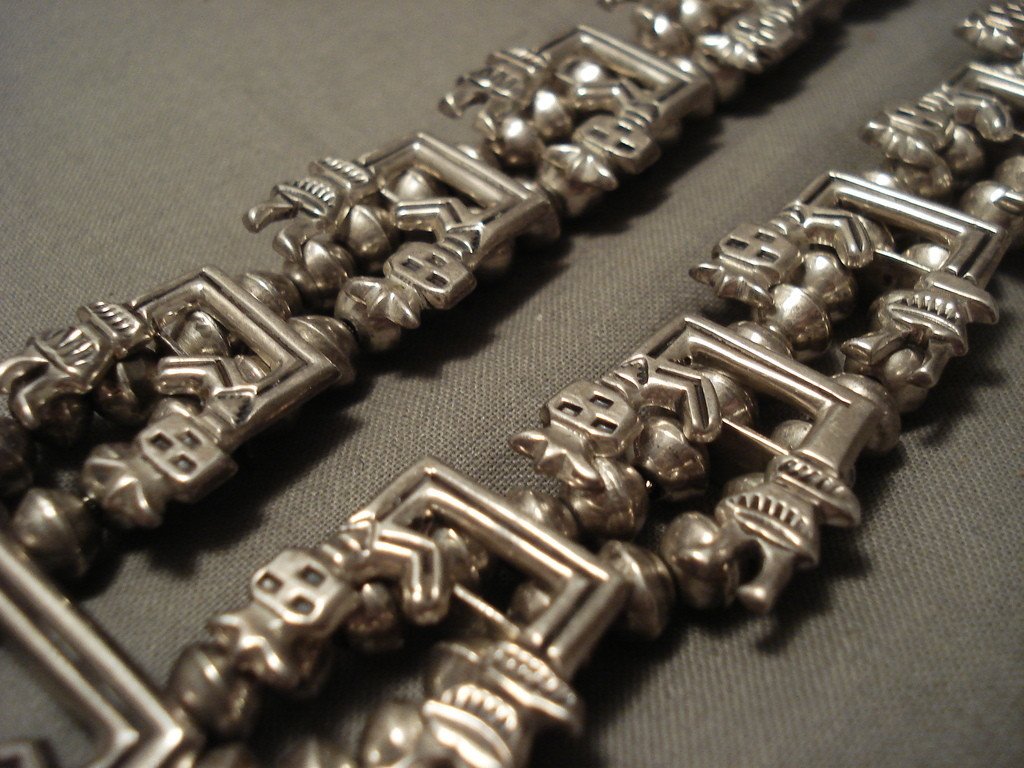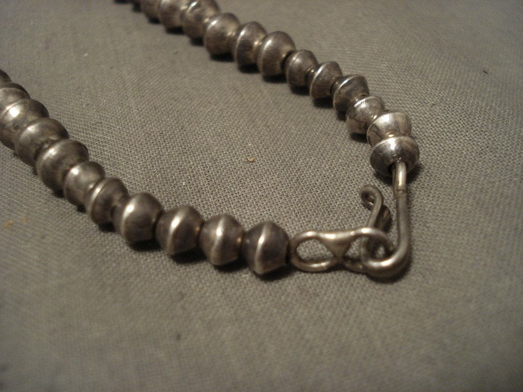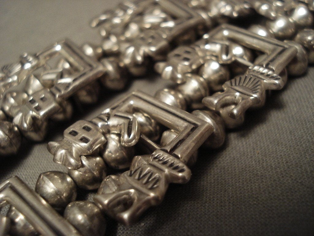 This is a breathtaking vintage Navajo Native American jewelry Native American jewelry very important Yei Bi Chei all silver squash blossom necklace. This piece contains 18 phenomenal silver squashes that are all completely handmade silver Yei Bi Cheis. Each squash measures around 3/4" X 3/4" and the center bottom Yei Bi Chei silver naja measures around 1" X 1". Check out the marvelous handmade silver beads that wonderfully graduate in size. Sterling silver. Cir. Mid century . Signed by Navajo Native American jewelry Native American jewelry artist, FJ. The length of the necklace measures around 27". Sturdy 122 grams. Financial Assistance- We are happy to work with you and are more flexible than anyone on the net. Simply send us an email for more information.