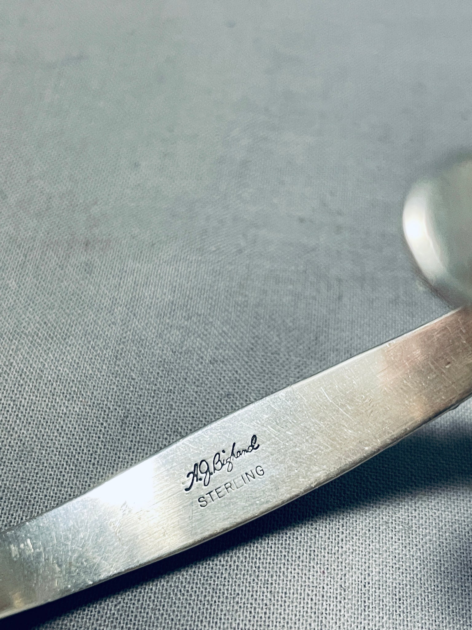 The center stone measures around 1/2" x 1/4". The width of the bracelet measures around 3/8". Signed by Navajo artist, A.J. Bighand. Sterling silver, marked. The inside end to end measures around 5-1/4" with an additional 1-1/4" gap. Sturdy 27 grams.