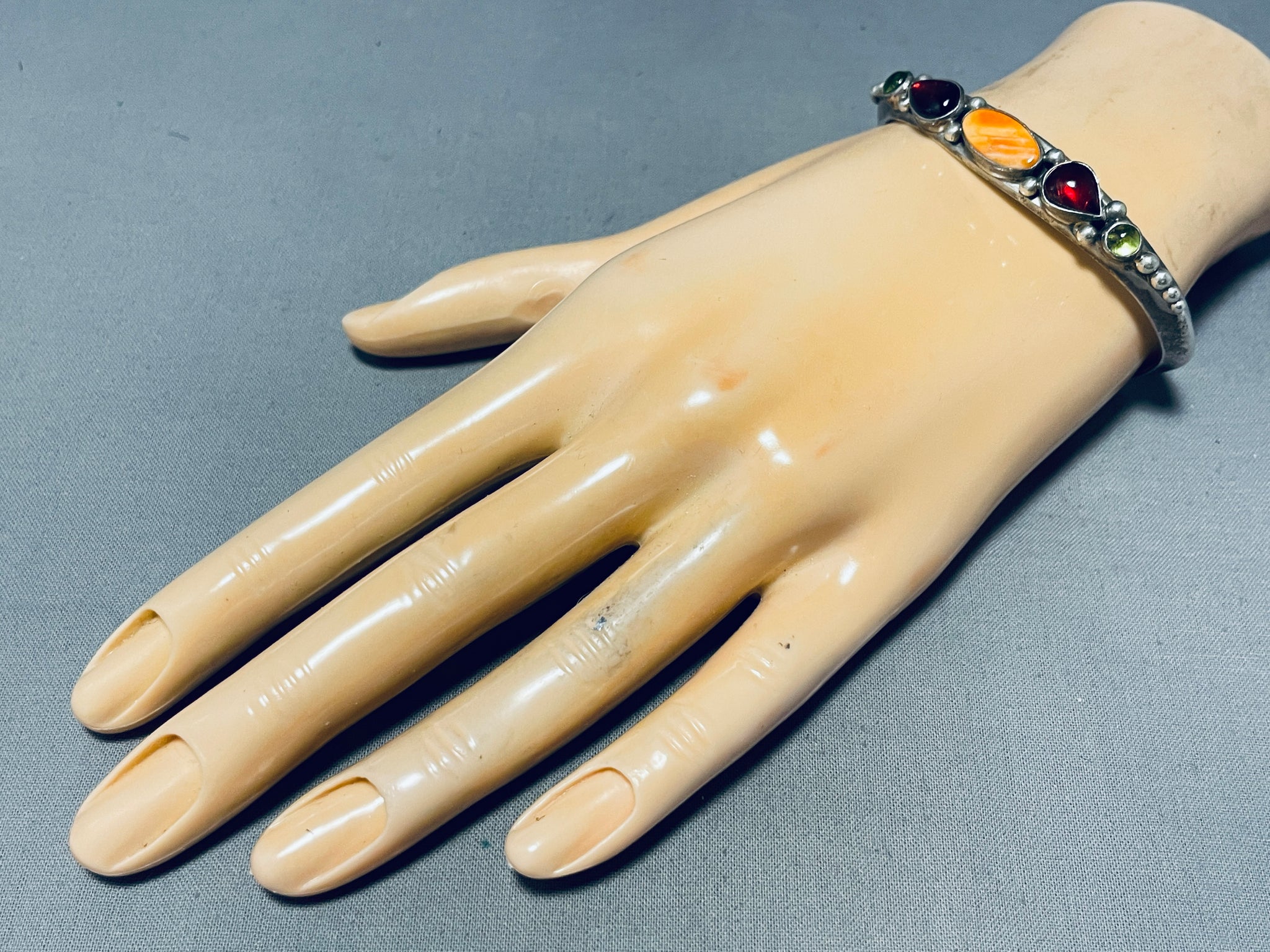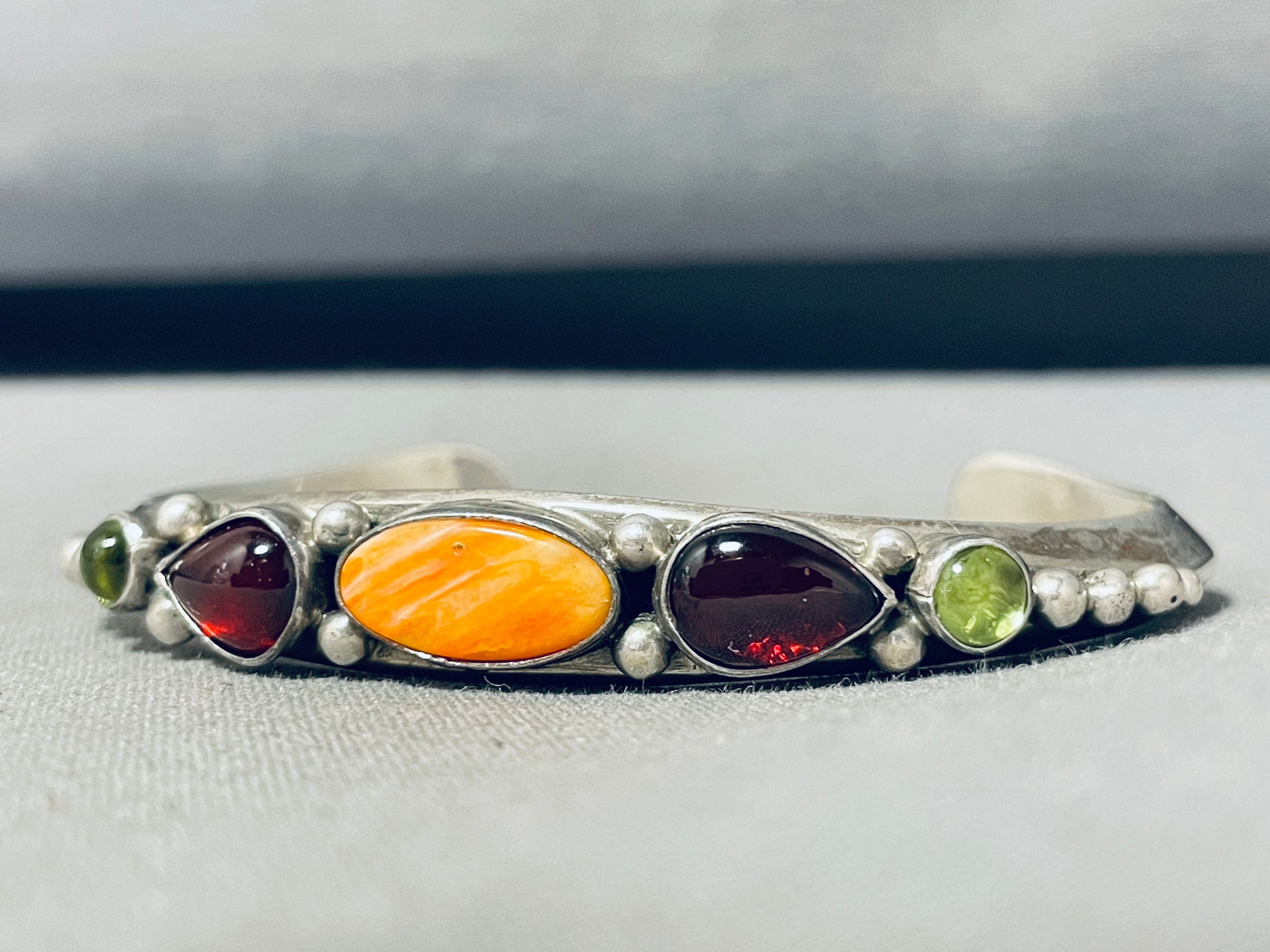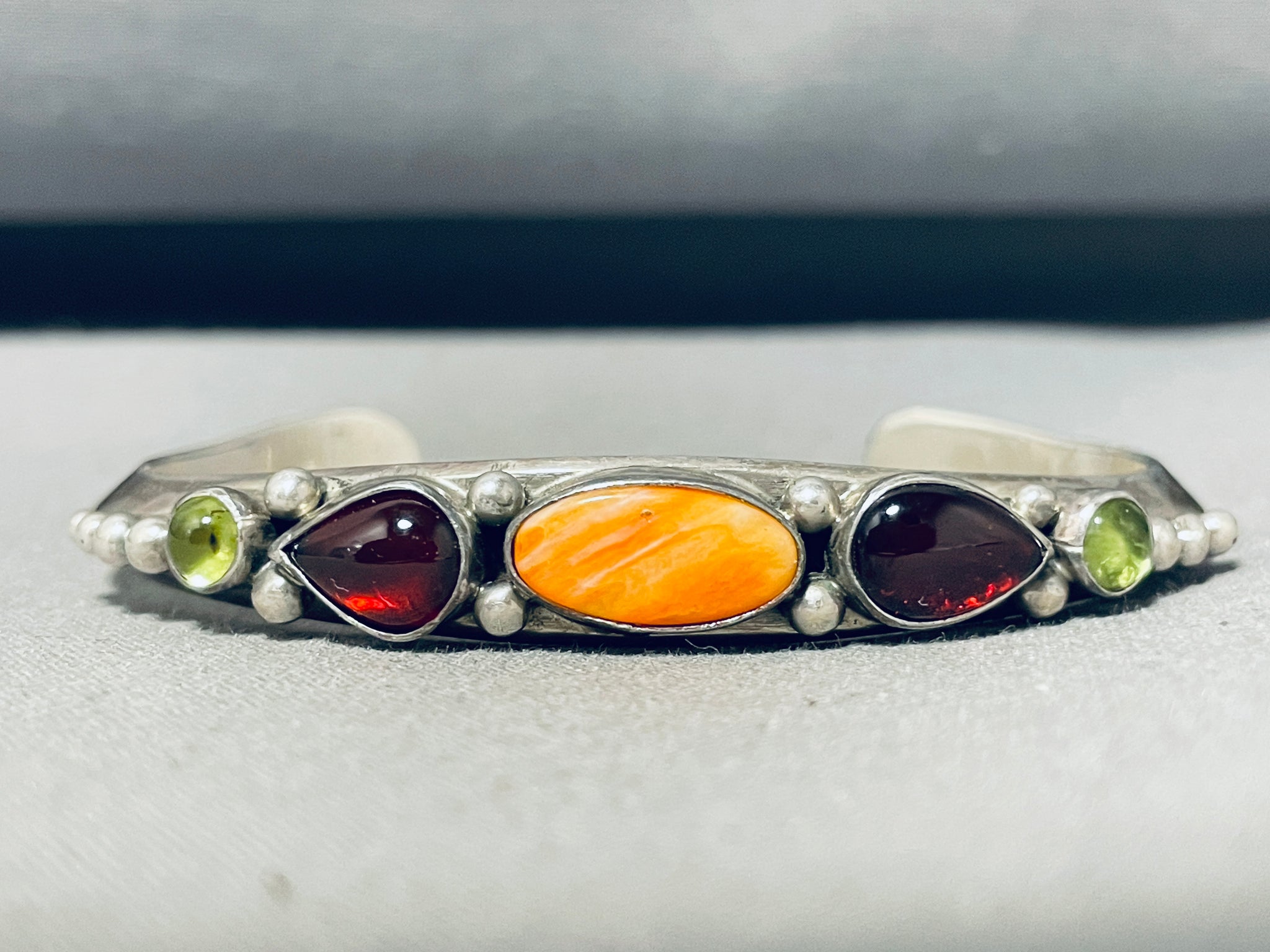 Here we have a stunningly beautiful Navajo silver bracelet featuring a large orange spiny oval center, flanked by garnet teardrops, peridot rounds and dual silver beads on a handcarved solid silver cuff with flared terminal ends! An Absolutely Captivating Piece!