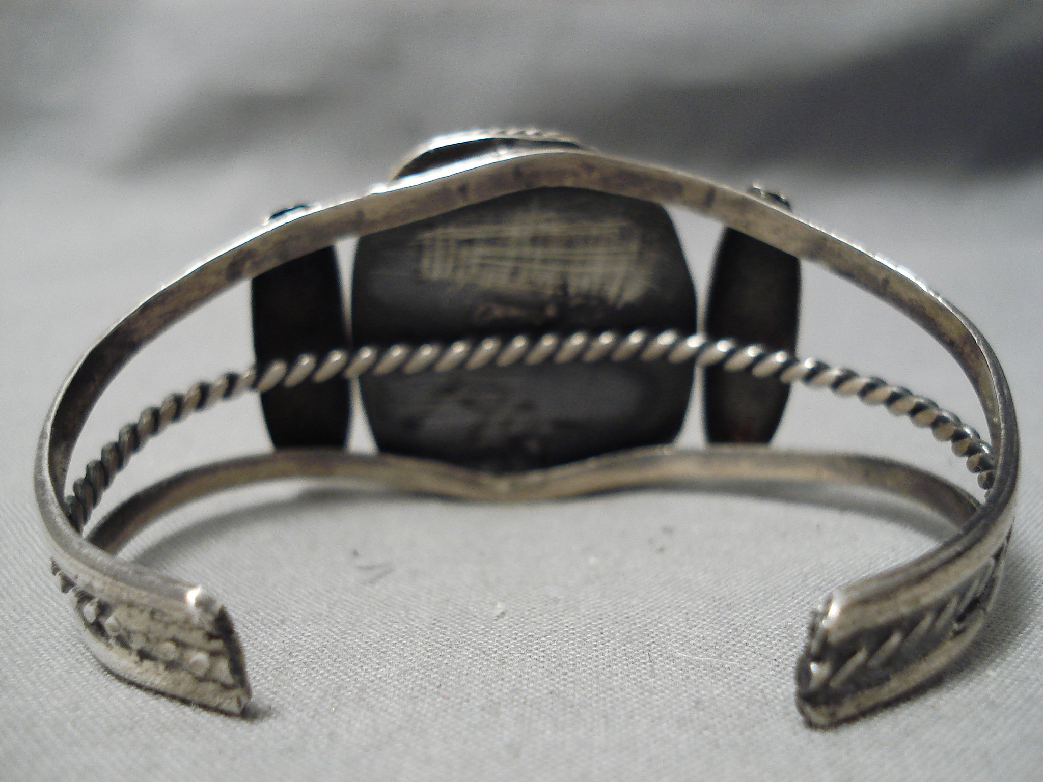 This is a marvelous vintage Navajo single stone silver bracelet. This wonderful bracelet contains a large chunky green turquoise stone that appears to be from the Royston turquoise mine. I just love how the stone protrudes out from the cuff with accenting hand pounded silver flanks. This bracelet consists of a triple silver shank cuff with the center being twisted. The center stone measures around 1-1/4" x 1". The width of the bracelet measures around 1-1/4". Sterling silver. Cir. Mid century . The inside end to end measures around 5" with an additional 1" gap. Sturdy 31 grams.