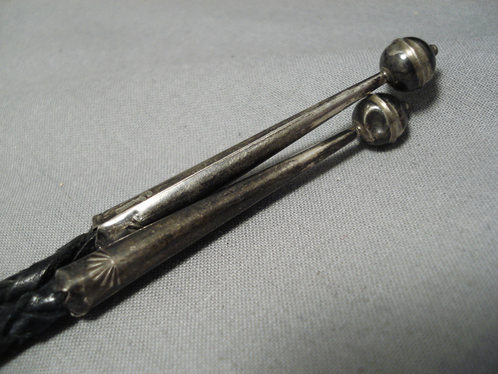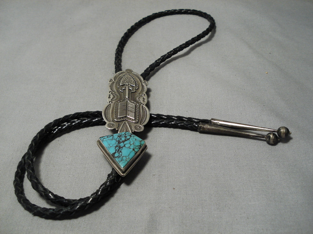 This is an exceptional Navajo opulent turquoise silver bolo tie. This piece contains an extremely unique designed bolo that measures around 4-1/2" X 1-3/8". Resting at the bottom of the bolo is a unique shaped turquoise stone with impeccable spiderweb matrix that measures around 1-1/4" X 1-1/8". The stamp works on the bolo are stunning as they include suns, shells, and arrows. Resting at the bottom of the 44" thick black leather tie are beautiful silver pins. The turquoise stone appears to be from the rare old deposit Crow Springs mine which is far more rare than the new deposit. Signed by Navajo artist, DLK. Sterling silver, marked. Sturdy 71 grams.