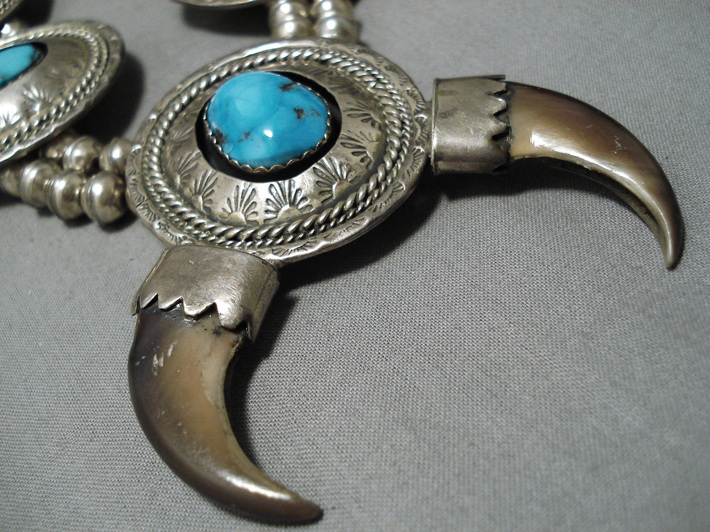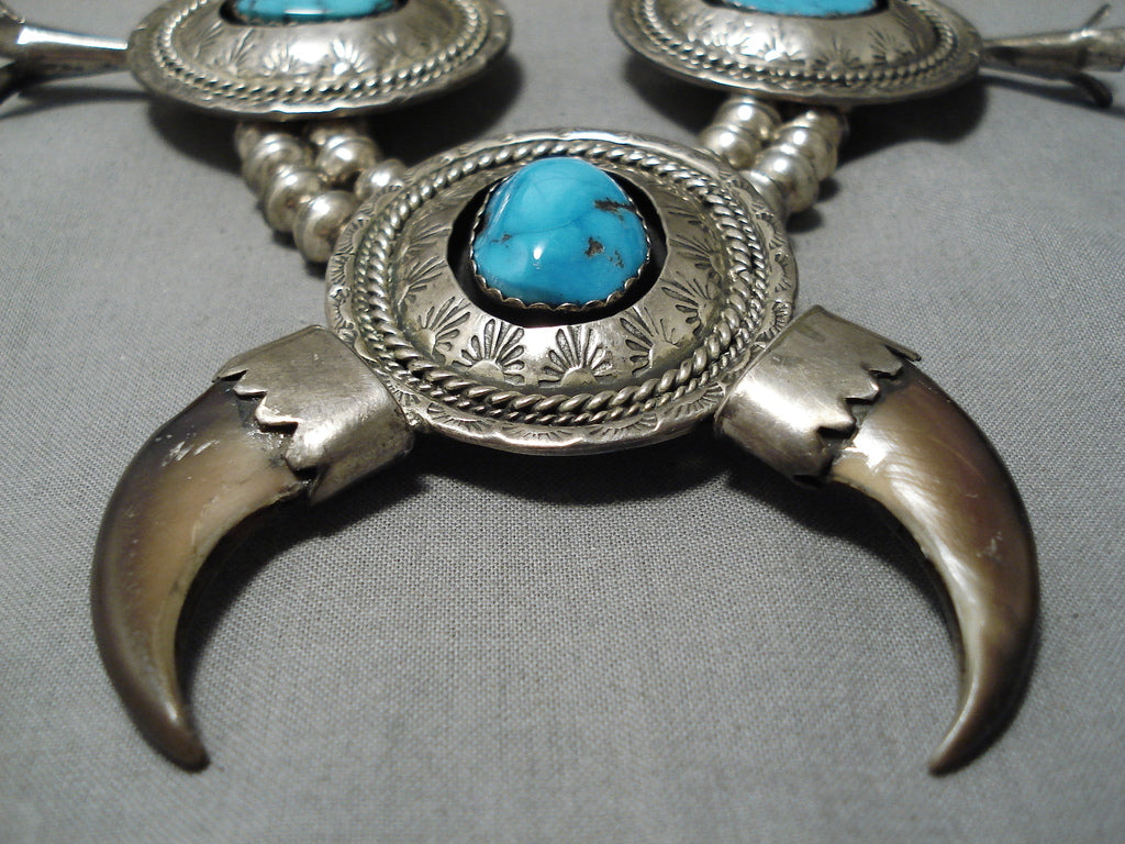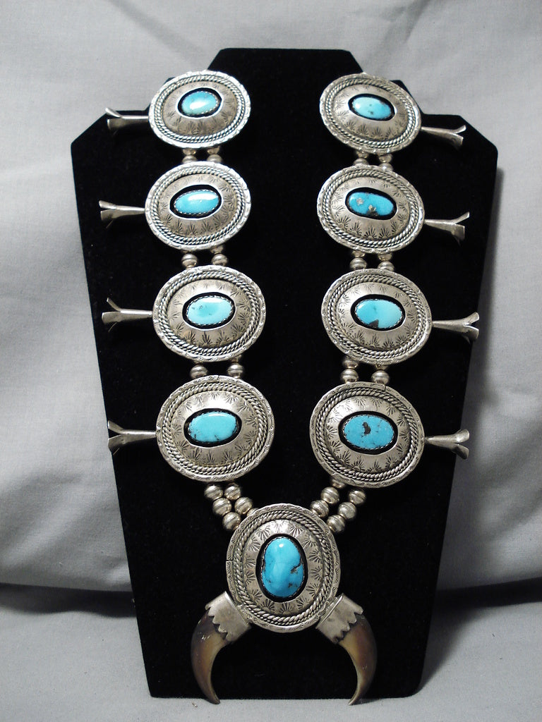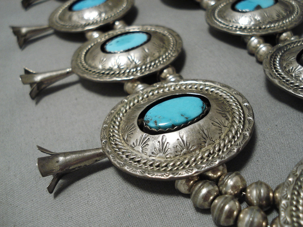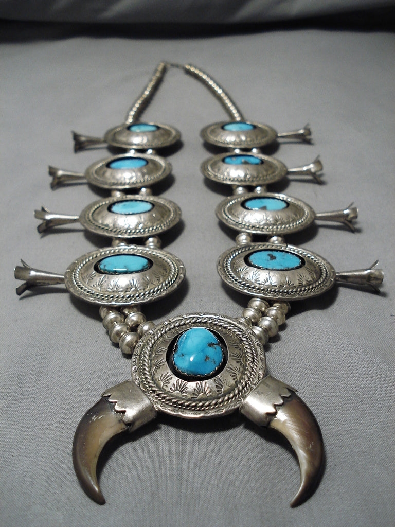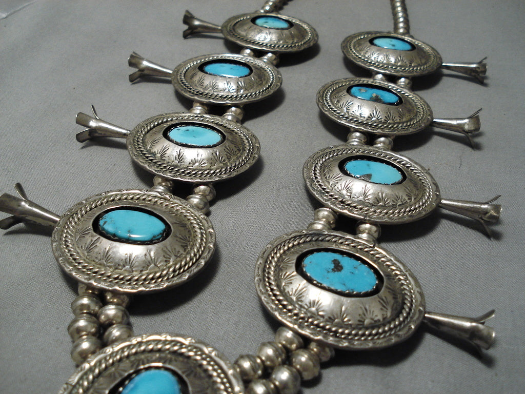 Opulent Vintage Native American Navajo Turquoise Sterling Silver Concho Squash Blossom Necklace