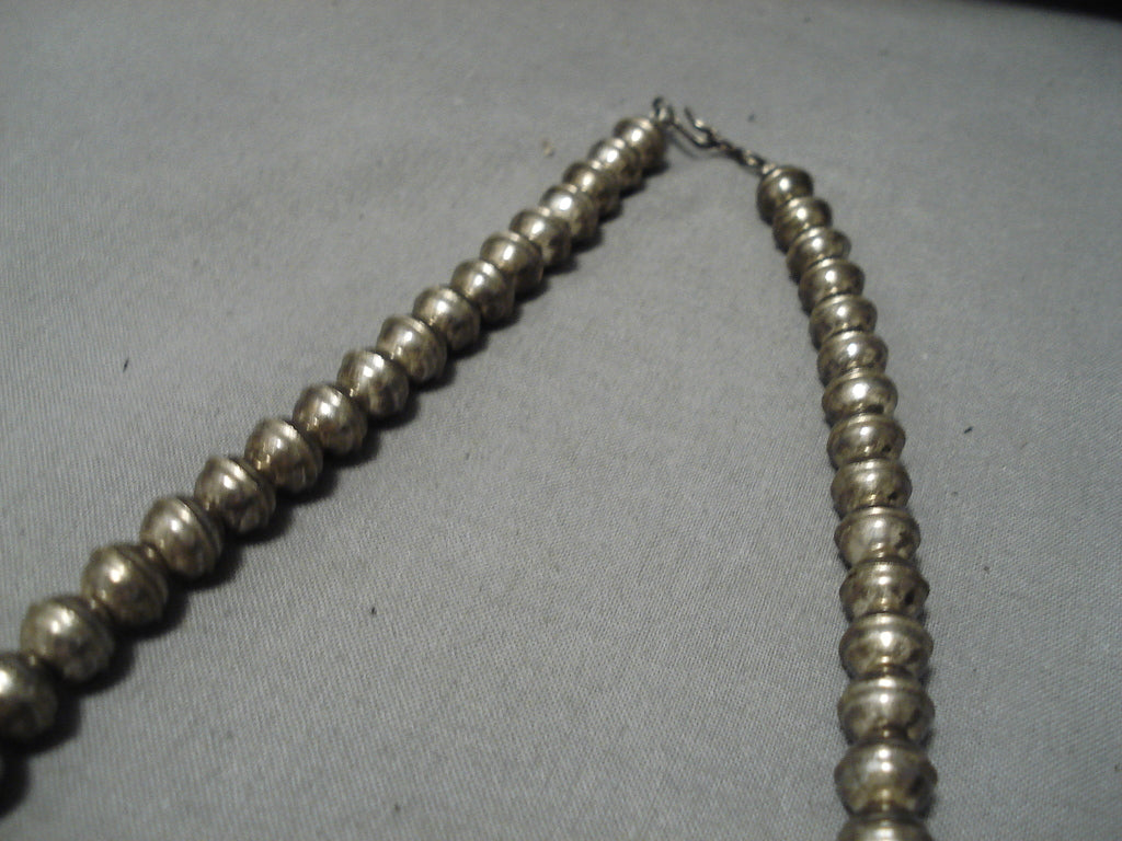 This is an exceptional Navajo turquoise and silver squash blossom necklace. This piece is absolutely stunning as it consists of 9 phenomenal huge hand carved silver concho squashes including the one on the 3" X 2-1/4" naja pendant. Located in each concho is a wonderful large blue old Sleeping Beauty turquoise stone with the largest measuring around 1" X 3/4". The surrounding silver works include ropes and sun patterns. Resting throughout the entire necklace are marvelous round silver beads with a traditional silver clasp. Sterling silver, marked. Cir. Mid century . The length of the necklace measures around 36". Sturdy 260 grams.