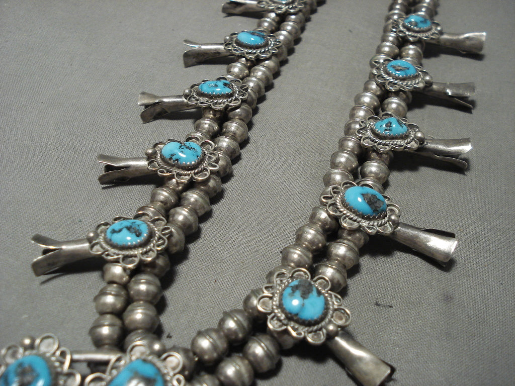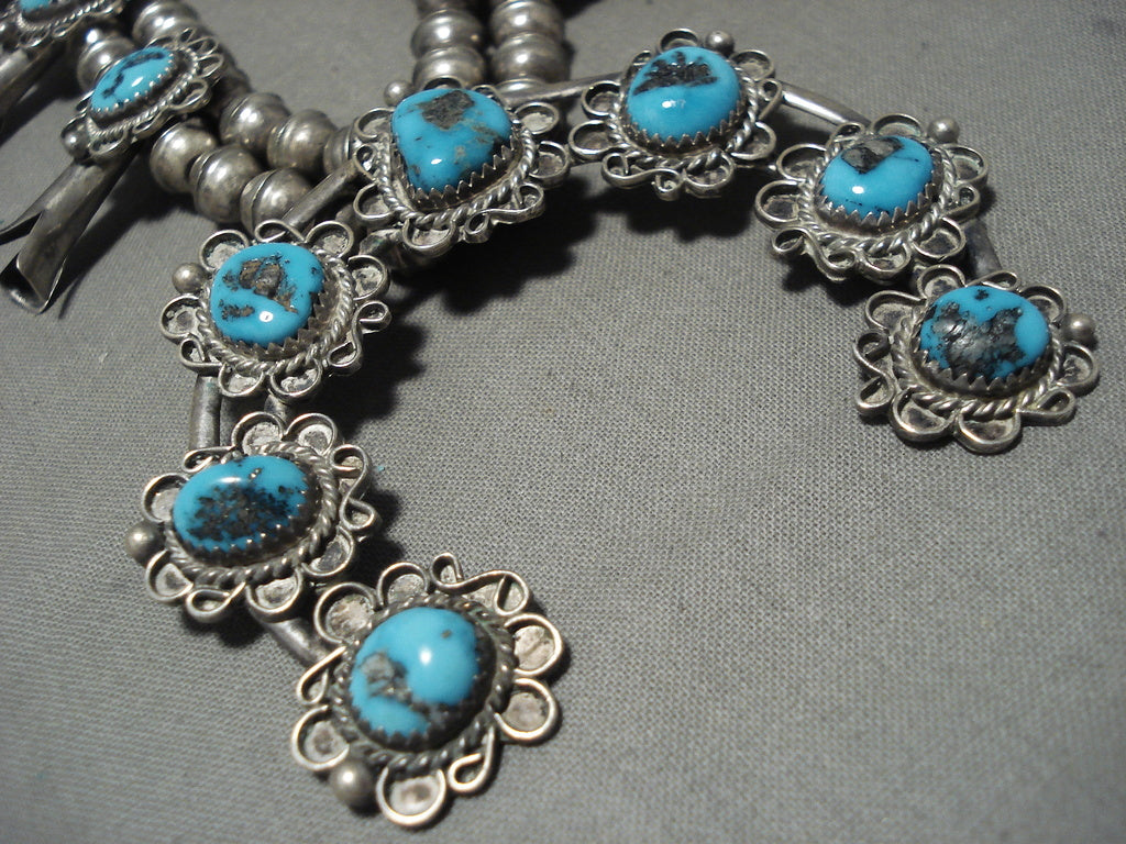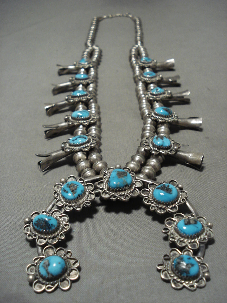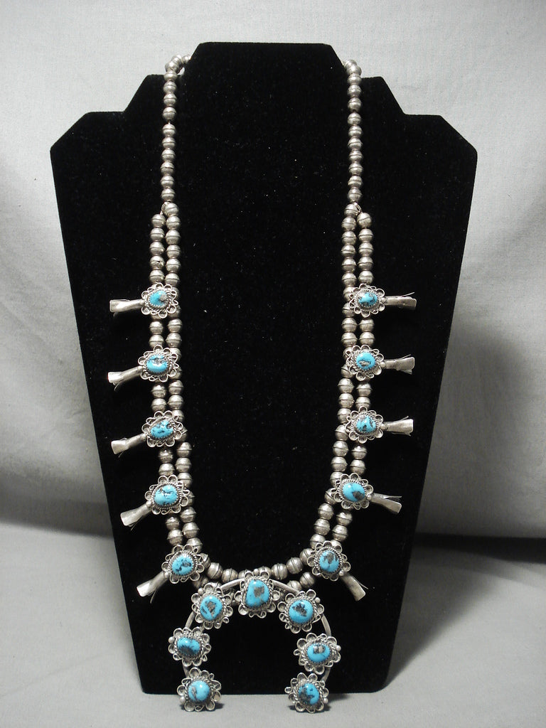 Opulent Vintage Navajo Persin Turquoise Native American Jewelry Silver Squash Blossom Necklace