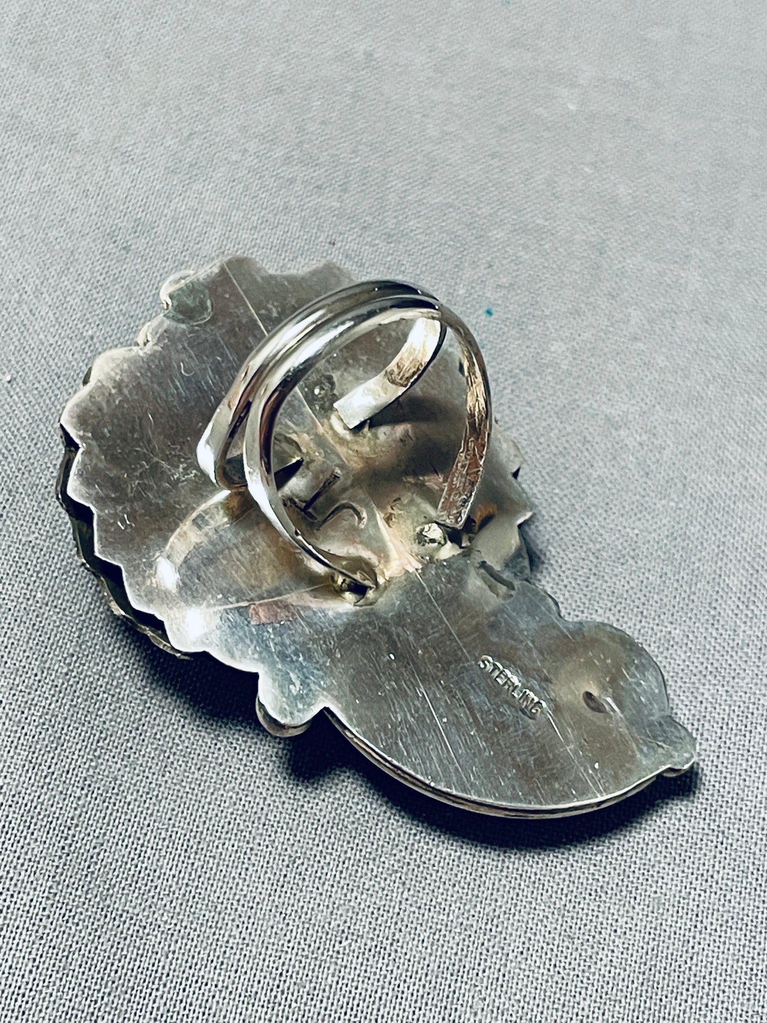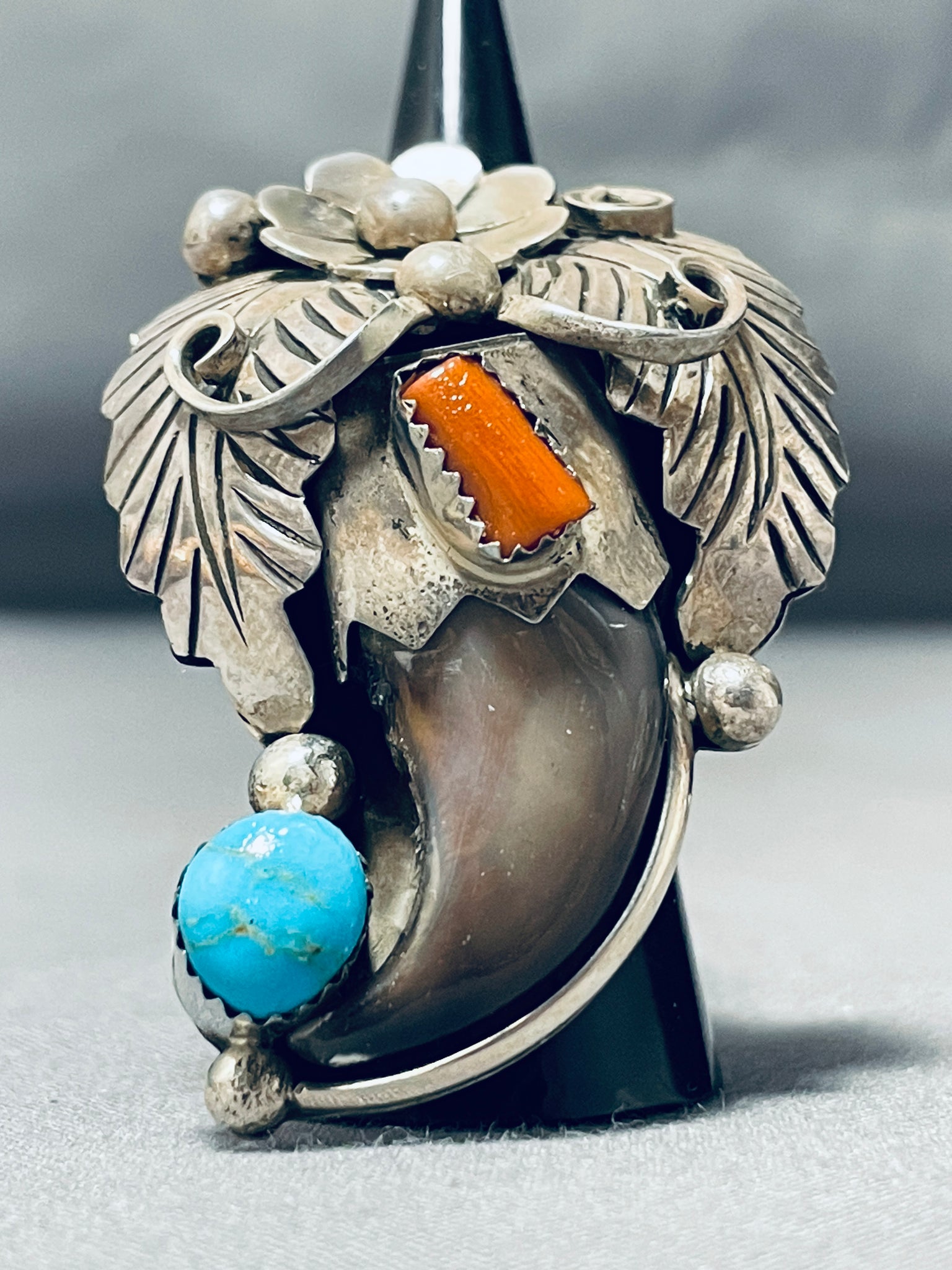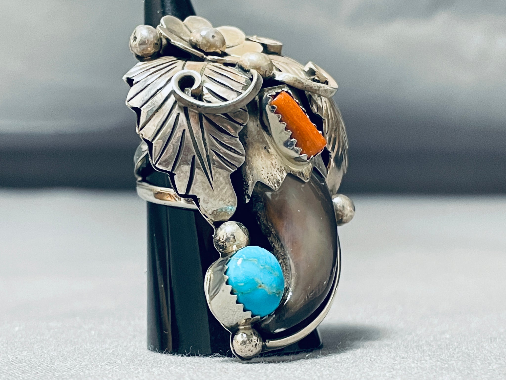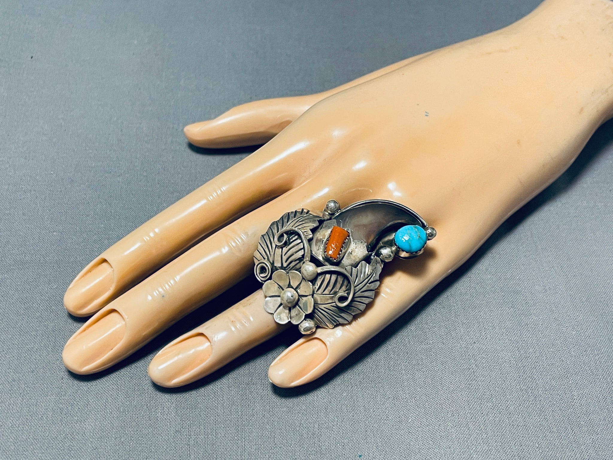 This is an incredible Navajo very large silver ring. This amazing ring contains a large accenting turquoise stone with an accenting coral stone. Beautifully situated on the very large face of the ring are marvelous large hand carved silver leaves, flowers, stems, and raindrops. I absolutely love the silver works on this ring, so very impeccable. The largest stone measures around 3/8" x 1/4". The ring face measures around 2" x 1-1/4". Signed by Navajo artist, Jer Thompson. The ring size is around 6. Cir. 1970's+. Sterling silver. Sturdy 17 grams.