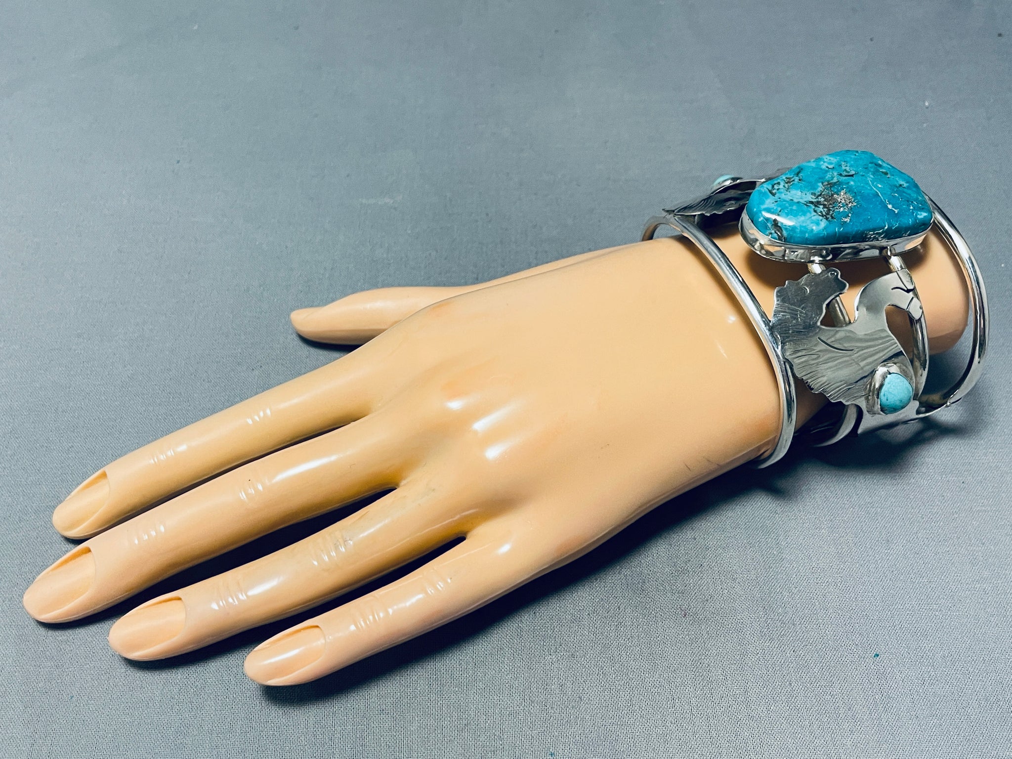 This is a magnificent Navajo large three stone silver horse bracelet. This wonderful bracelet contains three impressive large and chunky turquoise stones with the two outer stones being from the wonderful Sleeping Beauty turquoise mine and the center largest stone being from the incredible Morenci turquoise mine. What I really love about this bracelet is that it contains two mirrored beautiful galluping horse flanks. Each remarkable horse measures around 2-1/2" X 1-3/8". This bracelet contains a phenomenal heavy and thick quadruple silver shank cuff with each shank being rounded for a more comfortable fit. The center stone measures around 1-5/8" x 1". The width of the bracelet measures around 2-1/8". Sterling silver, marked. The inside end to end measures around 5-3/4" with an additional 1" gap. Sturdy 103 grams.