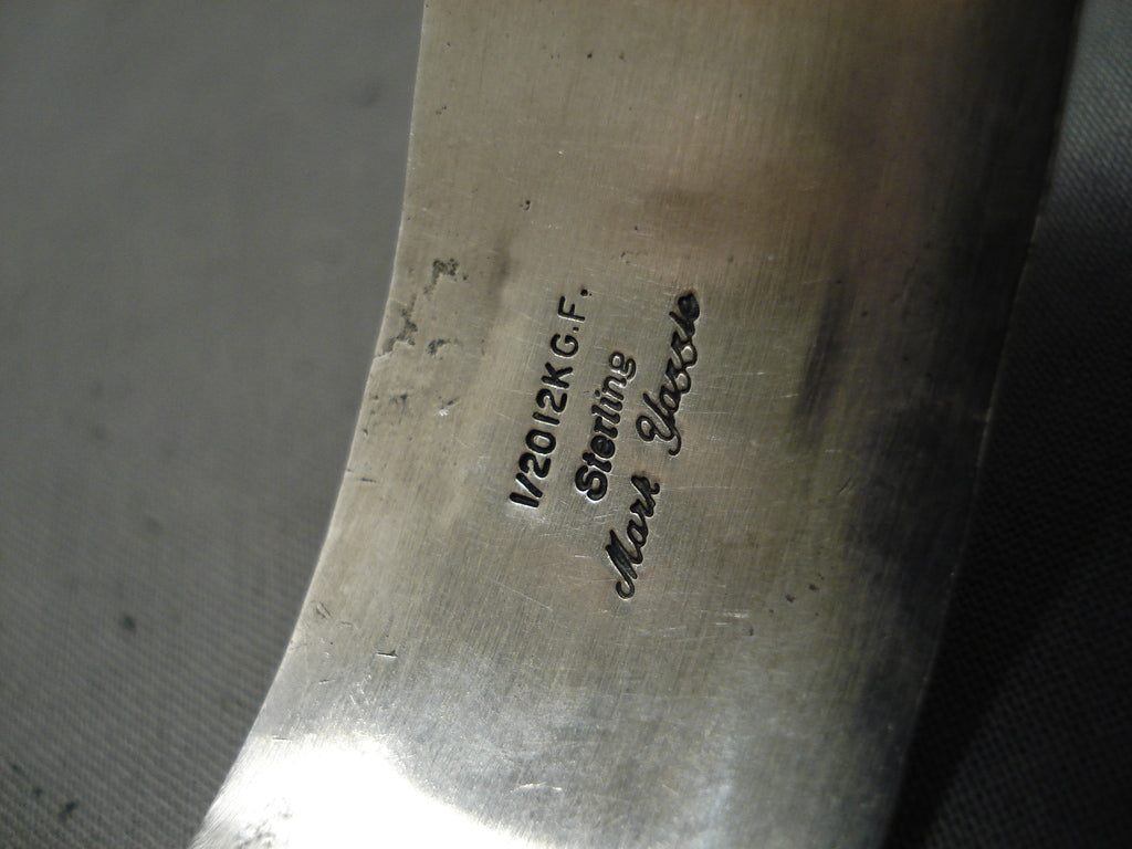 This is a museum quality Navajo silver and gold bracelet handmade by the famous artist, Mark Yazzie. This piece contains real gold plated feather works that run through the center of the heavy and thick silver cuff. Bordering the edges of the bracelet are deep silver waving patterns with accenting silver ropes. Check out how Mark hand carved a feather on one end of the cuff. The width of the bracelet measures around 7/8". Signed by Navajo artist, Mark Yazzie . Sterling silver, marked. The inside end to end measures around 5-3/4" with an additional 1-1/4" gap. Sturdy 67 grams.