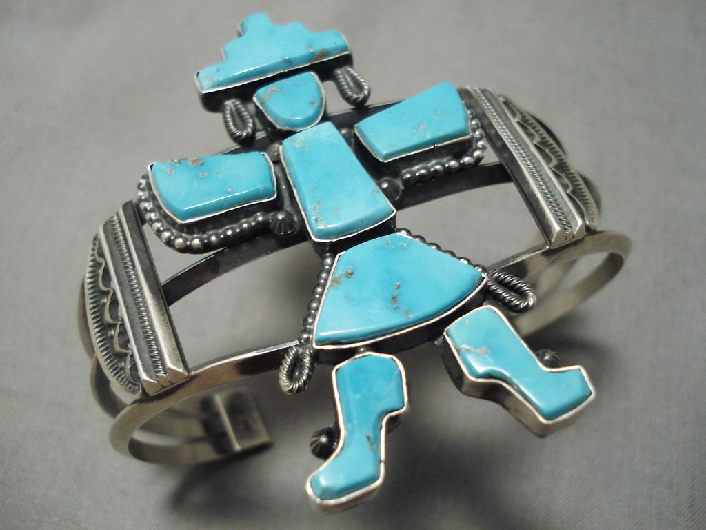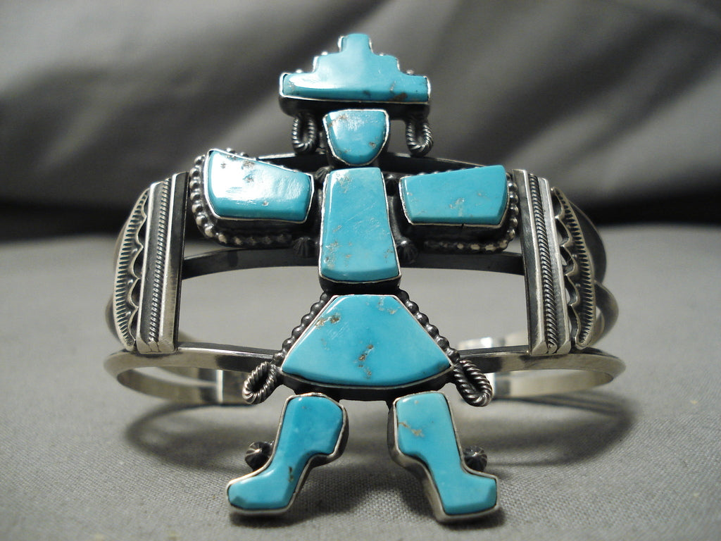 Quality Native American Navajo Freddie Maloney Kachina Turquoise Sterling Silver Bracelet