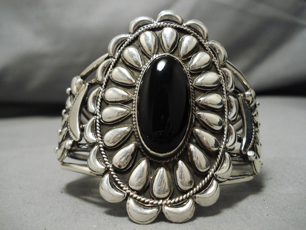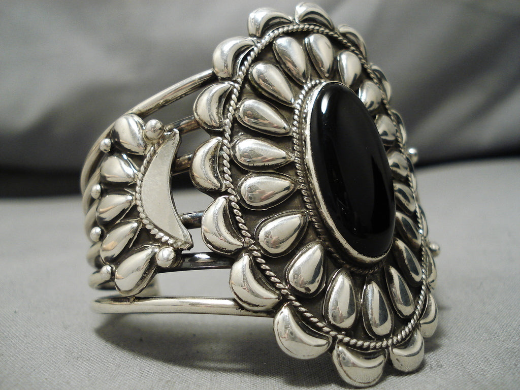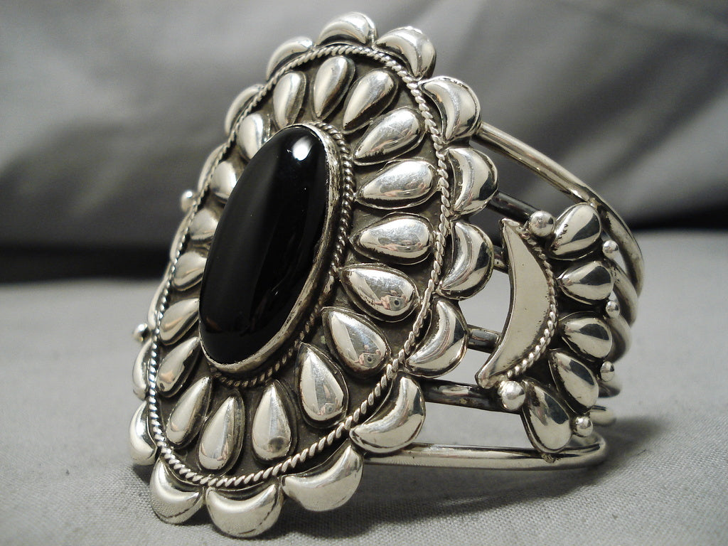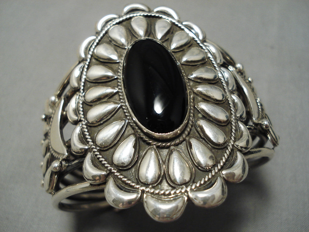 This is an astonishing Navajo hand repoussed silver bracelet. This fabulous piece contains remarkable repoussed silver works with accenting silver ropes and raindrops. Located in the center medallion is a huge dome shaped onyx stone. This bracelet consists of a wonderful rounded 6 silver shank cuff. The center stone measures around 1-1/8" x 5/8". The width of the bracelet measures around 1-3/4". Signed by Navajo artist, Lest James . Sterling silver, marked. The inside end to end measures around 5-1/2" with an additional 1" gap. Sturdy 92 grams.