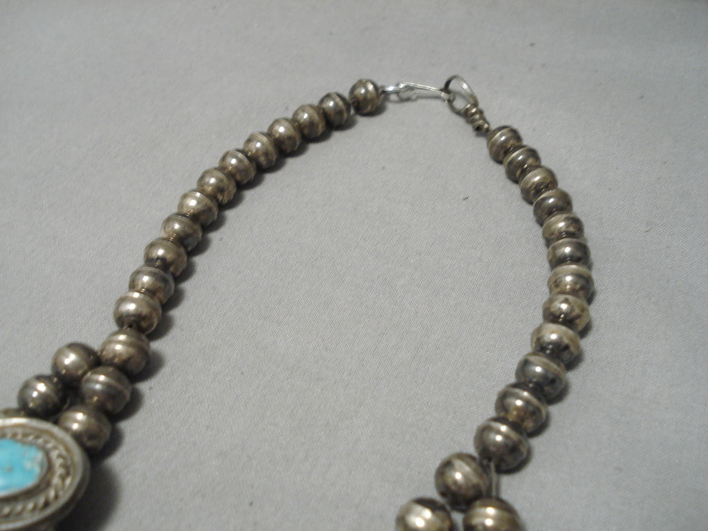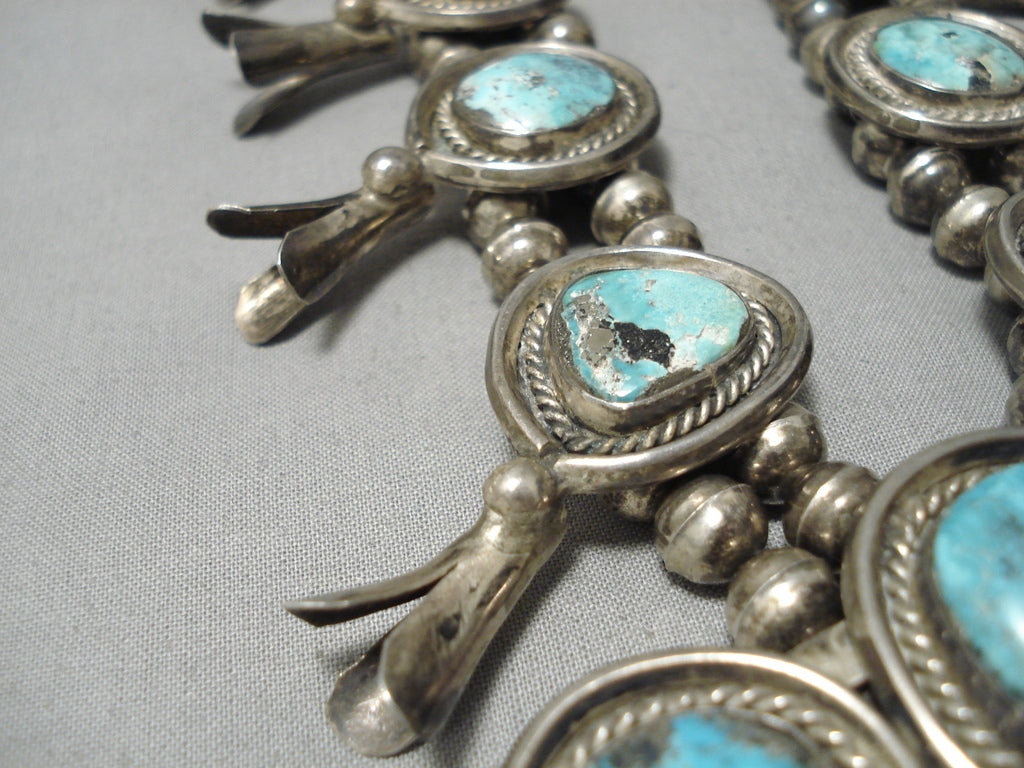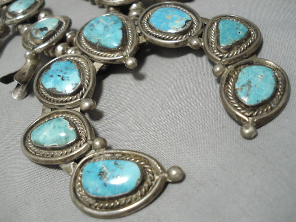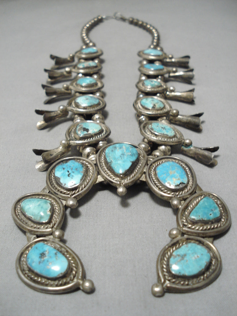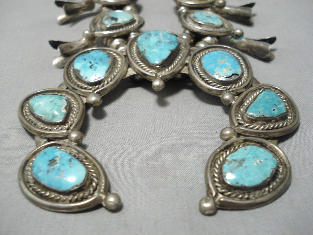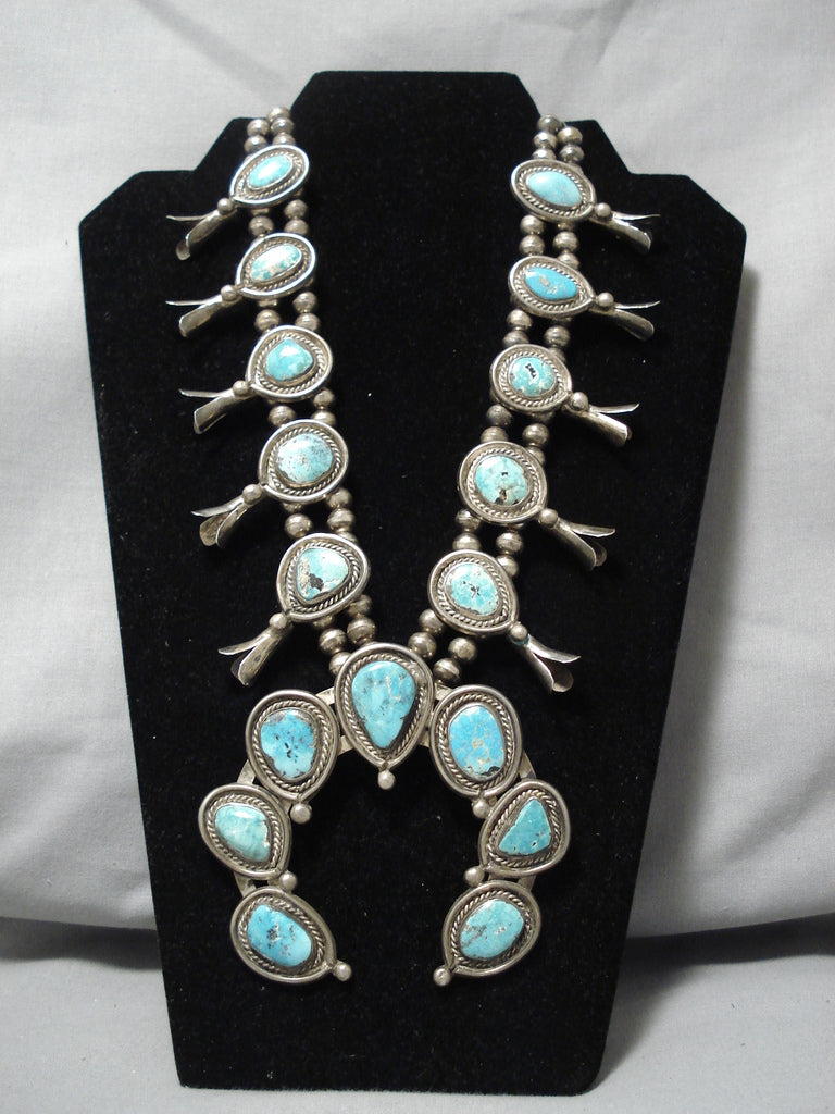 Quality Vintage Native American Navajo Turquoise Sterling Silver Squash Blossom Necklace Old