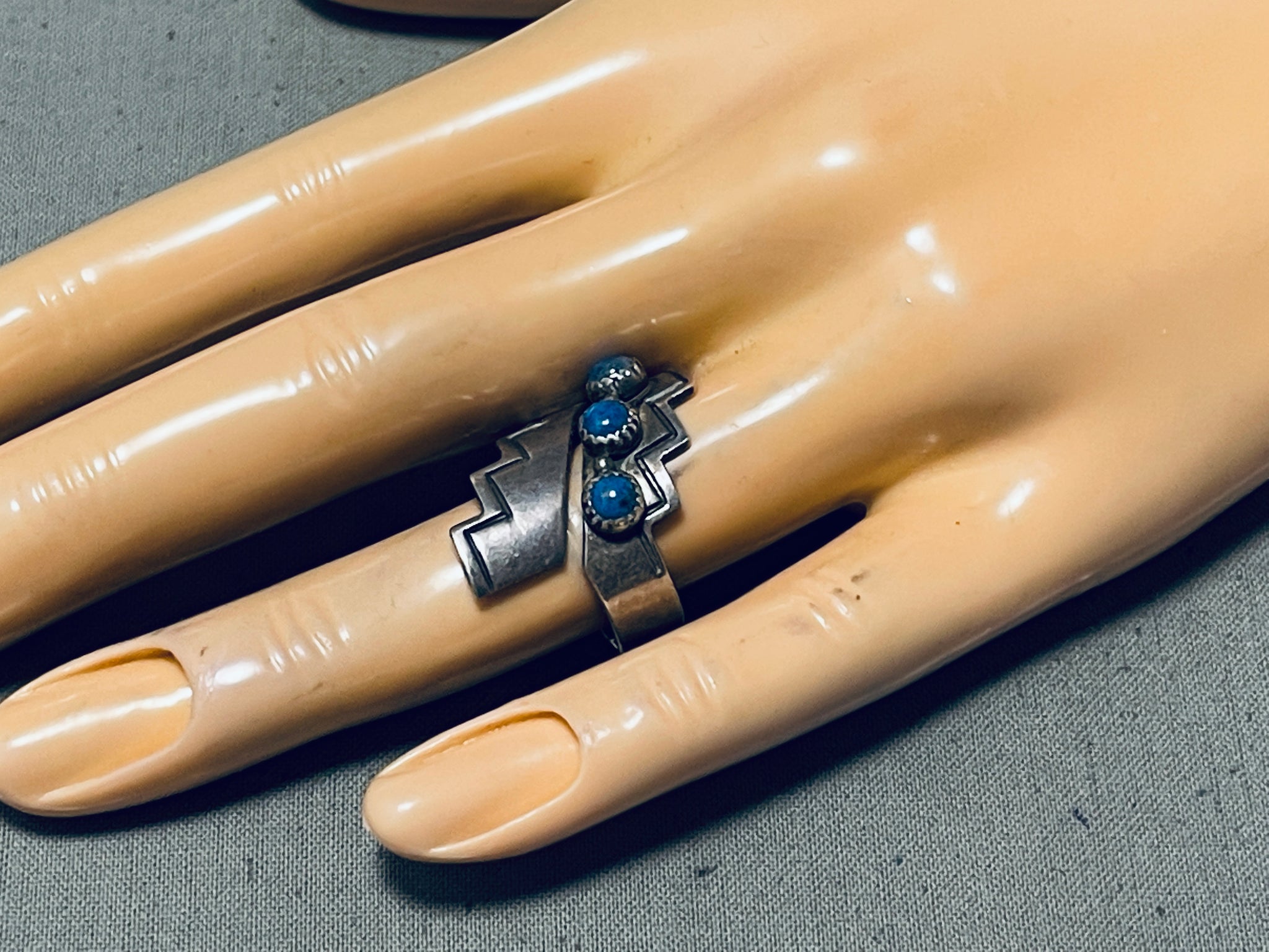 This is an impressive vintage Navajo three stone adjustable silver ring. This impeccable ring contains outstanding workmanship that includes geometric patterns, stone work and silver works located throughout. Not only is this ring unique in the design work but also that it can be adjusted in size if desired by simply squeezing together or pulling apart the shank. Located on the ring are three beautiful lapis stones with accenting raindrops. Also situated throughout the ring are stunning geometirc patterns. The ring as is measures to be a size 7 but again can be adjusted by hand. The stones measure around 1/8" x 1/8". The ring face measures around 3/4" x 3/4". Signed by Navajo artist, Joe Delgarito . The ring size is around 7. Cir. 1970's+. Sterling silver, marked. Sturdy 4 grams.