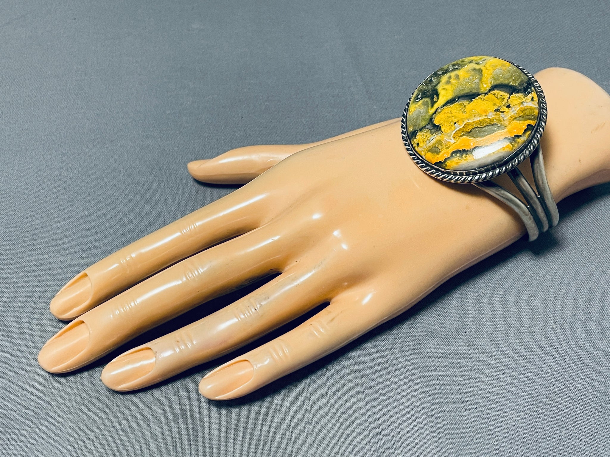 This is a magnificent Navajo large single stone silver bracelet. This impeccable bracelet contains a very large rounded Bumble Bee Jasper stone. Surrounding the stone is a marvelous thick silver rope. This bracelet contains a phenomenal thick and sturdy triple silver shank cuff. I absolutely love the beauty this bracelet contains with the vibrant yellow coloration. The center stone measures around 1-3/4" x 1-3/4". The width of the bracelet measures around 1-7/8". Signed by Navajo artist, Sam Edsitty. Sterling silver, marked. The inside end to end measures around 5-3/4" with an additional 1-1/4" gap. Sturdy 66 grams.