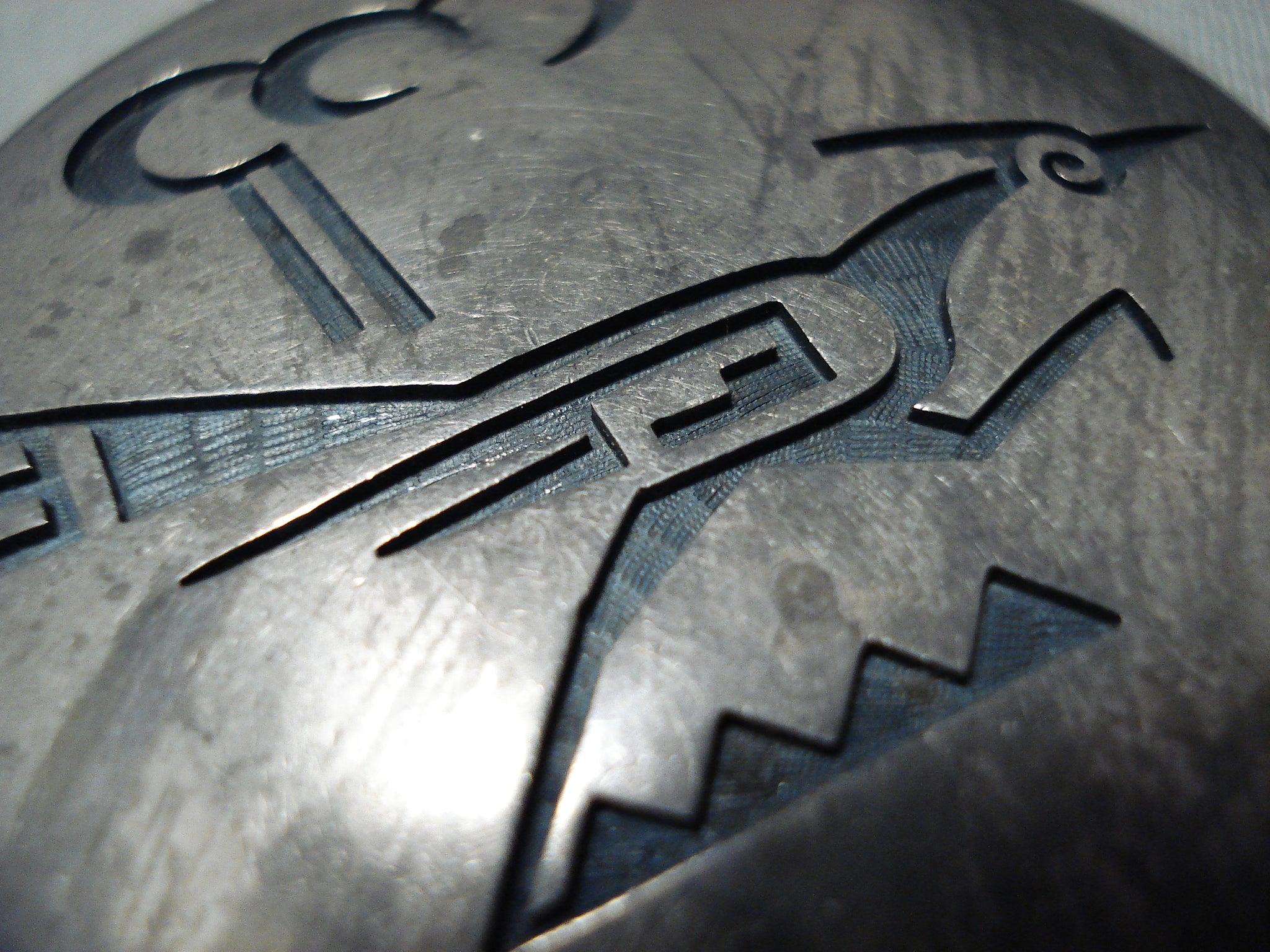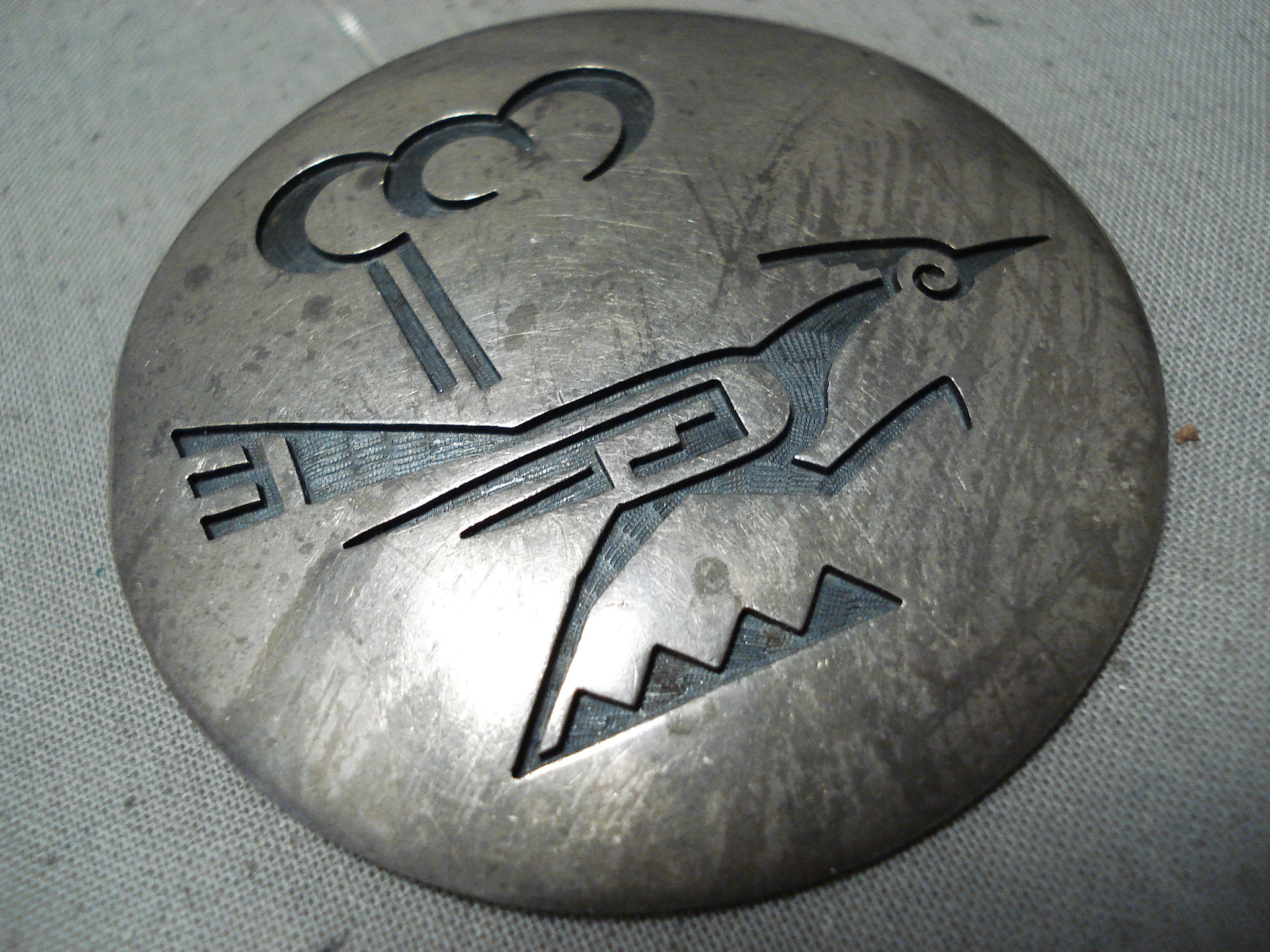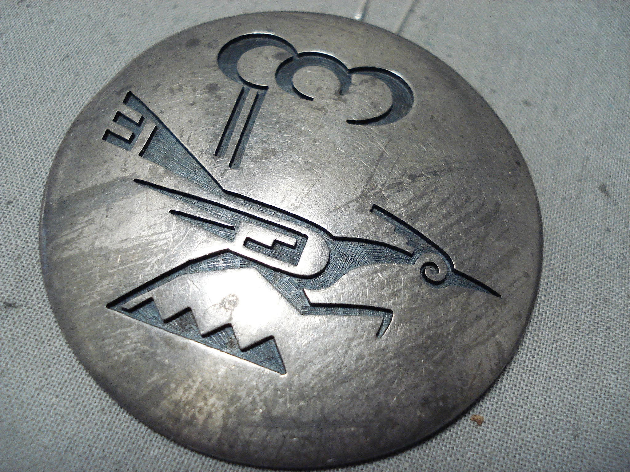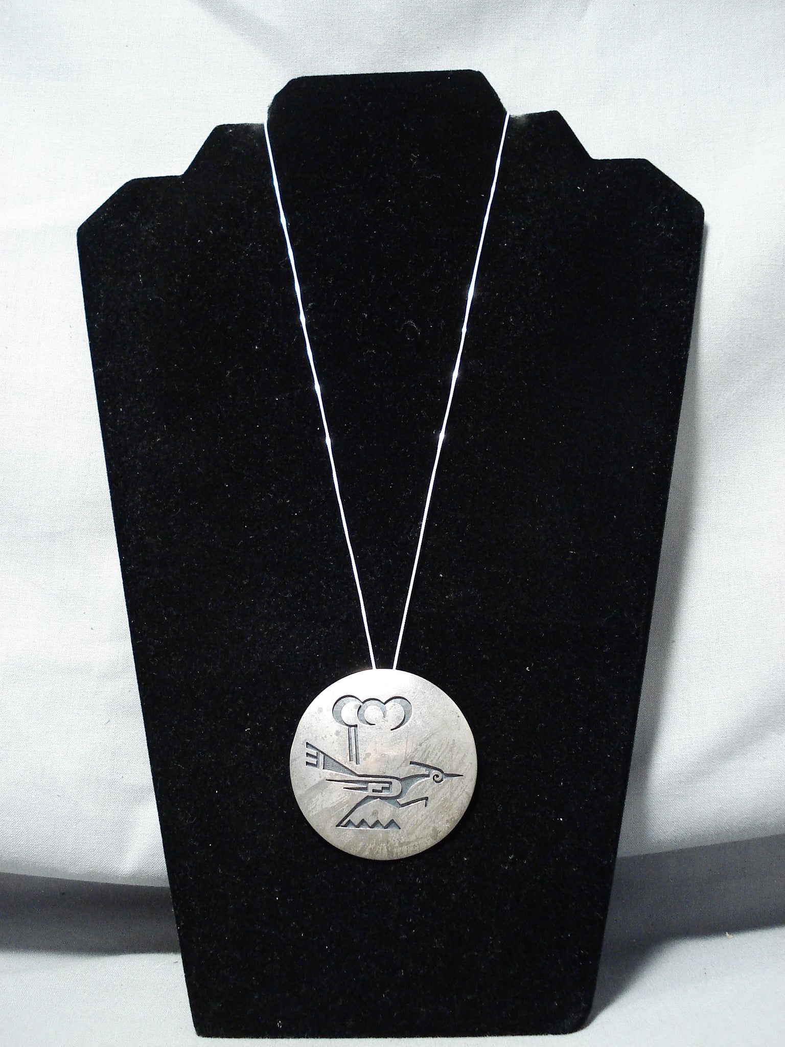 We are proud to offer this fascinating vintage Hopi silver necklace/ pin having a handcarved round convex silver pendant with a deep handcarved silver roadrunner! The necklace / pin has a silver chain with a handmade silver clasp. Truly Exceptional! The silver pendant measures about 2" x 2". Sterling silver. Sturdy 29 grams. Rare Hopicrafts signed piece.