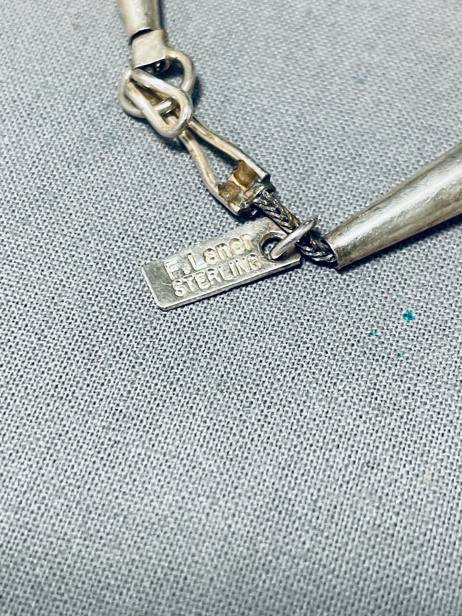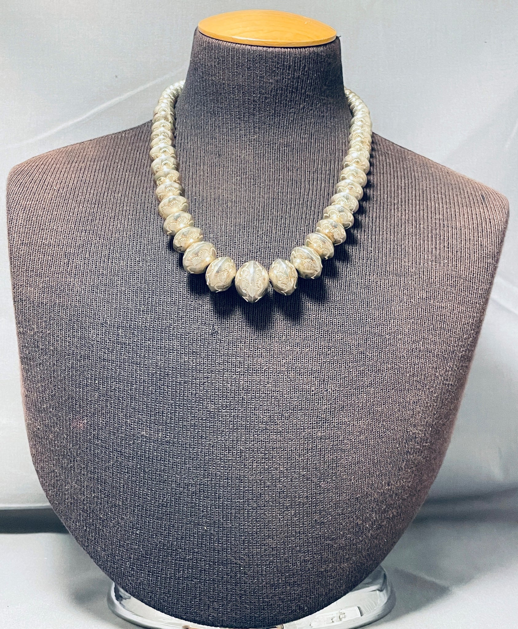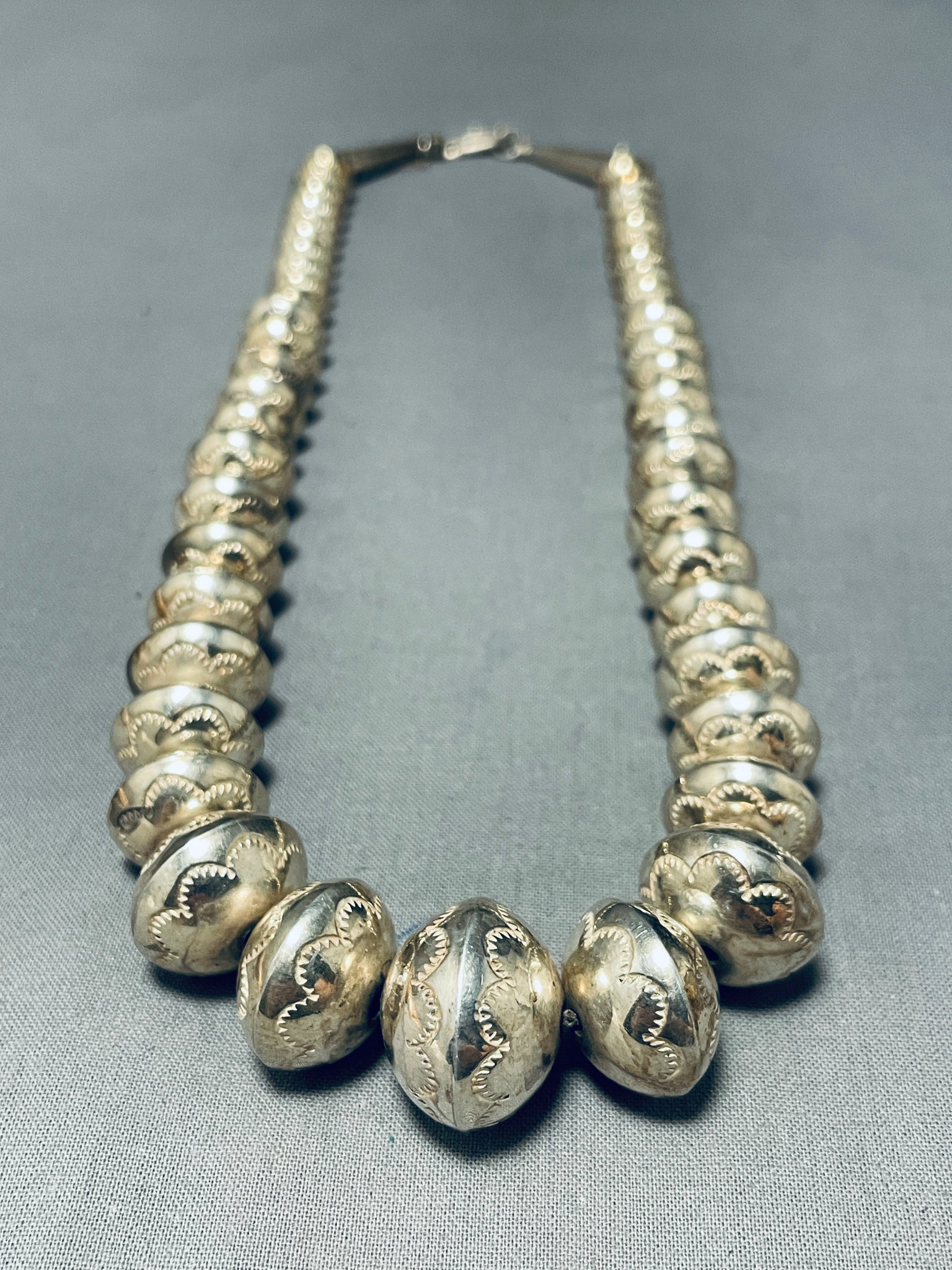 This is a striking Navajo all silver bead necklace. This wonderful necklace contains a beautiful plethora of handmade round graduating silver beads that graduate in size towards the bottom. The smallest bead measures around 3/8" in diameter while the largest measures around 7/8" in diameter. Located on every single bead are impressive hand stamped sun stampings, which is really rare to find on every single bead of a silver bead necklace. Usually stampings on the beads consist on the bottom half of the beads not all of the beads. Resting at the top of the necklace are silver cones with traditional silver clasp. I love that this necklace contains a marvelous signed silver tag near the clasp, very rare to find on necklaces. Sterling silver, marked. Cir. 1970's+. Signed by Navajo artist, F. Laner. The length of the necklace measures around 18". Sturdy 77 grams.