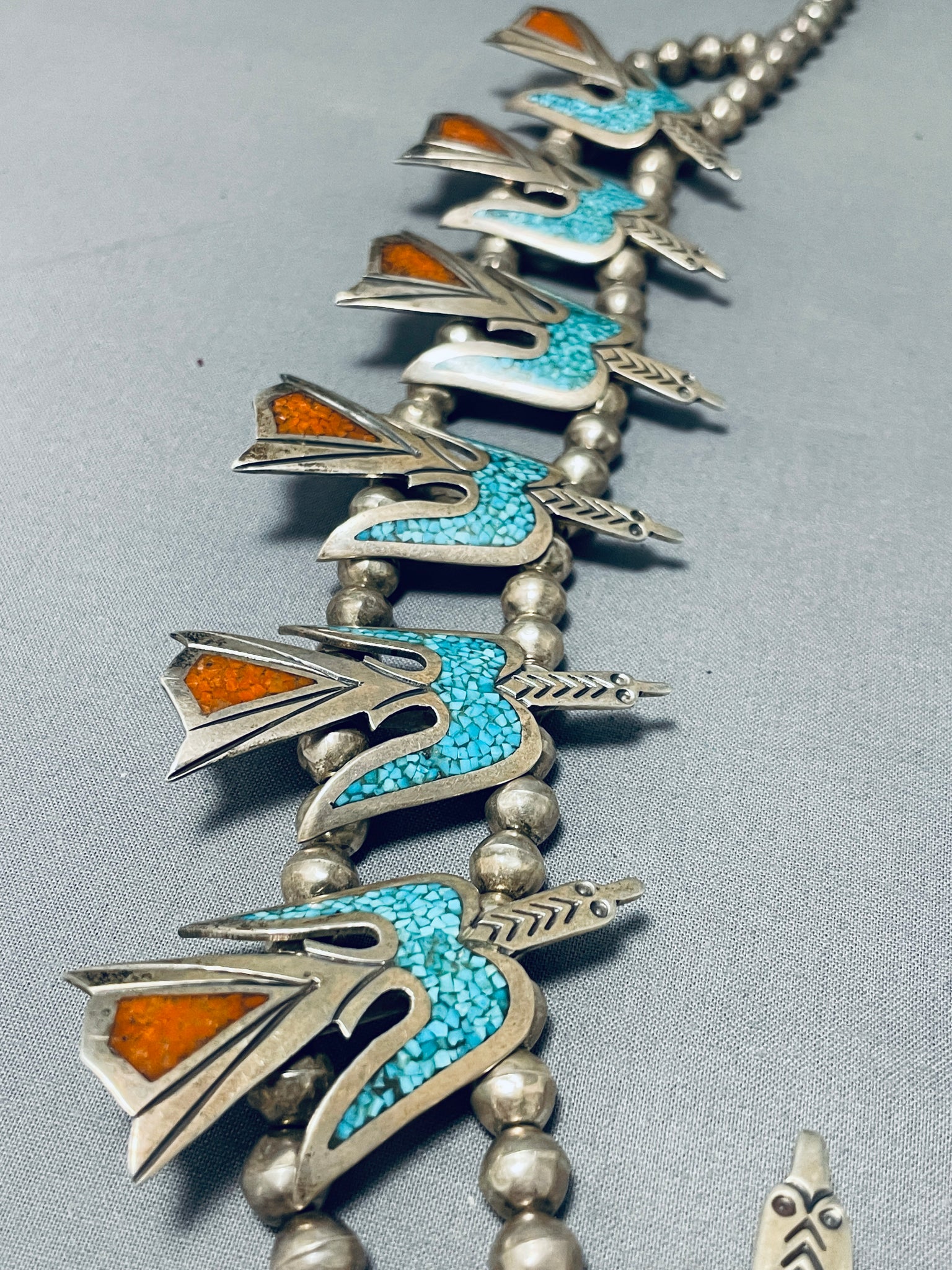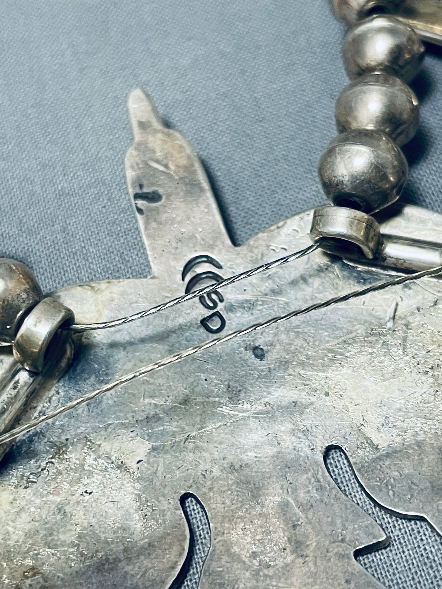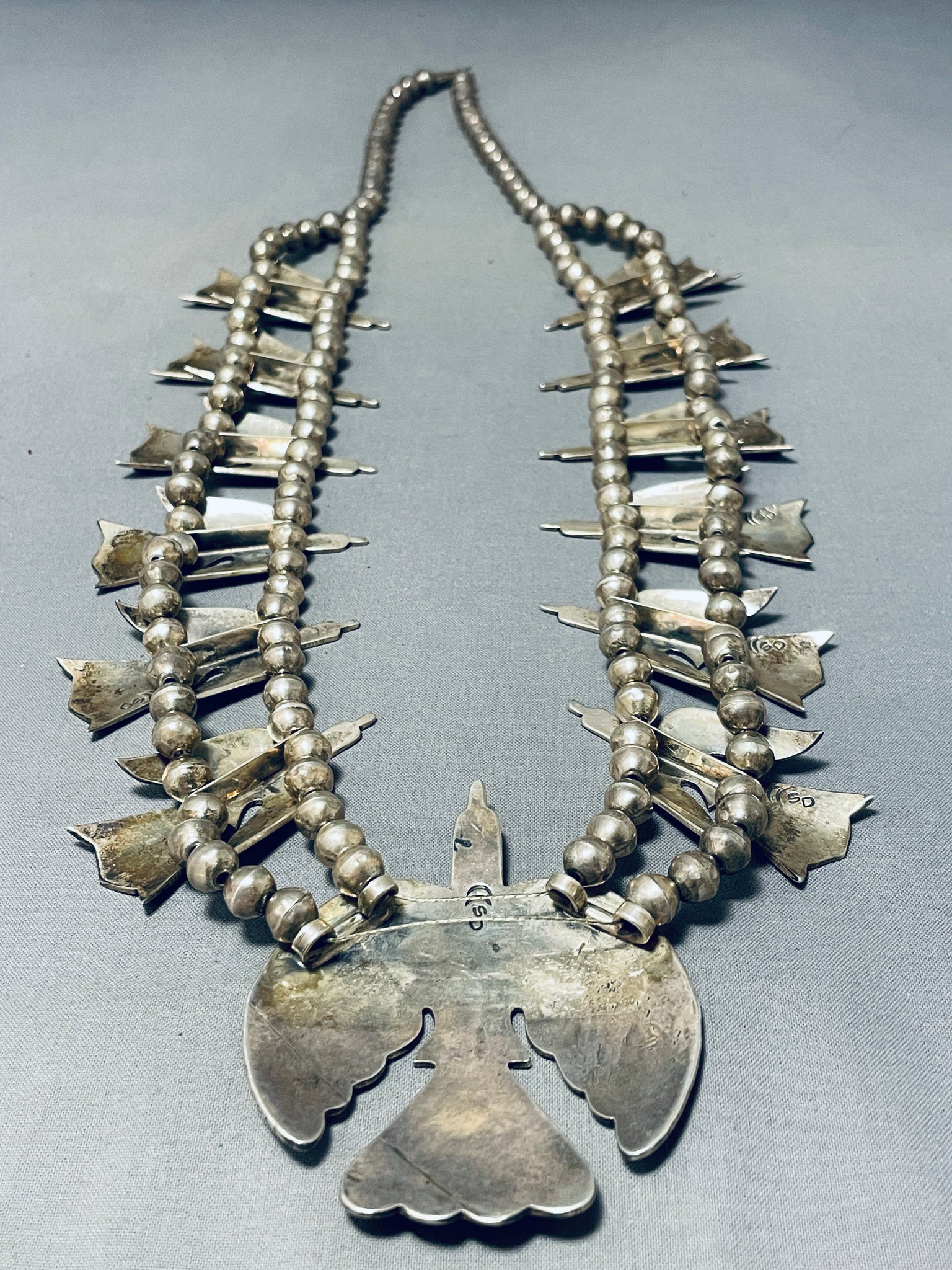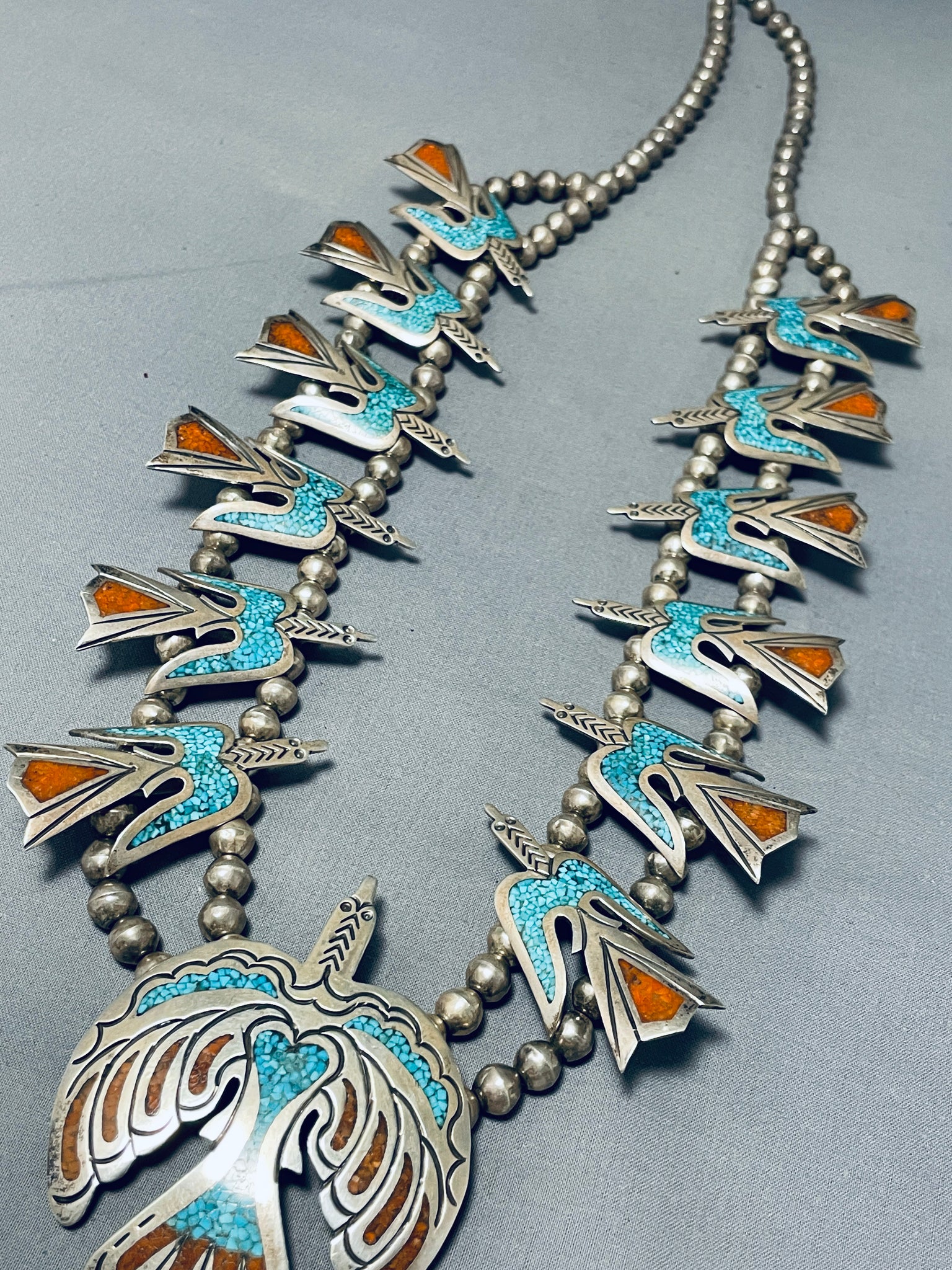 Rare Singer Vintage Native American Navajo Turquoise Sterling Silver Squash Blossom Necklace