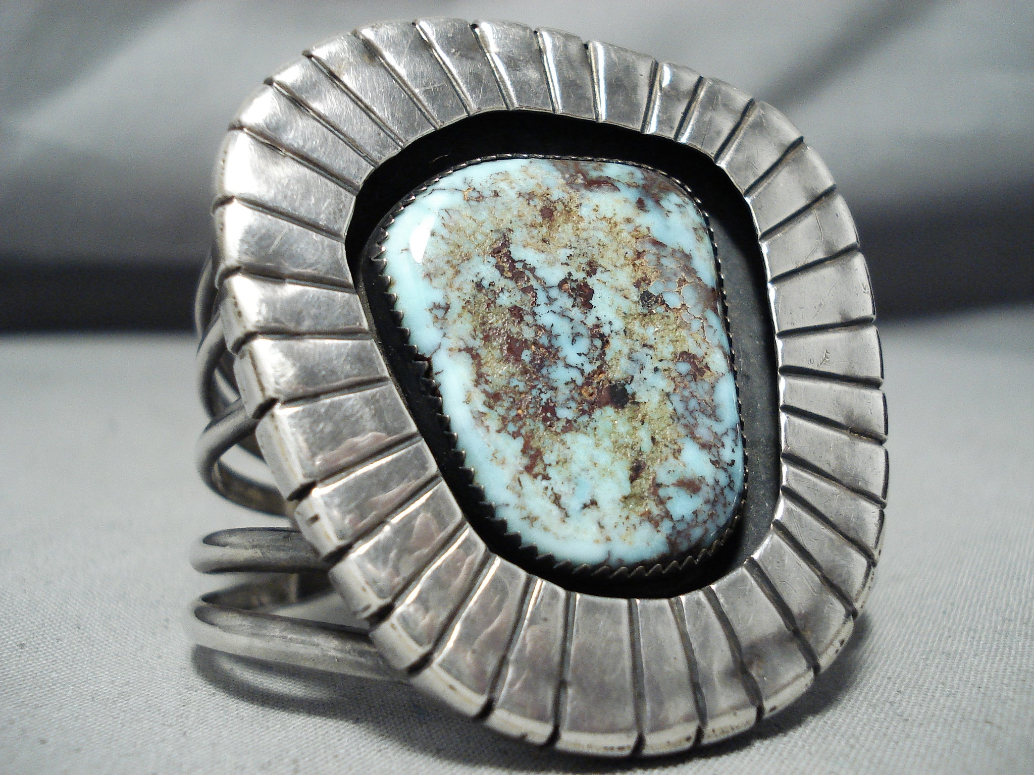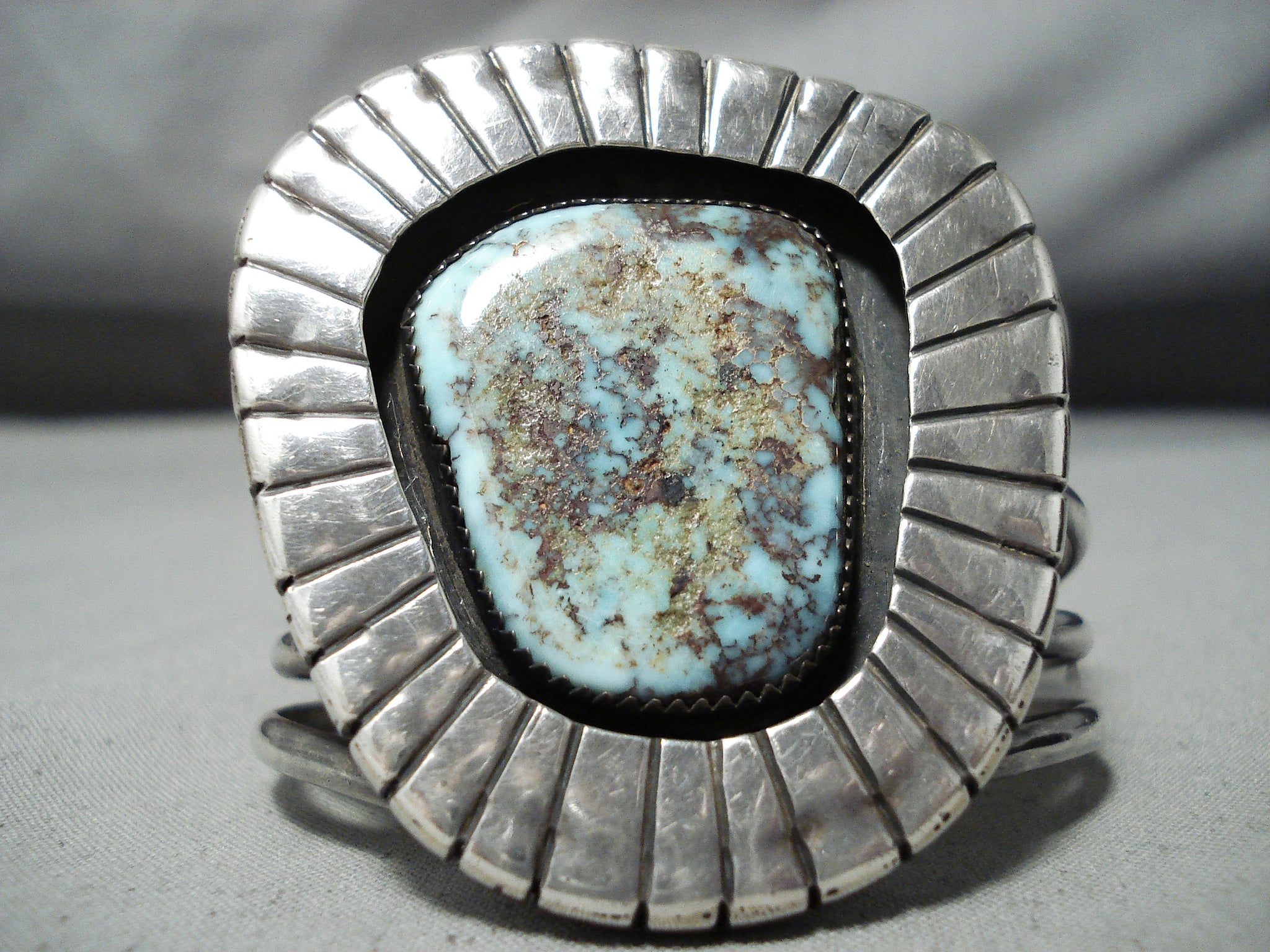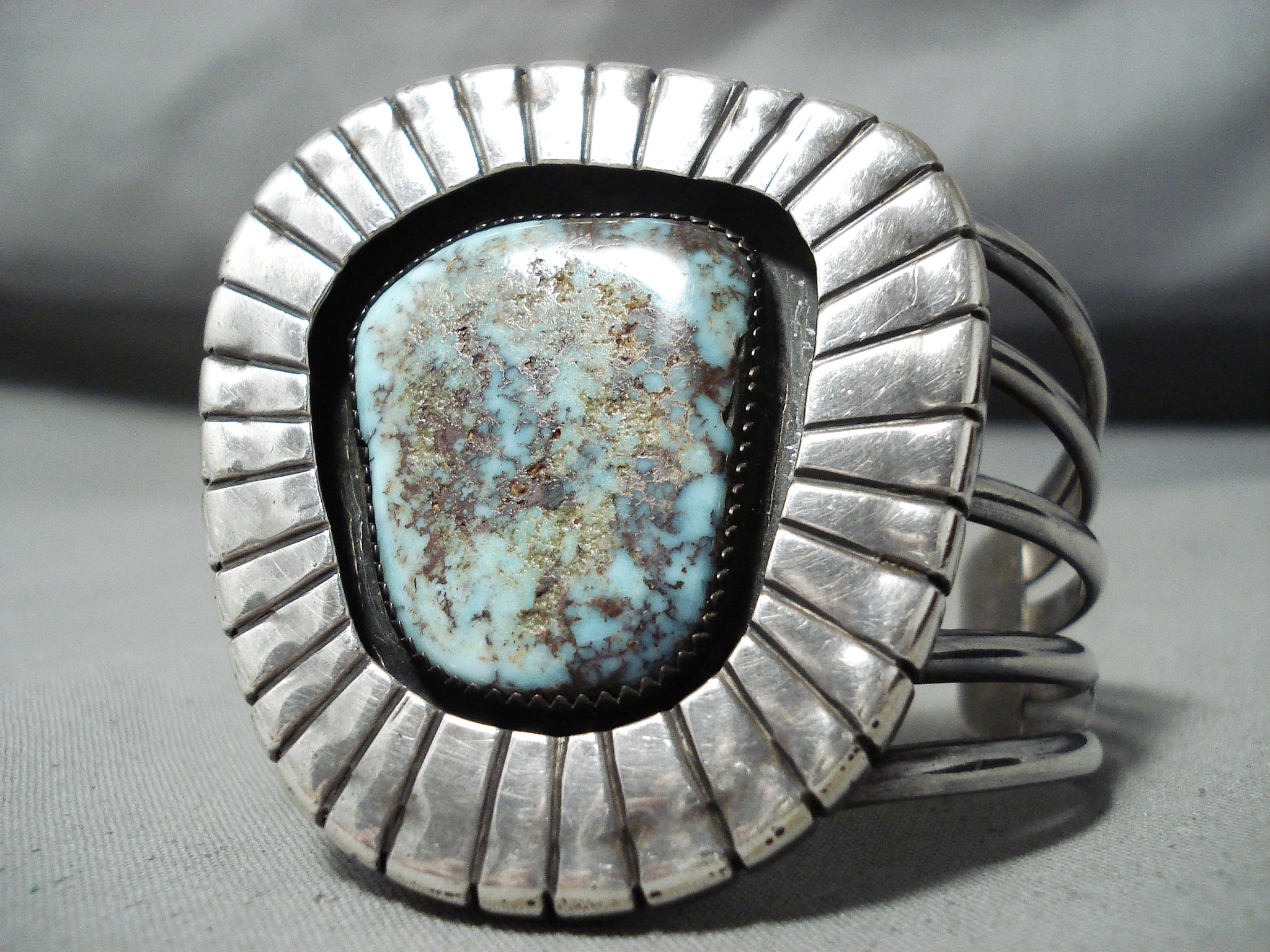 This is a magnificent vintage Navajo large single stone silver bracelet. This wonderful bracelet contains a stunning very rare Gilbert turquoise stone that is beautifully placed in a shadowbox setting. Surrounding the stone are phenomenal sun bursting patterns that go around the entire stone. This bracelet includes a wonderful five silver shank cuff. The center stone measures around 1-1/4" x 1". The width of the bracelet measures around 1-7/8". Signed by Navajo artist, Jimmy Martin. Sterling silver. Cir. 1970's+. The inside end to end measures around 5" with an additional 1-1/4" gap. Sturdy 71 grams.