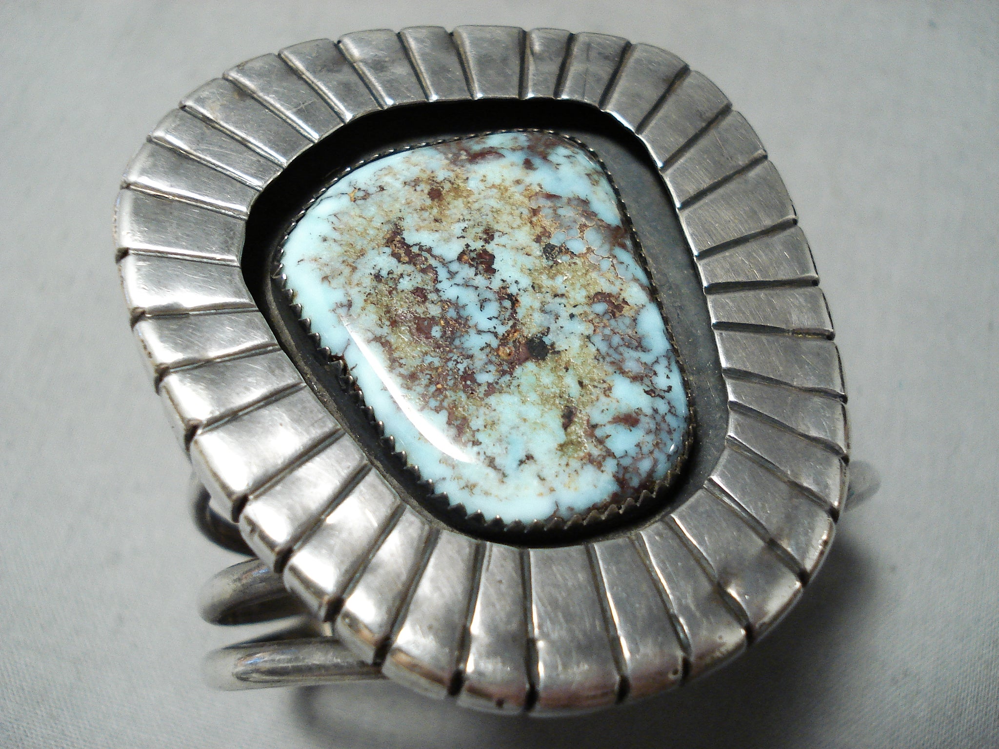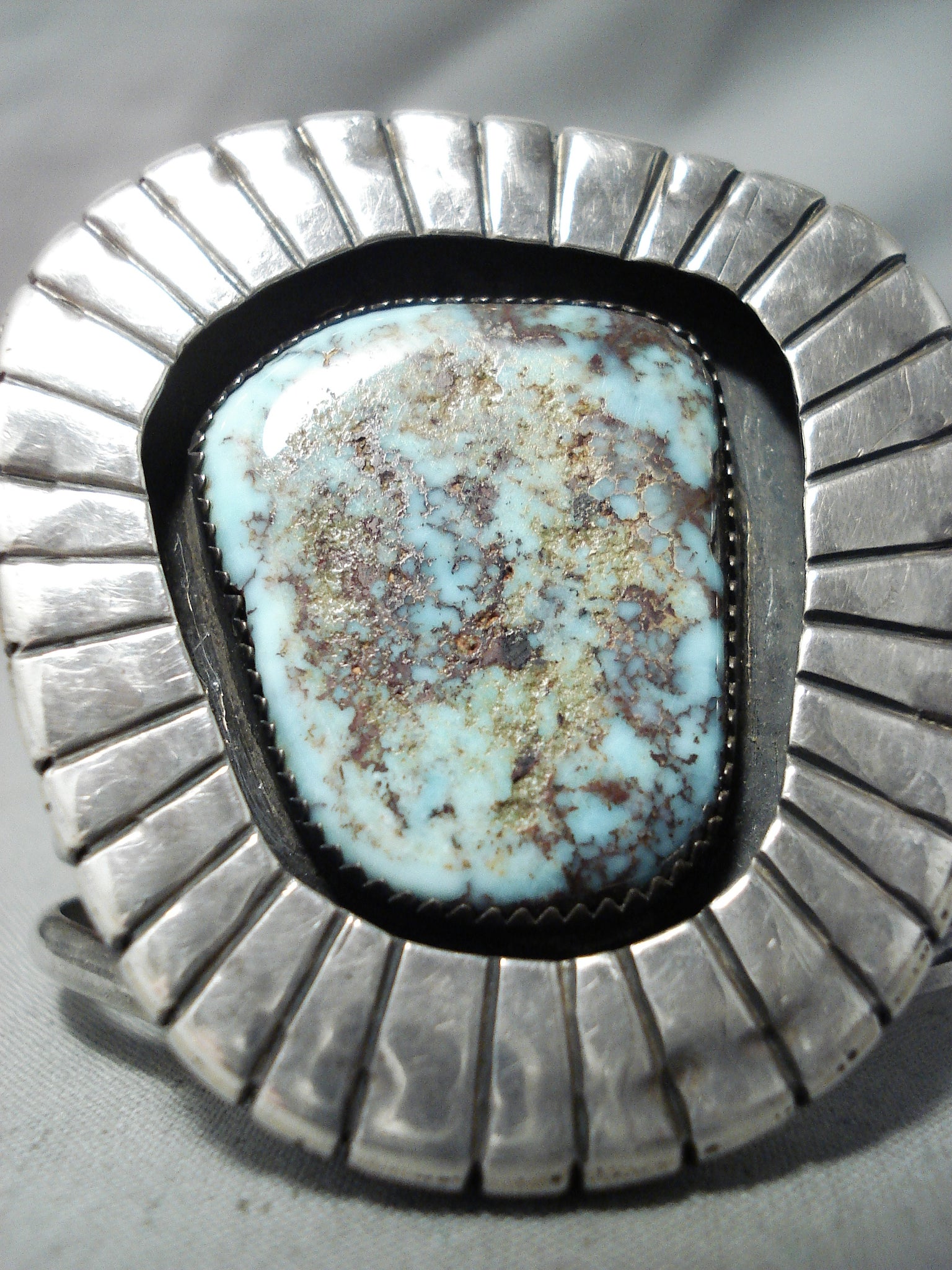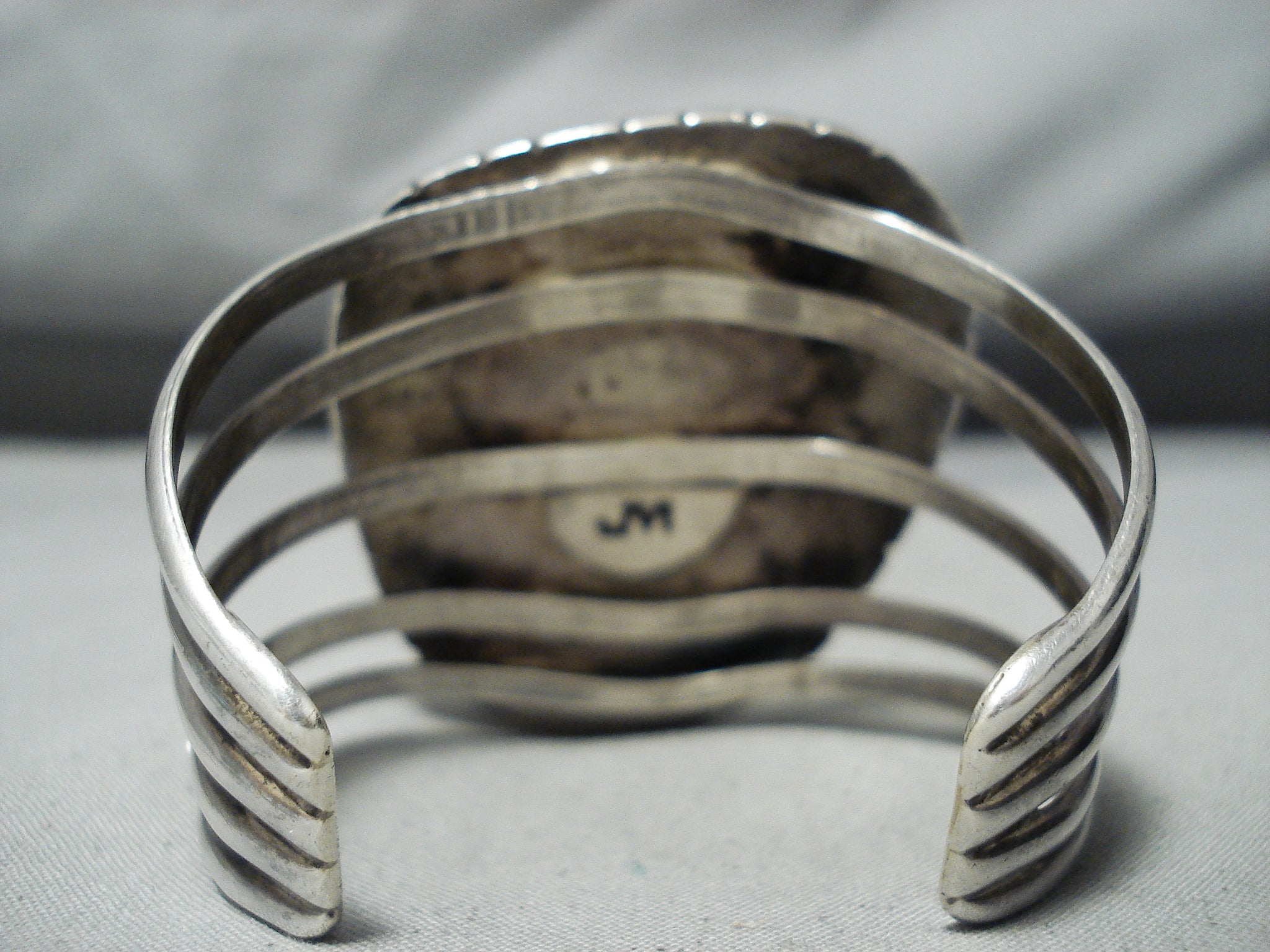 This is a magnificent vintage Navajo large single stone silver bracelet. This wonderful bracelet contains a stunning very rare Gilbert turquoise stone that is beautifully placed in a shadowbox setting. Surrounding the stone are phenomenal sun bursting patterns that go around the entire stone. This bracelet includes a wonderful five silver shank cuff. The center stone measures around 1-1/4" x 1". The width of the bracelet measures around 1-7/8". Signed by Navajo artist, Jimmy Martin. Sterling silver. Cir. 1970's+. The inside end to end measures around 5" with an additional 1-1/4" gap. Sturdy 71 grams.