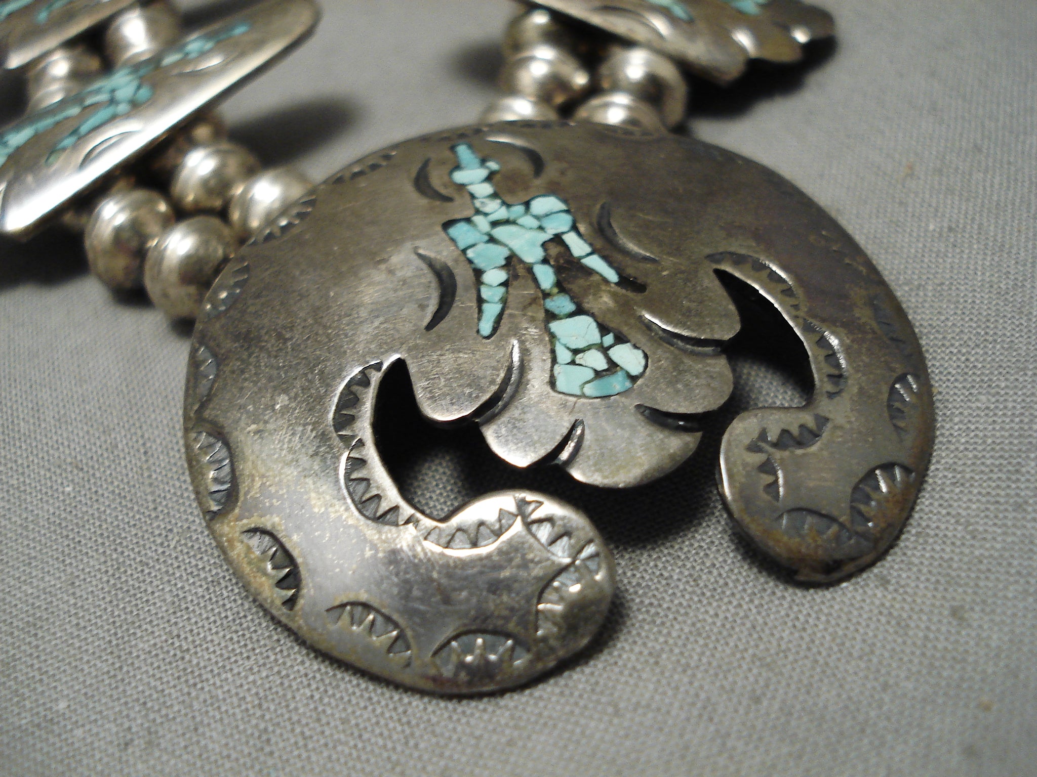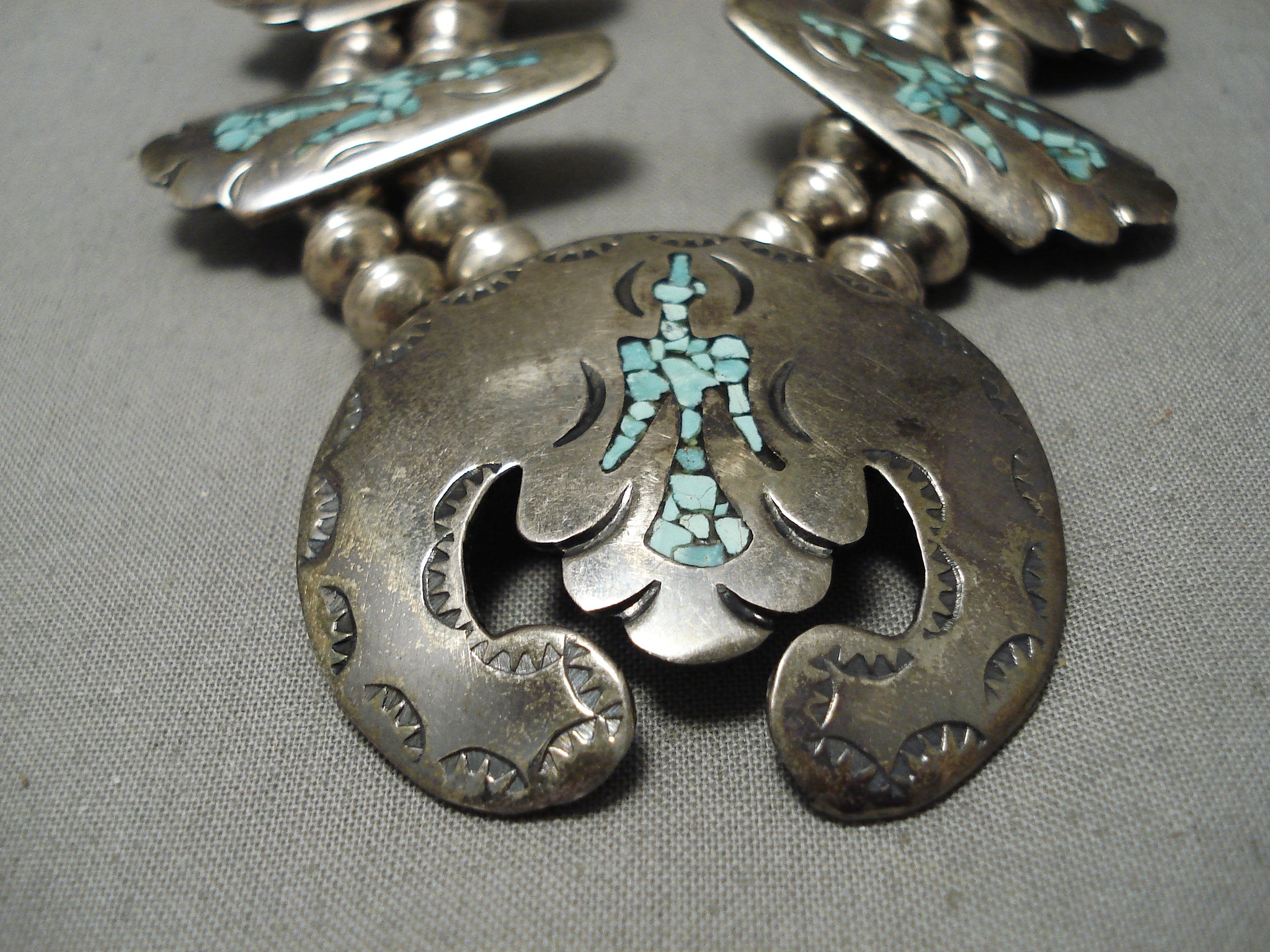 Rare Vintage Native American Navajo Green Turquoise Sterling Silver Squash Blossom Necklace