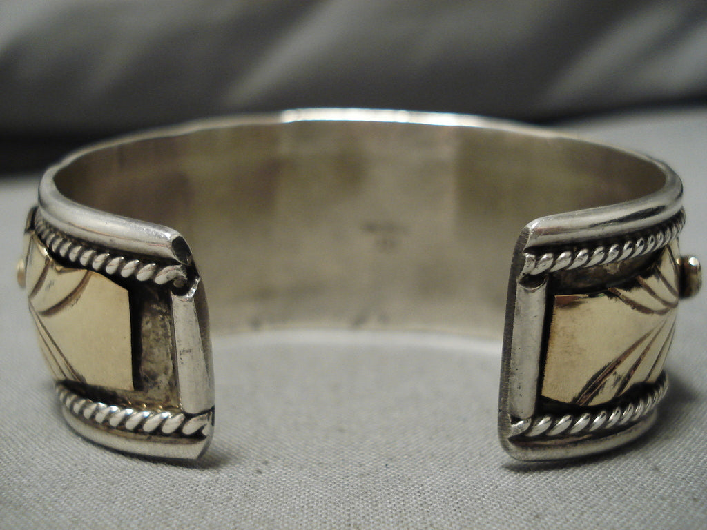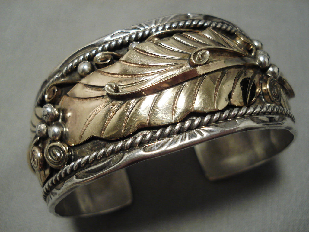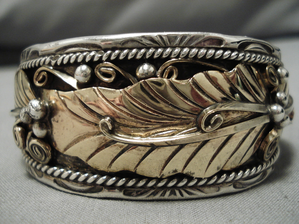 Rare Vintage Native American Navajo Herb Tsosie Gold Leaf Sterling Silver Bracelet Cuff Old
