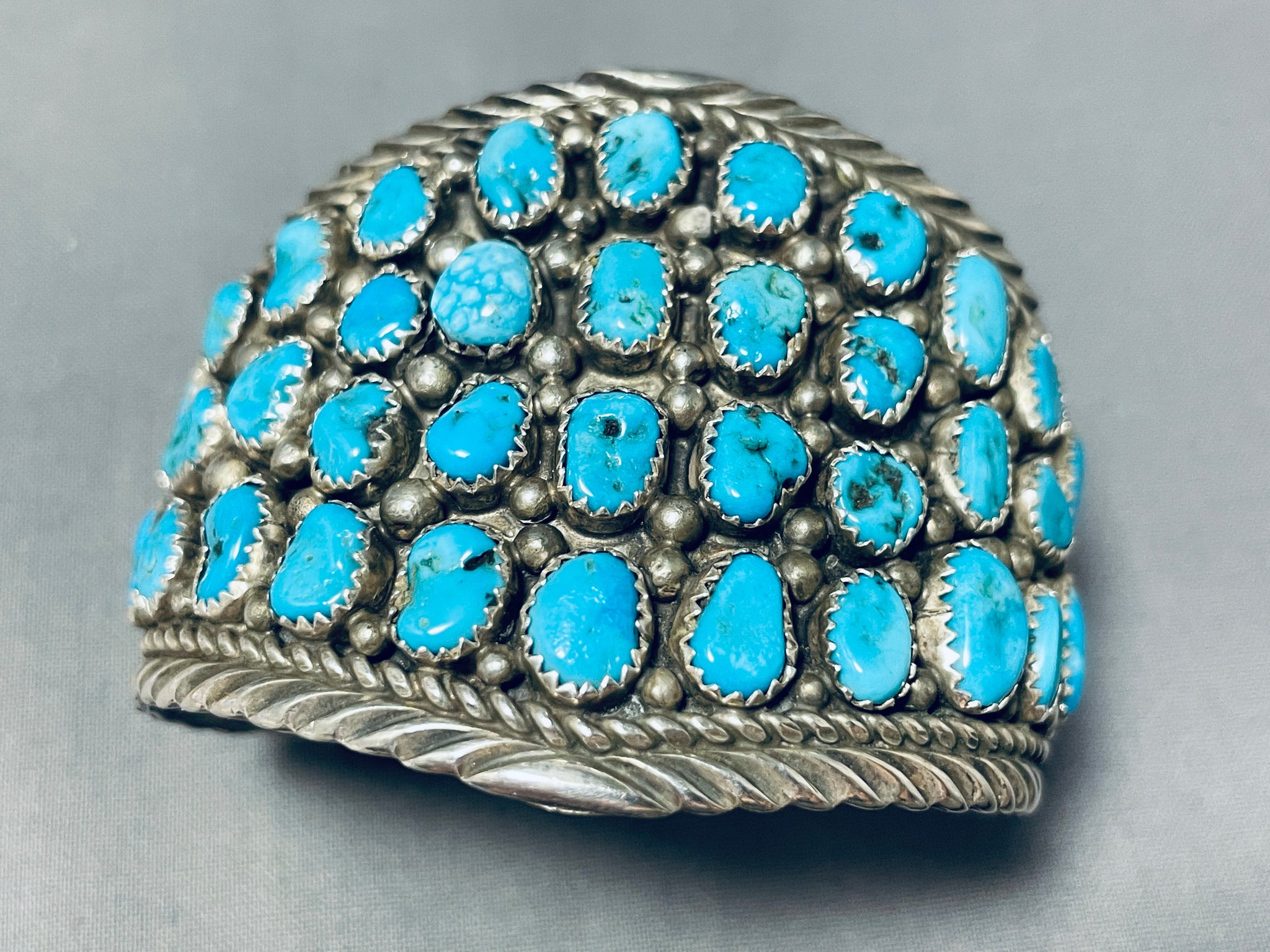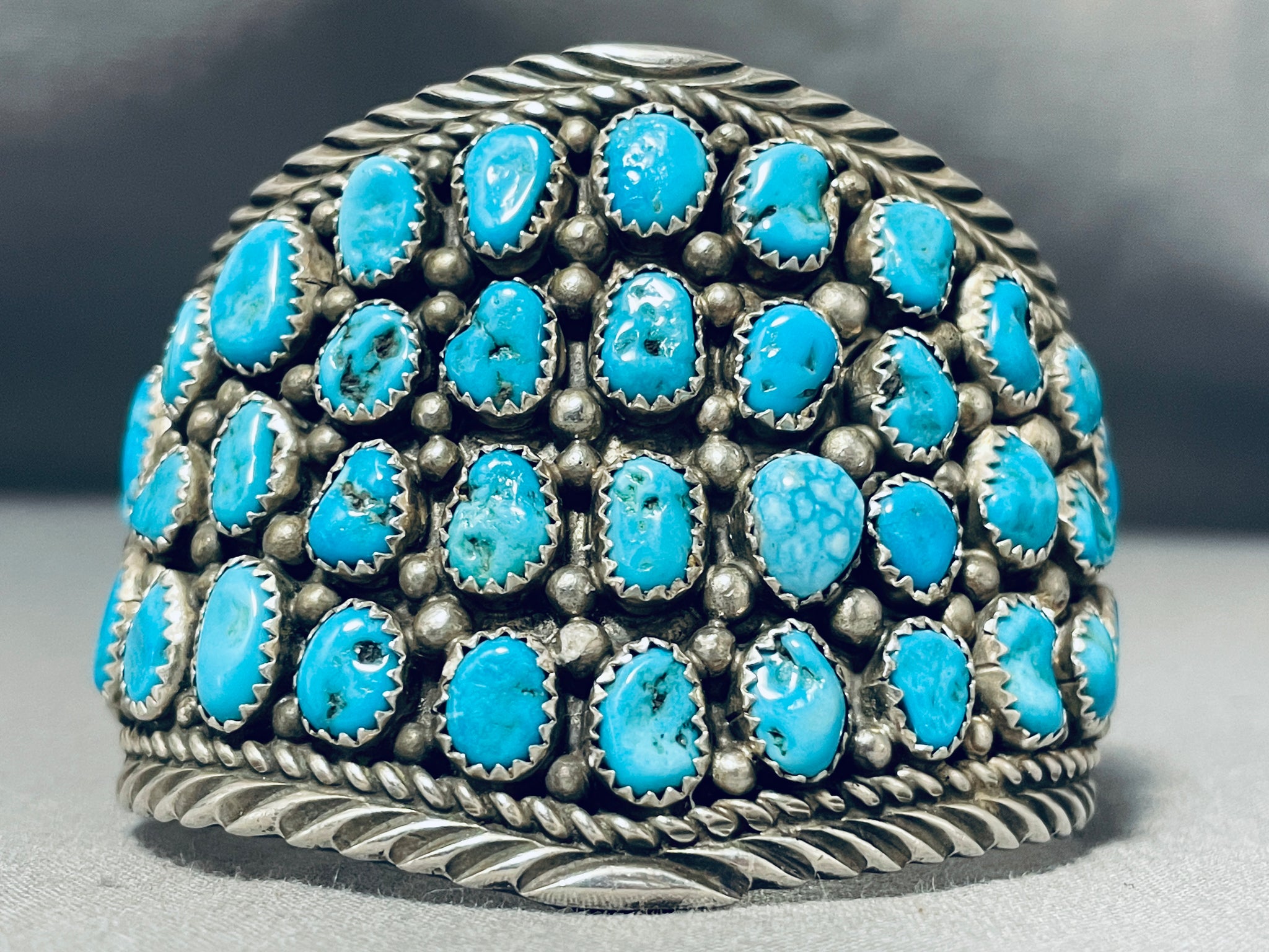 Rare Vintage Native American Navajo Kingman Turquoise Cluster Sterling Silver Huge Bracelet