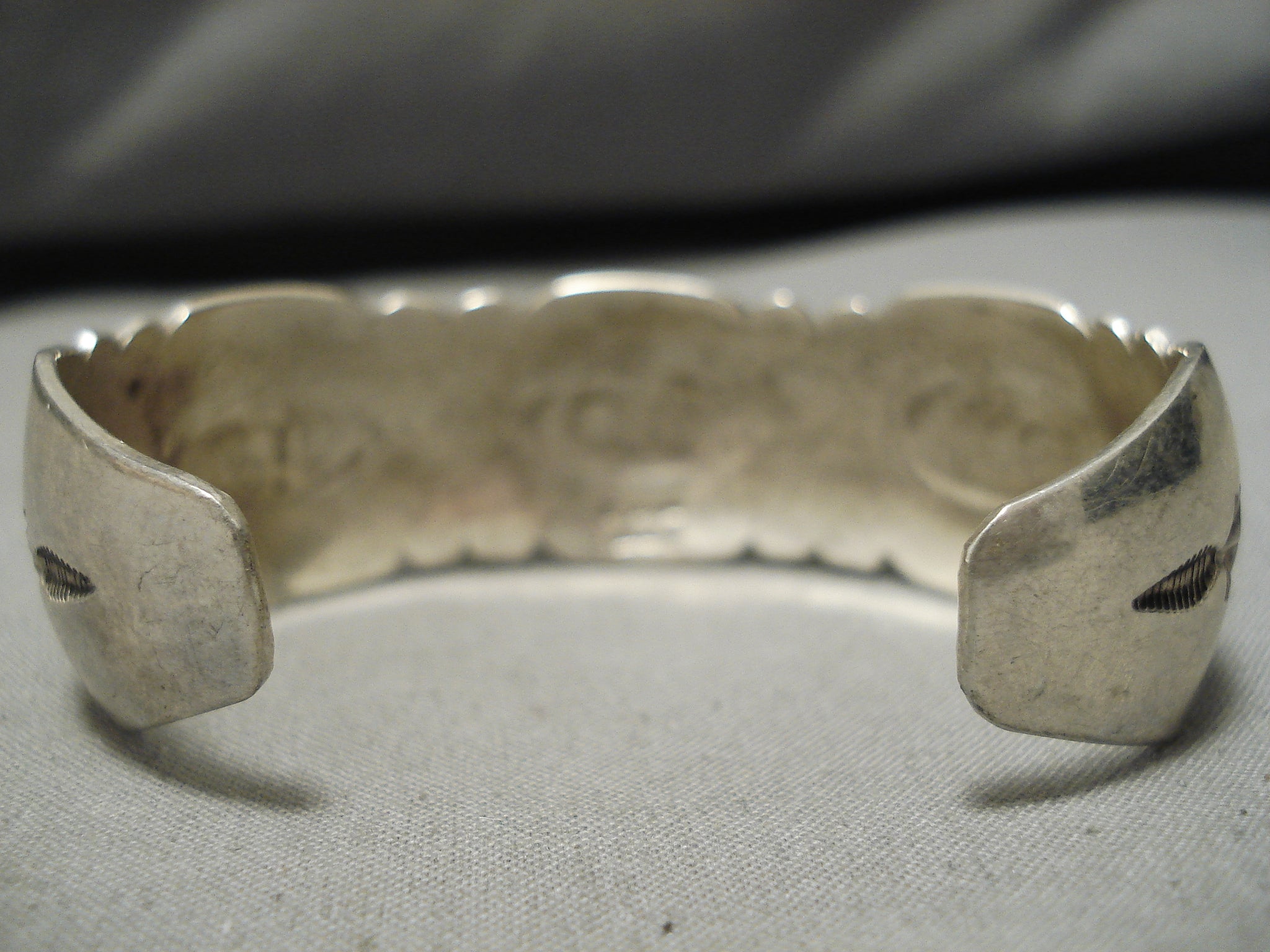 This is a fascinating Navajo turquoise silver bracelet. This piece contains two dome shaped sky blue turquoise stones. The entire bracelet appears to look like a concho piece. The bracelet consists of marvelous silver stampings. The stones measure around 3/8" x 1/4". The width of the bracelet measures around 3/4". Signed by Navajo artist, Eddie Yazzie . Sterling silver, marked. Cir. 1970's+. The inside end to end measures around 6" with an additional 1" gap. Sturdy 38 grams.