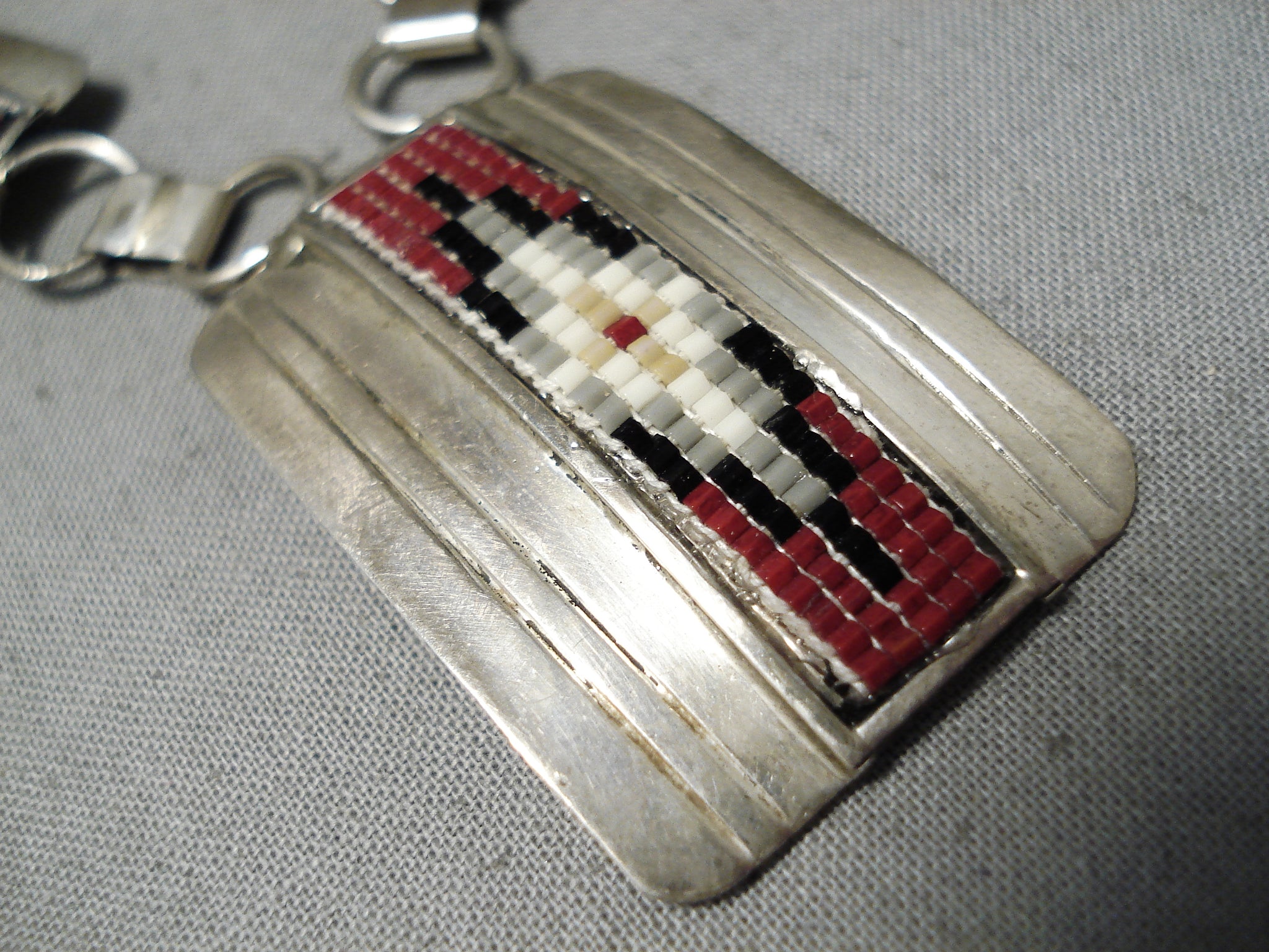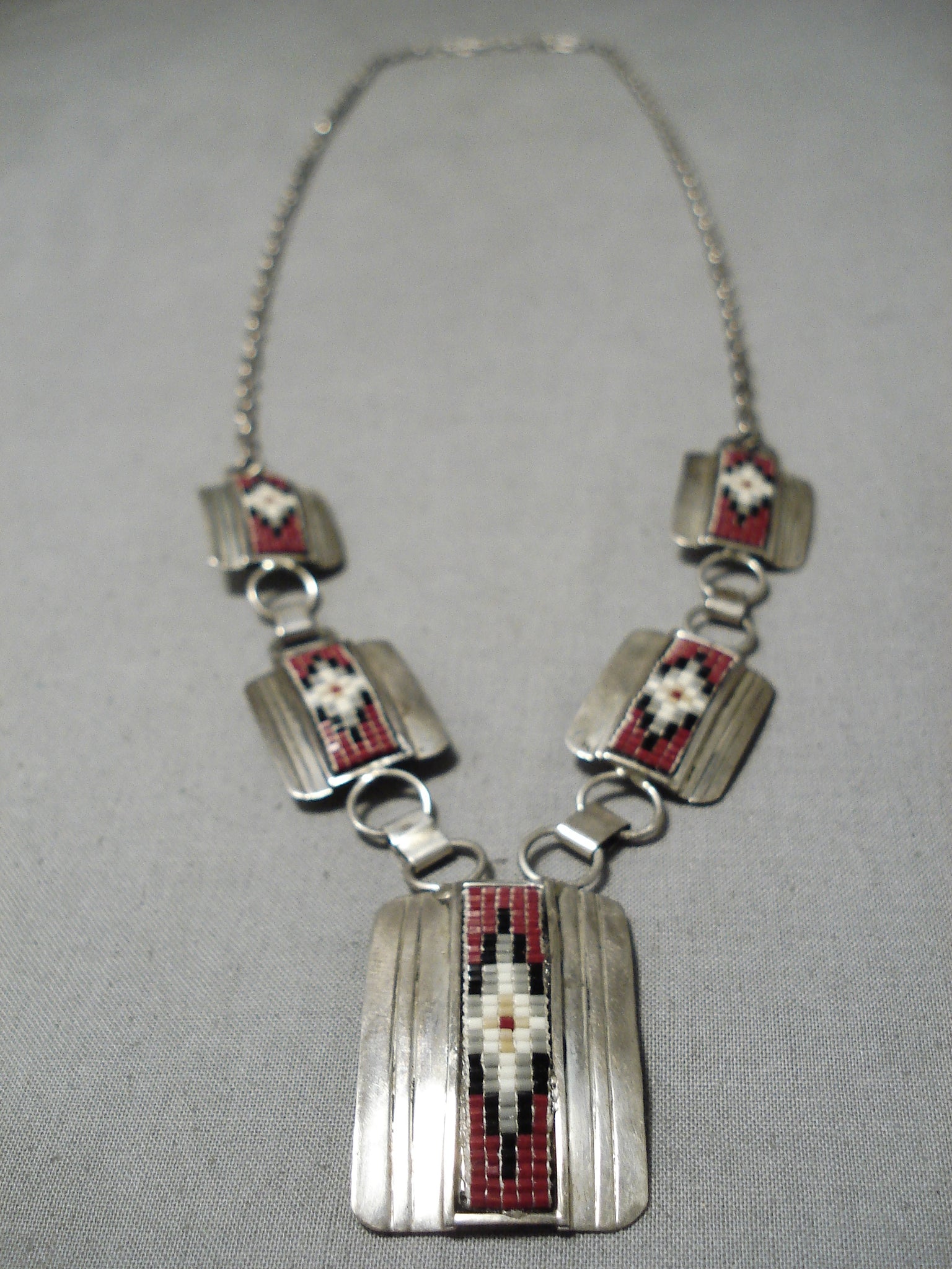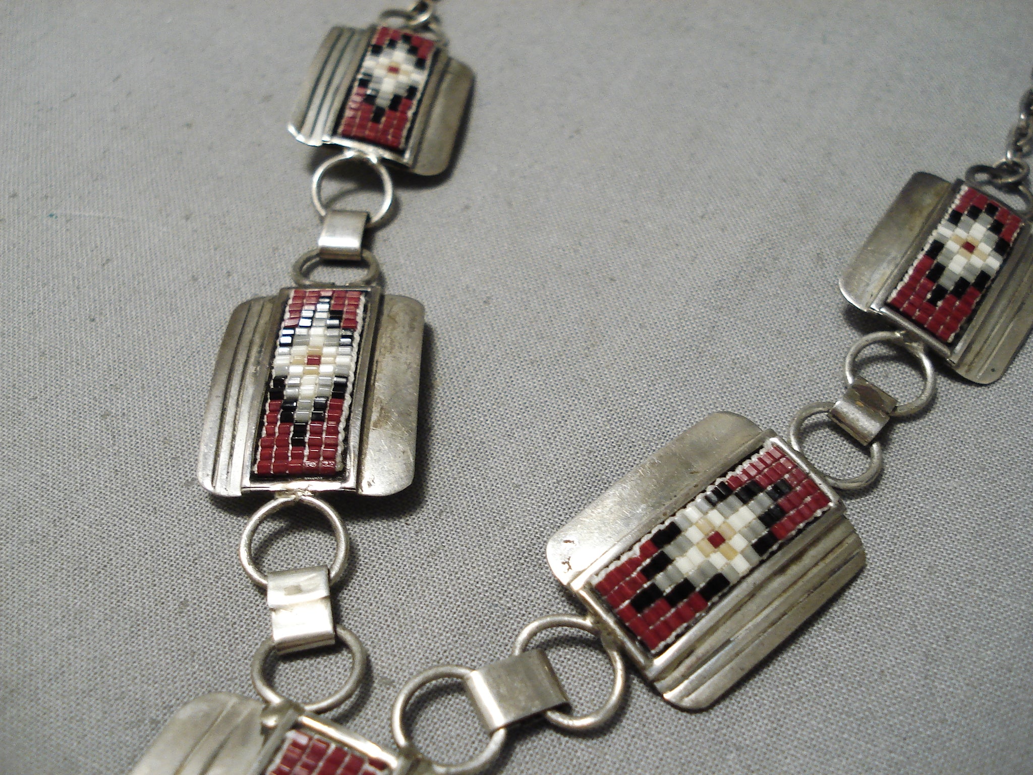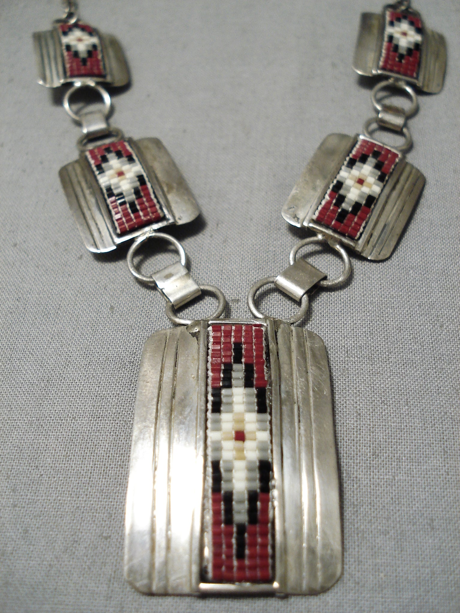 Rare Vintage Navajo Beaded Rug Sterling Silver Native American Necklace Old